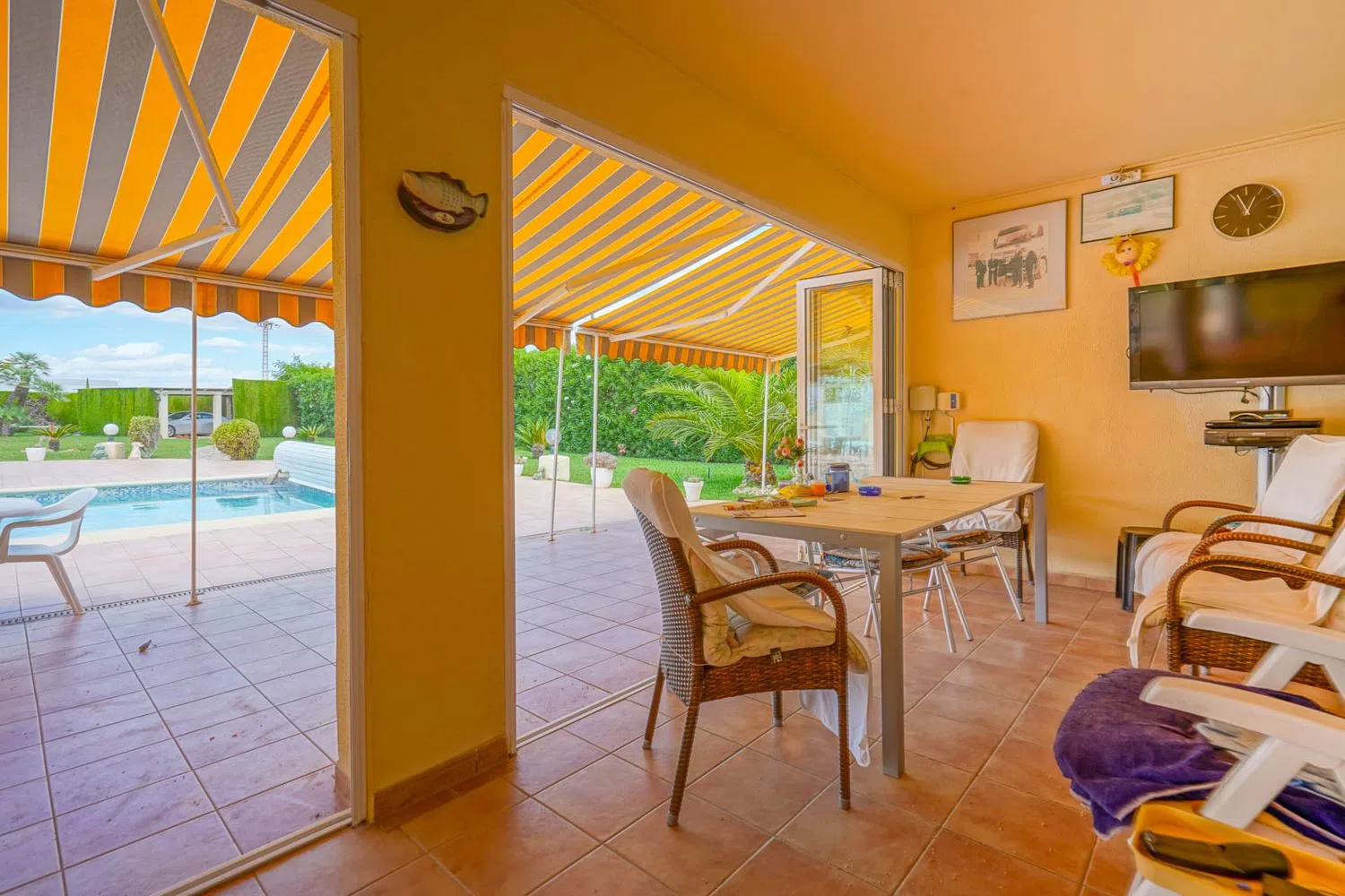 This villa is located on a flat, sunny plot of 2000 m², just a short distance from the village center and only one kilometer from the beach. The property comprises two interconnected houses, each with its own entrance. The main house features a spacious living-dining area, a kitchen, three double bedrooms, one bathroom, and an additional toilet. There is also a large covered terrace, which can be fully enclosed for comfort.