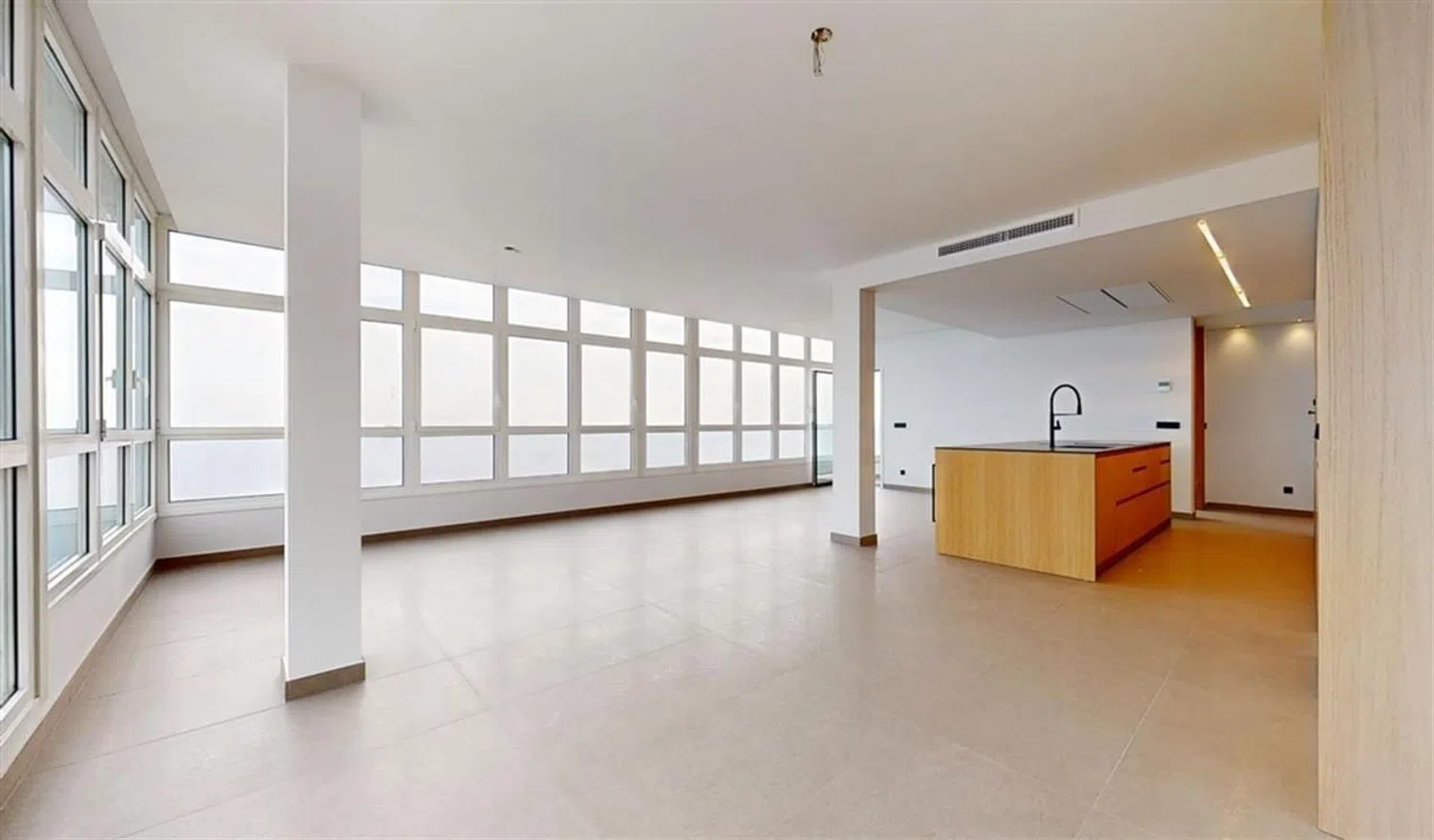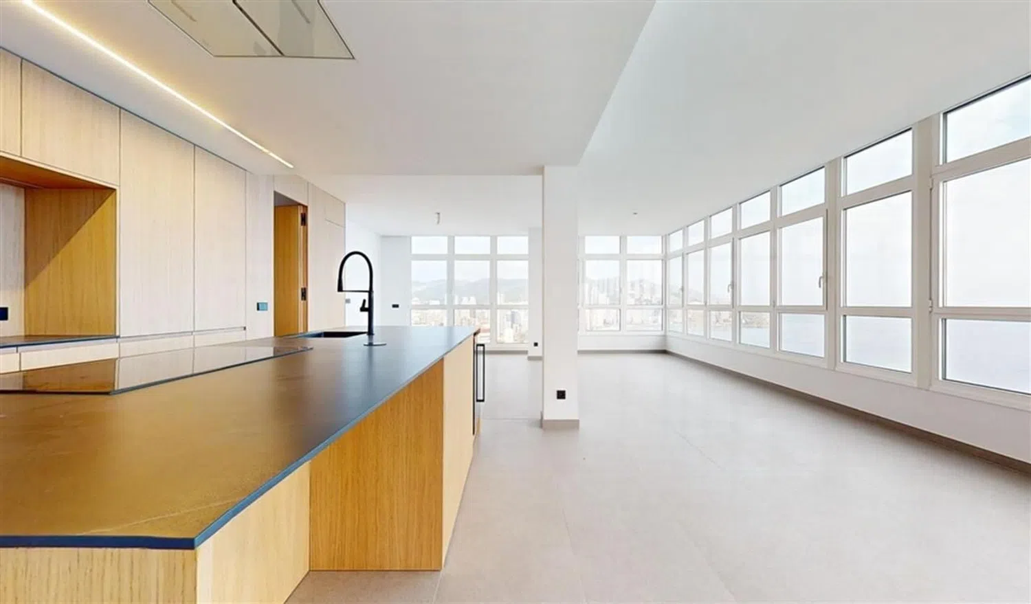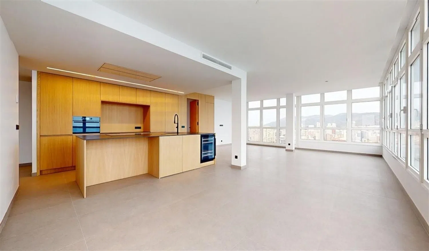 This property showcases high-end finishes, including ducted air conditioning for both cooling and heating. The kitchen is fully equipped with modern appliances and features high-quality materials such as solid wood interior carpentry, white lacquered finishes, reinforced glass exteriors, and double-glazing to provide excellent thermal and acoustic insulation. The flooring consists of ceramic and porcelain tiles, while the walls are smooth, featuring numerous integrated storage solutions. The bathrooms include wall-mounted sanitary fittings and quartz countertops, complemented by LED lighting and a secure entry door.