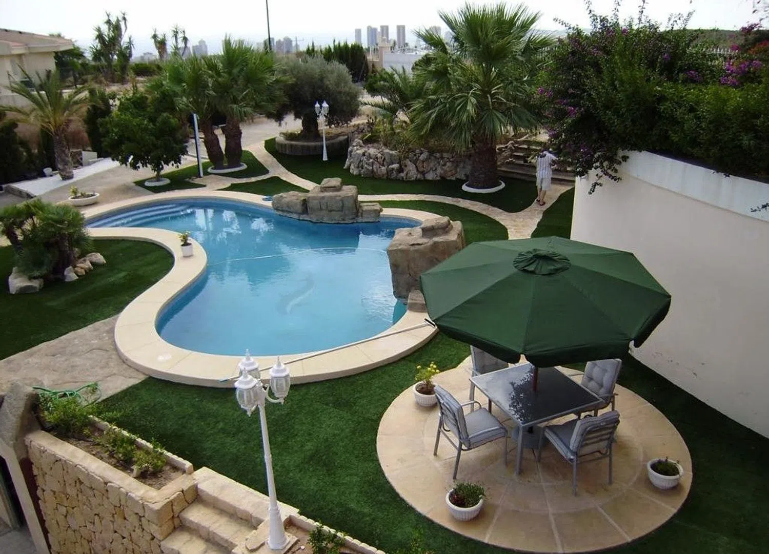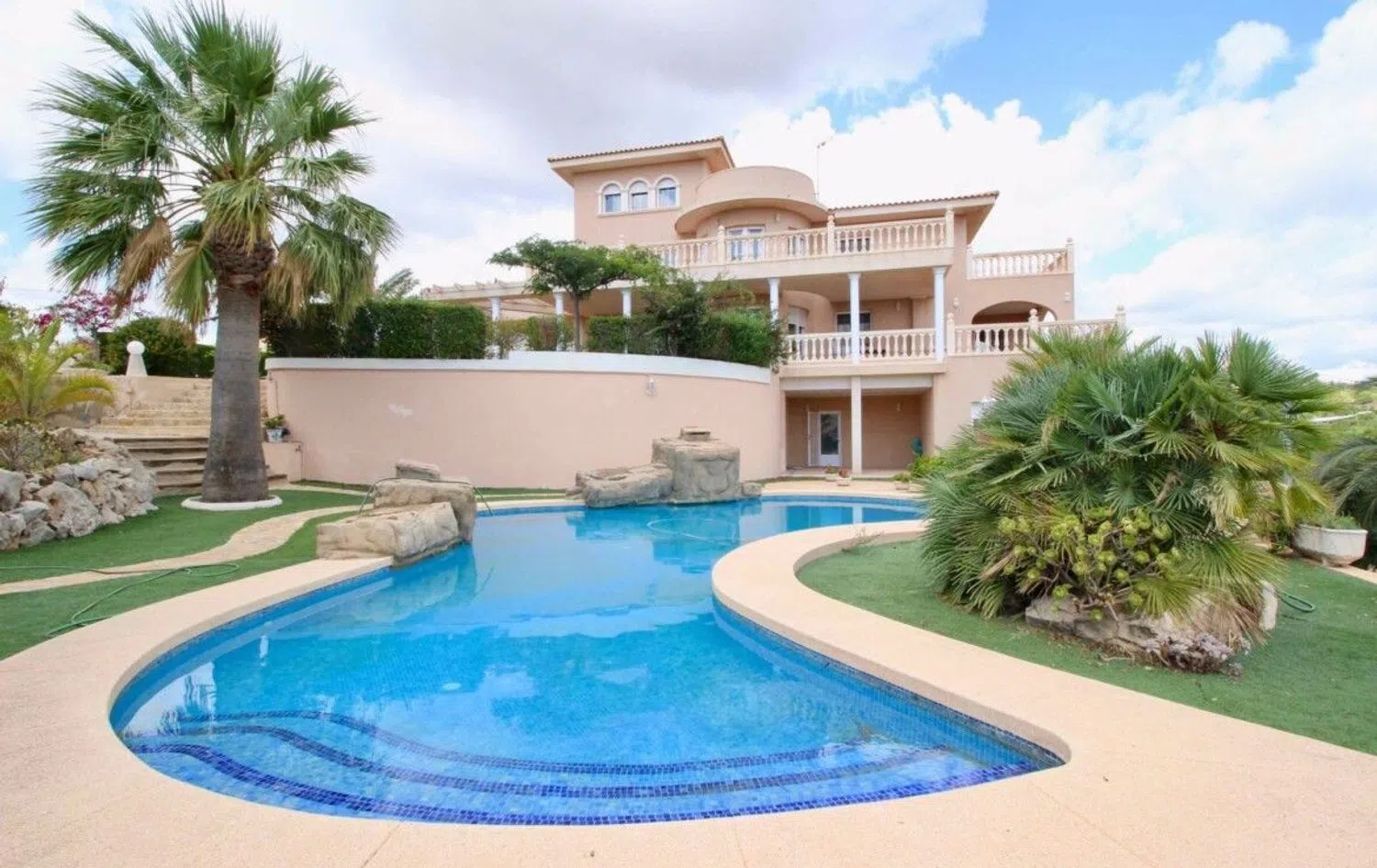 The property is enveloped by beautifully landscaped gardens and features a lovely swimming pool with a waterfall, surrounded by lush vegetation. A variety of fruit trees can be found on the multiple terraces, all equipped with an automated irrigation system. Additionally, there is a garage that accommodates at least four vehicles, supplemented by utility rooms and storage space.