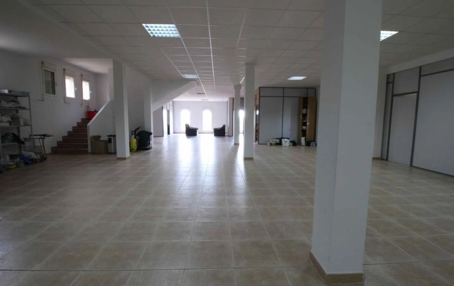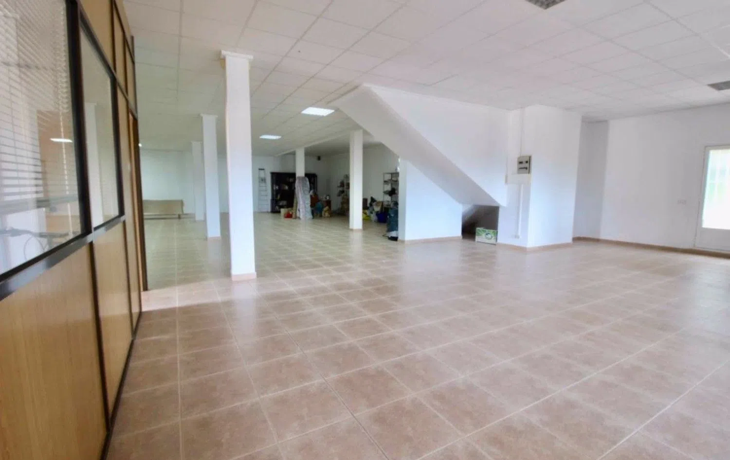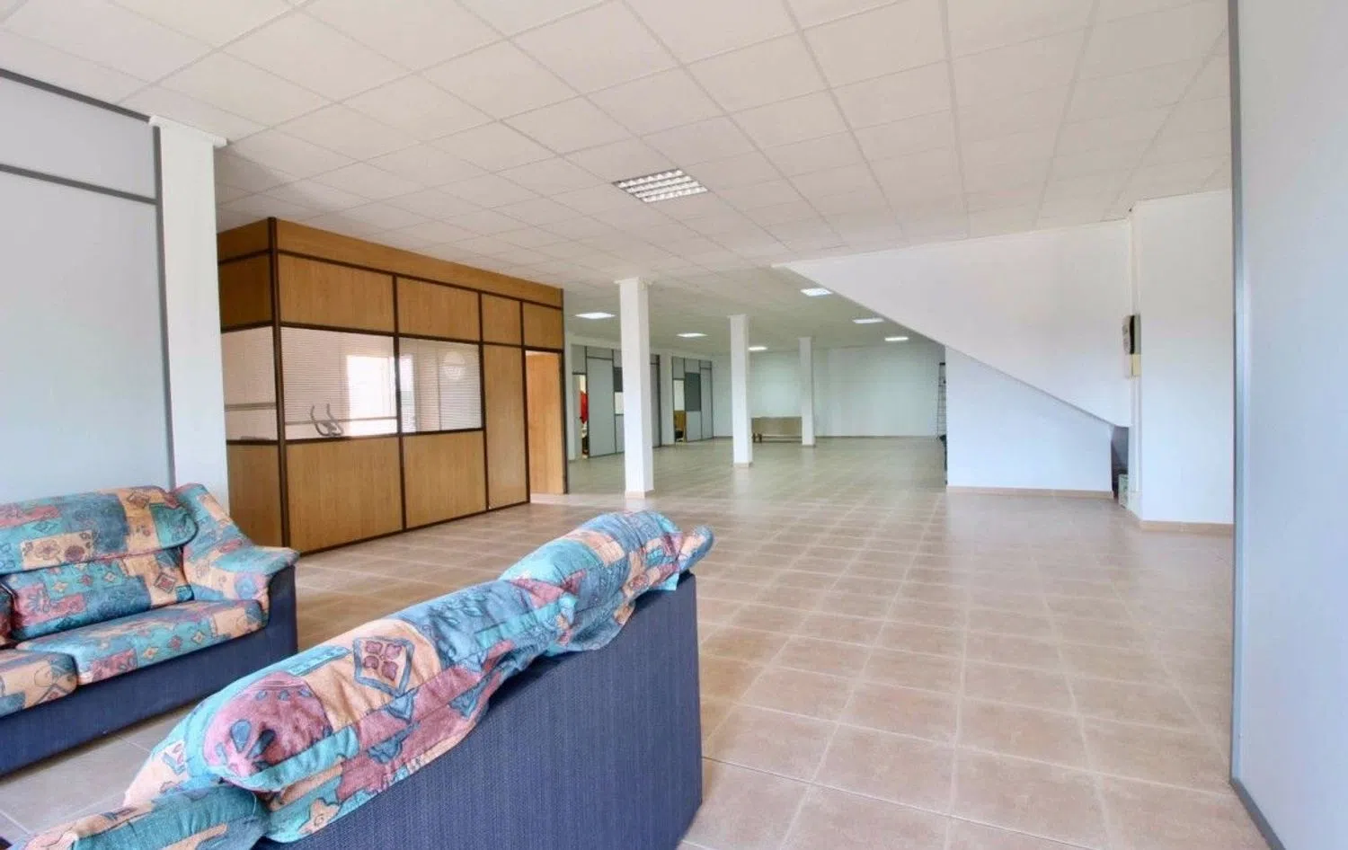 A separate, expansive ground-level area of 350m², accessible via both internal and external staircases, features approximately eight office spaces with street-facing access. This setup allows for the possibility of creating an independent living space or apartment with a separate entrance.