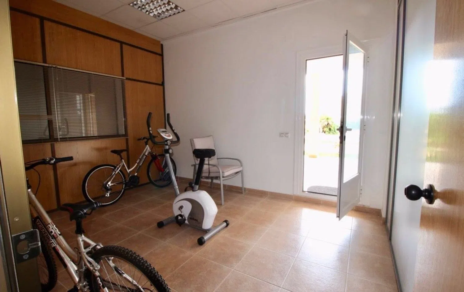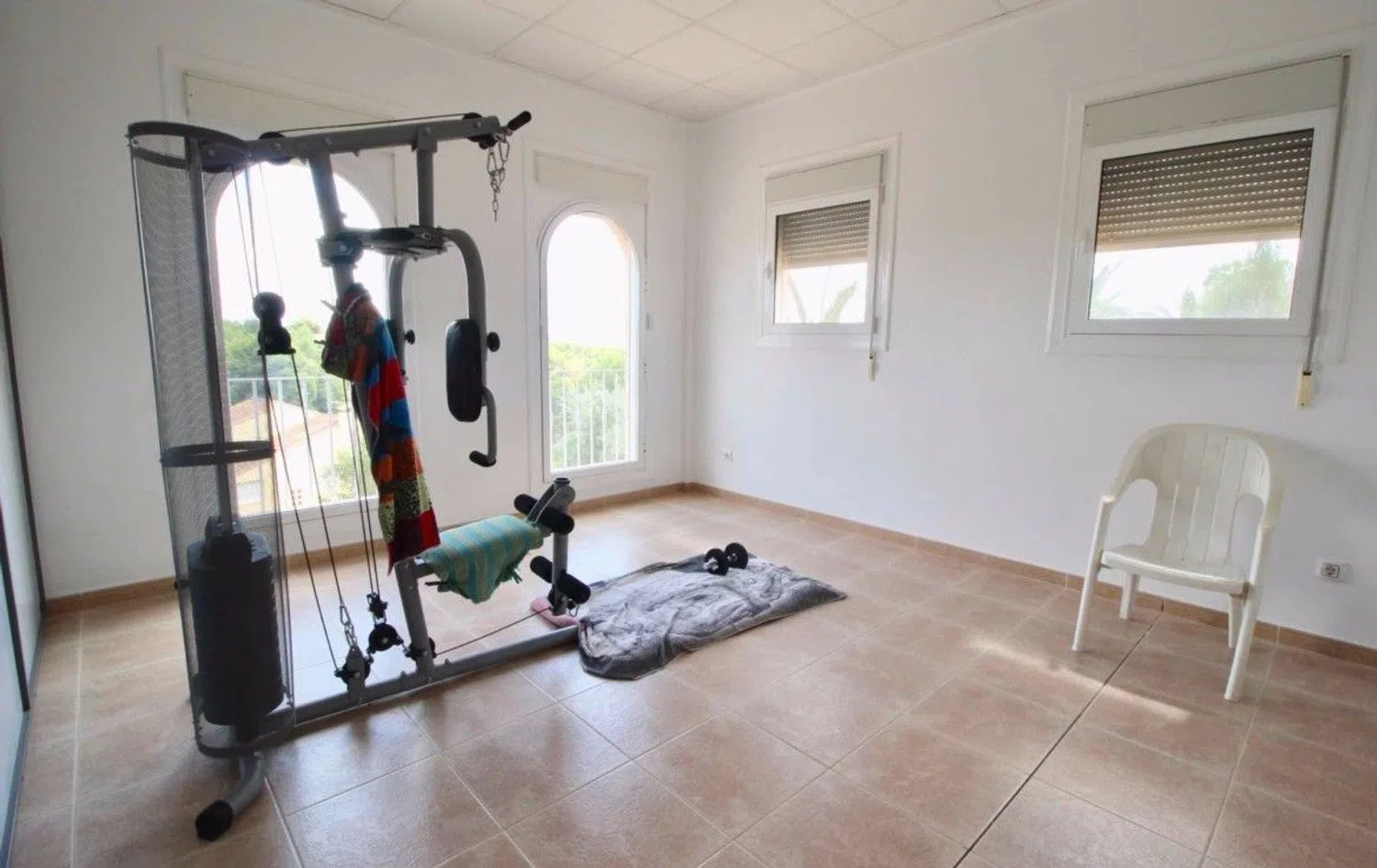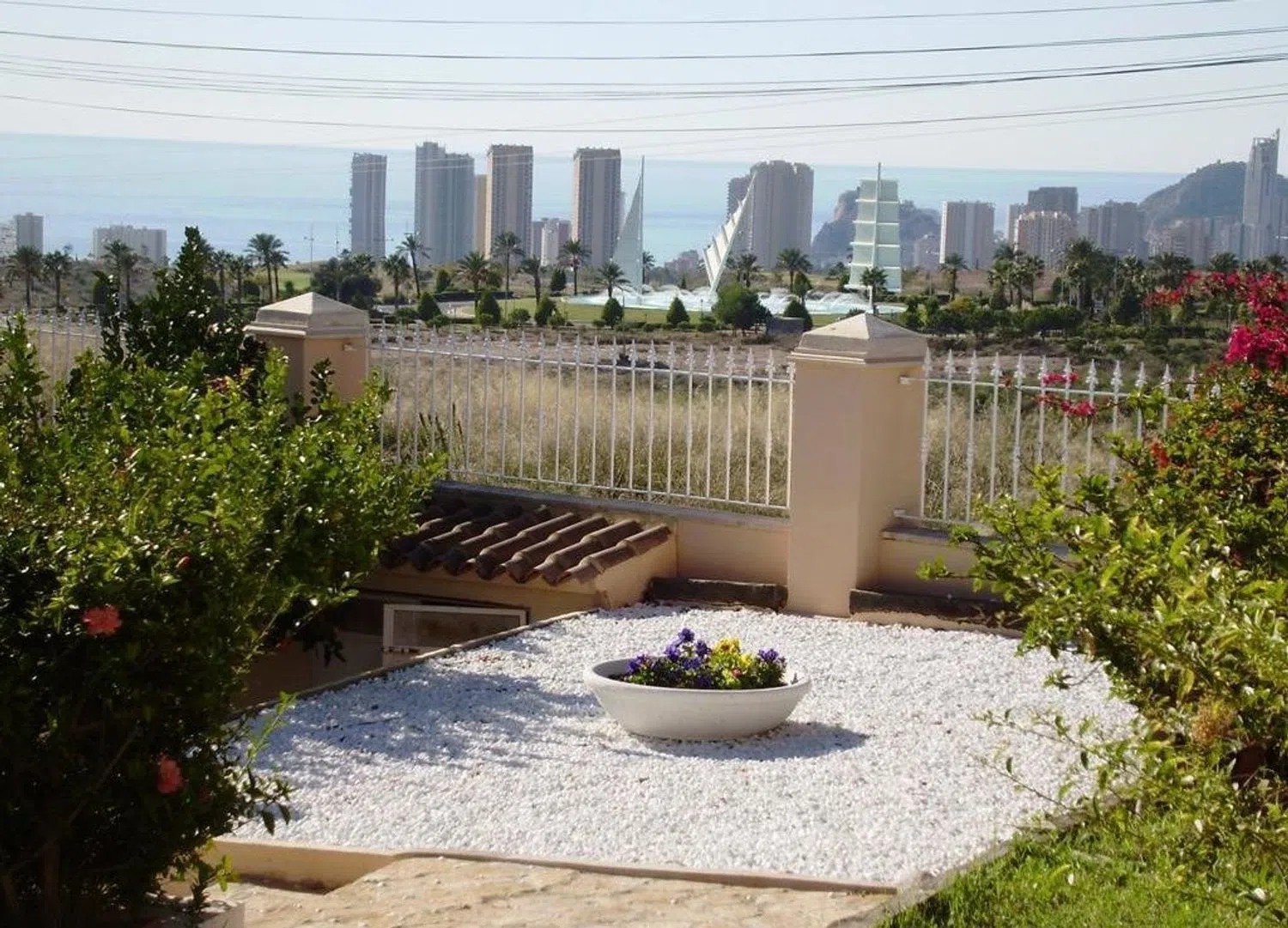 The ground floor also includes a generous office space and four well-appointed bedrooms, all equipped with built-in wardrobes, one of which enjoys access to a terrace with breathtaking views of the sea, mountains, and theme parks. The second floor is home to a loft area, characterized by large windows and access to a solarium terrace, showcasing stunning scenic vistas.
