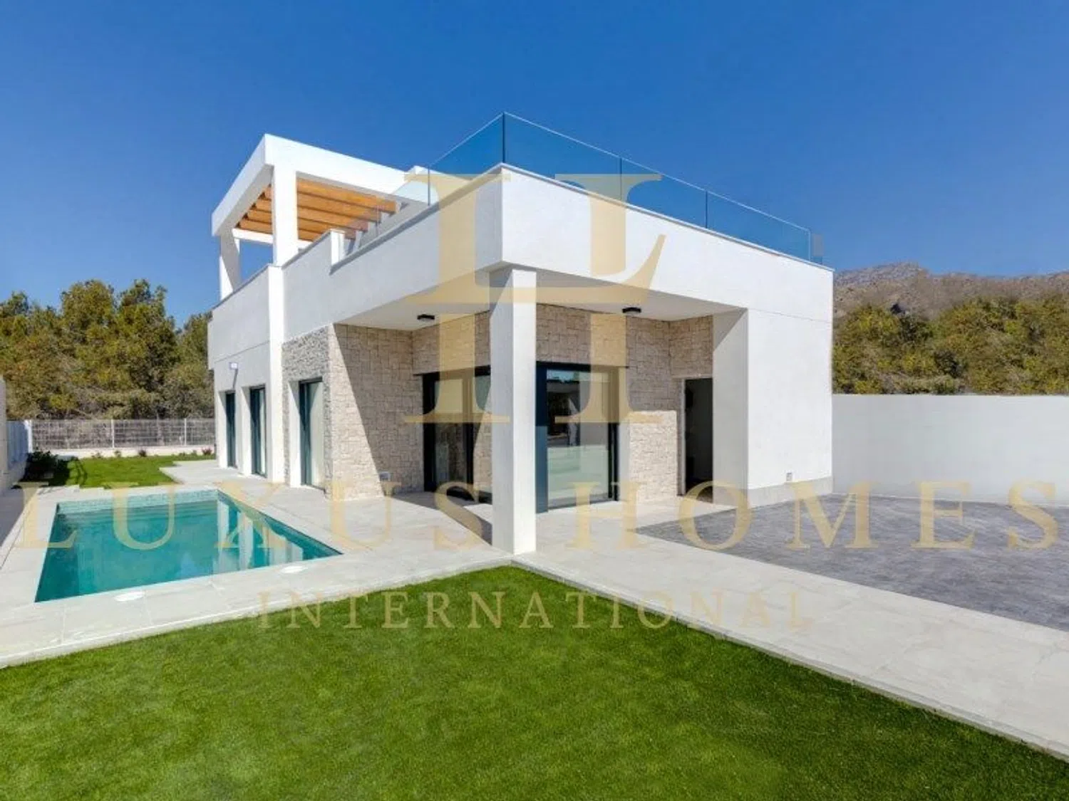 Additionally, these single-level homes provide direct access to the garden and pool area, enhancing the outdoor living experience. Each villa consists of three bedrooms and two bathrooms and boasts a rooftop terrace of over 100 square meters, complete with a kitchen, barbecue, shower, and a chill-out zone offering magnificent views. Every property comes with a beautifully landscaped garden, featuring a private pool, lush grass, and an efficient irrigation system.