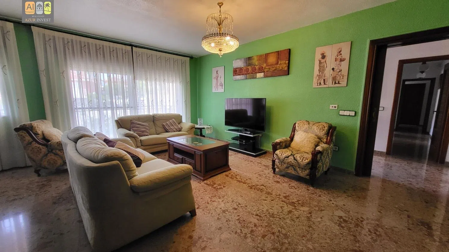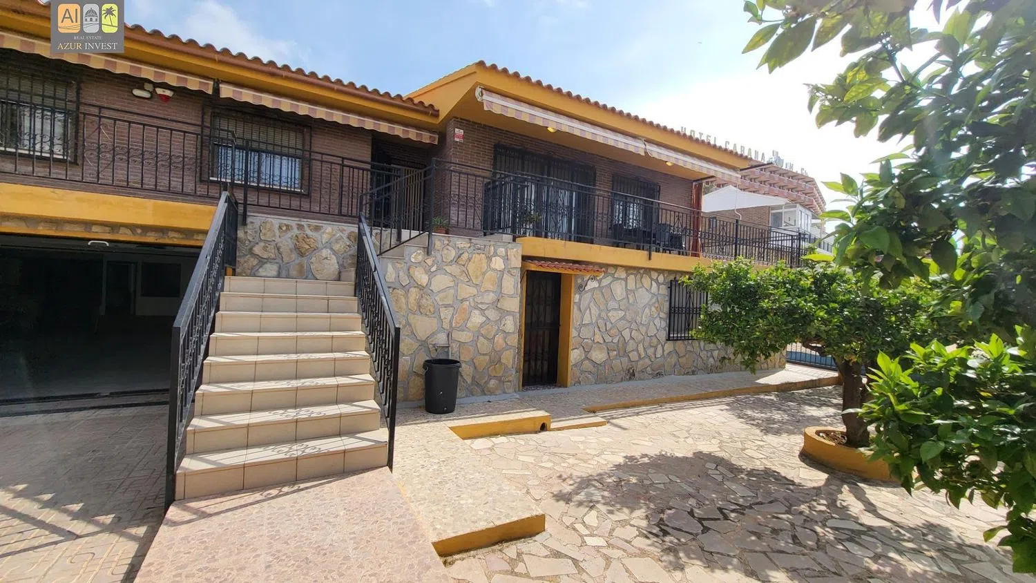 The lower floor includes useful amenities such as a storage room, an office, and a spacious closed garage accommodating three vehicles, in addition to a self-contained apartment featuring its own entrance. This apartment comprises two bedrooms, a bathroom, a separate kitchen, and a comfortable living area.