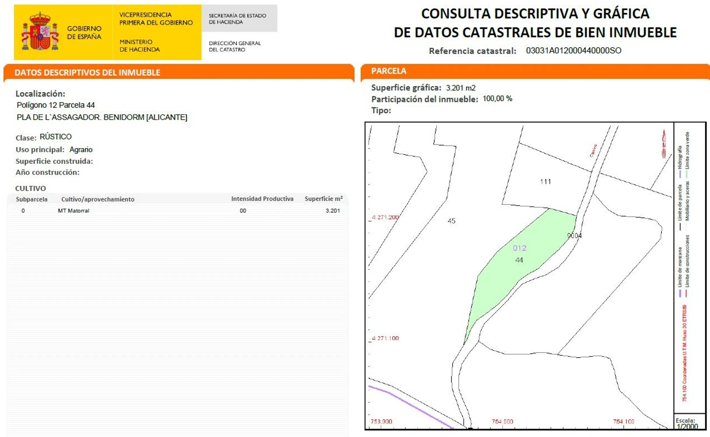 Referencia catastral03031A01200044 y parte de 03031A01200045 LocalizaciónPolígono 12 Parcela 44 y parte de la parcela 45 PLA DE L`ASSAGADOR. BENIDORM (ALICANTE) Clase: Rústico.