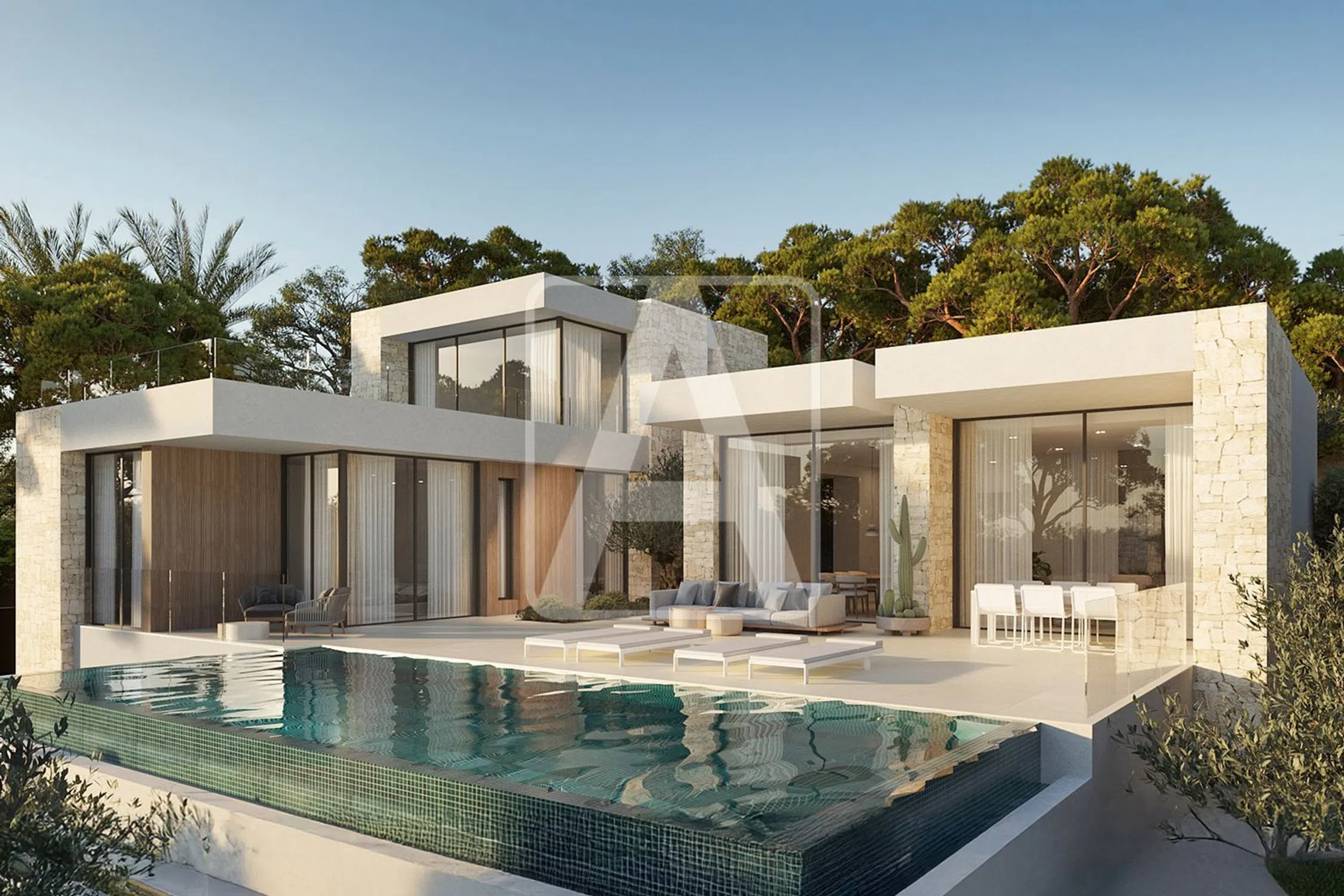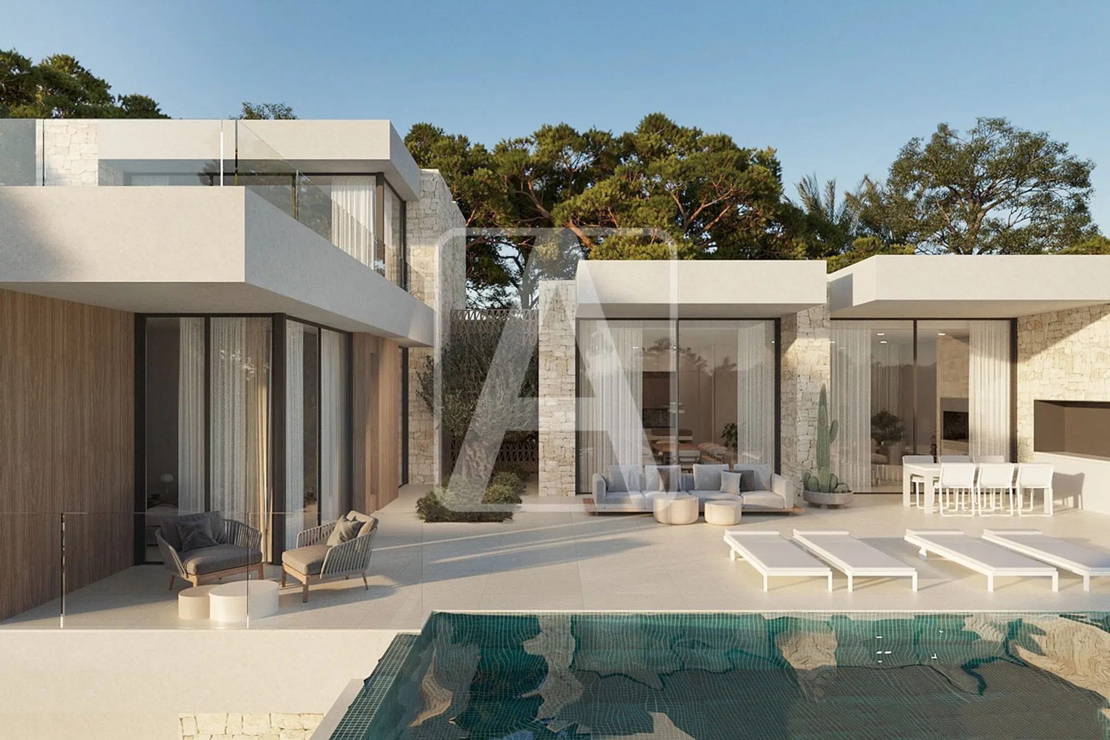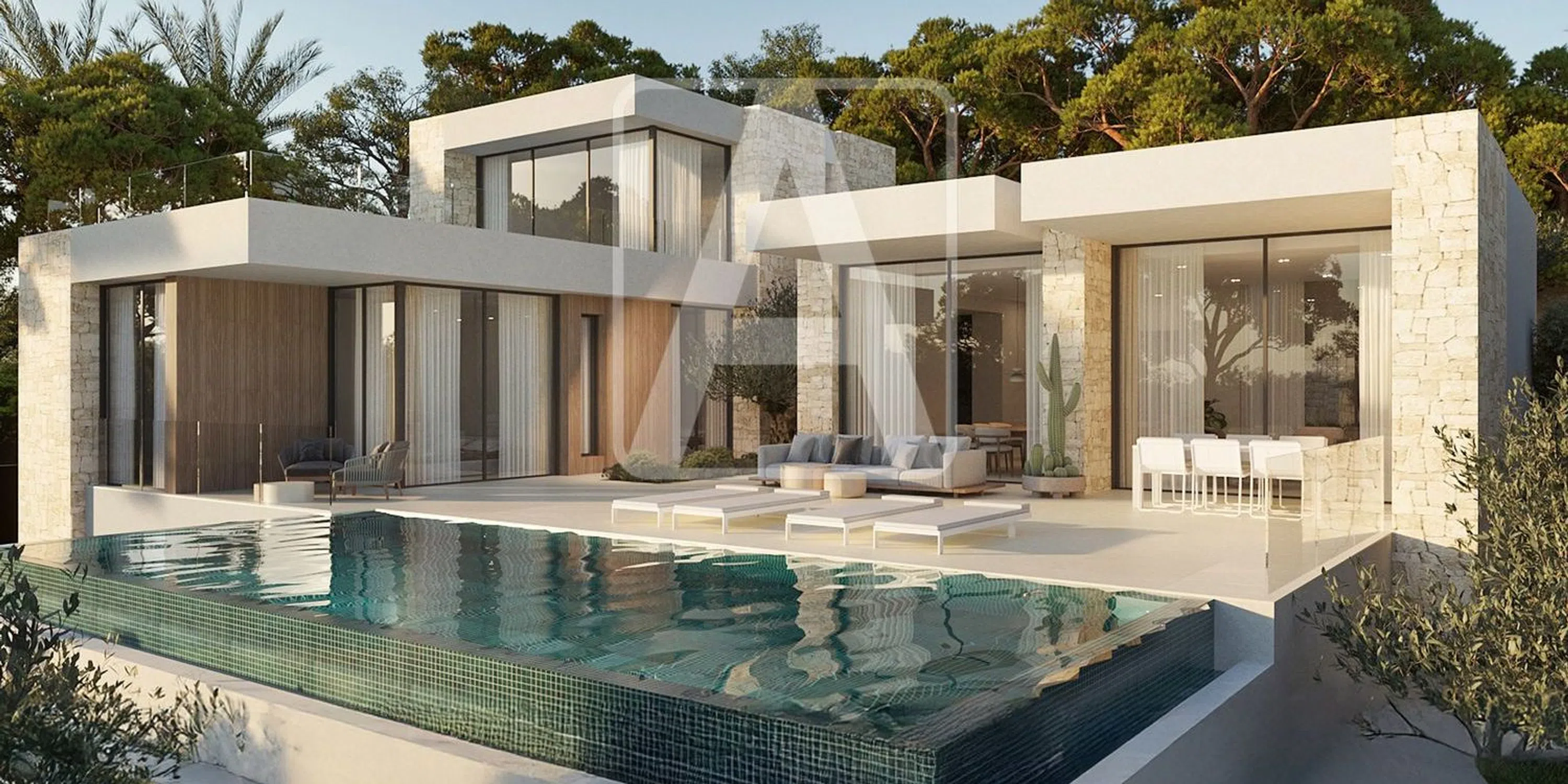 Villa de nueva construcción en venta en Benissa en la exclusiva Urbanización San Jaime (junto a Moraira), situada en una zona residencial consolidada a poca distancia del campo de Golf de San Jaime, a 2,1 Km de centro comercial Pepe La Sal, a 2,4 Km de Cala Baladrar (Benissa), a 2,5 Km de Playa Andragó (Moraira), a 3,2 Km de Cala Advocat (Benissa) y a 4 Km del centro urbano de Moraira que ofrece todo tipo de servicios, magnífico Club Náutico y estupenda playa de arena. Esta villa de lujo disfruta de estupendas vistas al mar y puestas de sol (orientación Suroeste) y de mucha tranquilidad y privacidad (calle sin salida). Está ubicada en una parcela de 1.020 m2 y tiene una superficie total construida de 350 m2 (+ 400 m2 de elementos auxiliares), que se distribuyen en tres elegantes niveles, con un equilibrio perfecto entre estilo, comodidad y funcionalidad, de la siguiente manera: en la planta principal tenemos el amplio hall de entrada, 3 dormitorios (uno de ellos diseñado como zona de oficina o trabajo), 2 baños en suite, 1 aseo de cortesía, magnífico salón comedor cocina (concepto todo abierto, muy espacioso, con isla) y estupendo porche de 30 m2 con barbacoa integrada que conecta con una amplia terraza exterior de 80 m2 donde tenemos una piscina de 40 m2 de forma rectangular con efecto sin fin. Se accede a la planta alta y a la planta sótano a través de una bonita escalera interior. En la planta alta tenemos 1 dormitorio principal con baño en suite con bañera flotante y terraza panorámica privada de 45 m2. En la planta sótano tenemos un amplio vestíbulo con armarios empotrados, lavadero, amplio trastero (posible dormitorio auxiliar) y garaje de 32 m2. Esta villa de diseño vanguardista destaca por sus grandes ventanales, por su luminosidad y por sus calidades y acabados, destacando en la fachada sus detalles en piedra natural trabajada de manera artesanal. Está equipada con suelo radiante y climatización por conductos (sistema aerotermia, mínimo consumo, máxima eficiencia), carpintería exterior de alta gama con cristales inteligentes, cocina de diseño moderno totalmente equipada, baños de diseño, barandillas en cristal, suelos porcelánicos, alarma… Disfruta de amplia zona de aparcamiento exterior ubicada estratégicamente junto a la entrada principal de la propiedad. Esto es más que una simple casa, es un remanso de paz que combina la arquitectura moderna con el encanto atemporal de la Costa Blanca. Para recibir más información sobre esta propiedad, póngase en contacto con AREA Costa Blanca. AREA Costa Blanca - su agente para propiedades en venta en Benissa - Costa Blanca - España. AREA Costa Blanca está orgullosa de ser una de las mejores agencias inmobiliarias en la Costa Blanca. En AREA Costa Blanca trabajamos para ofrecer el mejor servicio asesorando a nuestros clientes en la compraventa de propiedades inmobiliarias. Contamos con un equipo profesional de larga experiencia en el sector inmobiliario. Nuestro principio fundamental es la calidad del servicio prestado y la satisfacción del cliente. Nuestra experiencia y actitud, su garantía de éxito.
