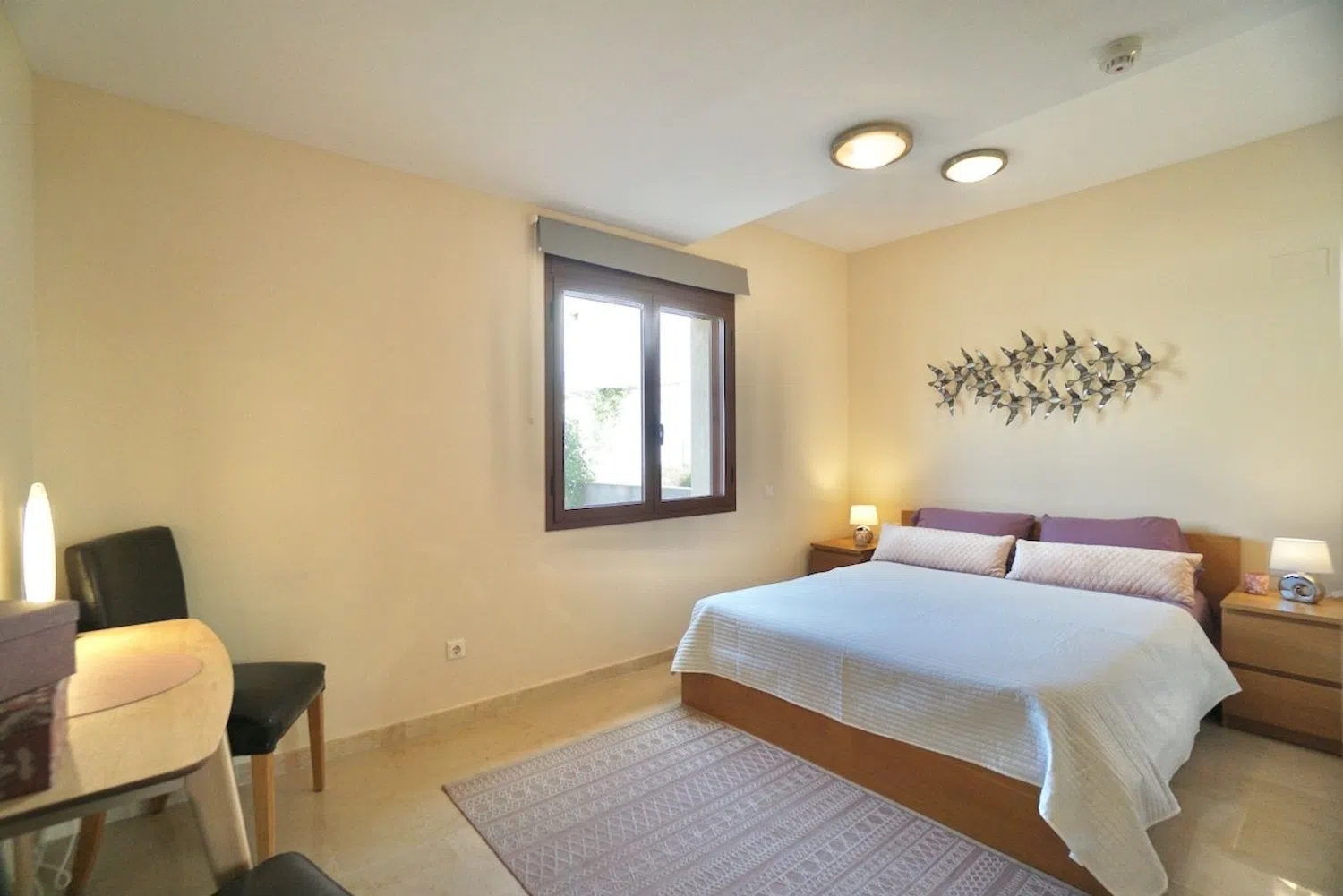Inside, the open-concept living area flows seamlessly into the kitchen, which comes equipped with all modern conveniences, including appliances that are hardly a few years old. Additionally, this floor features a guest bedroom with ample built-in wardrobes and a guest bathroom equipped with a bathtub. The master bedroom boasts a walk-in closet and an en-suite bathroom complete with a shower. A staircase from the living room leads to a third bedroom, which has been fitted with a split air conditioning unit and includes access to a highly private solarium.