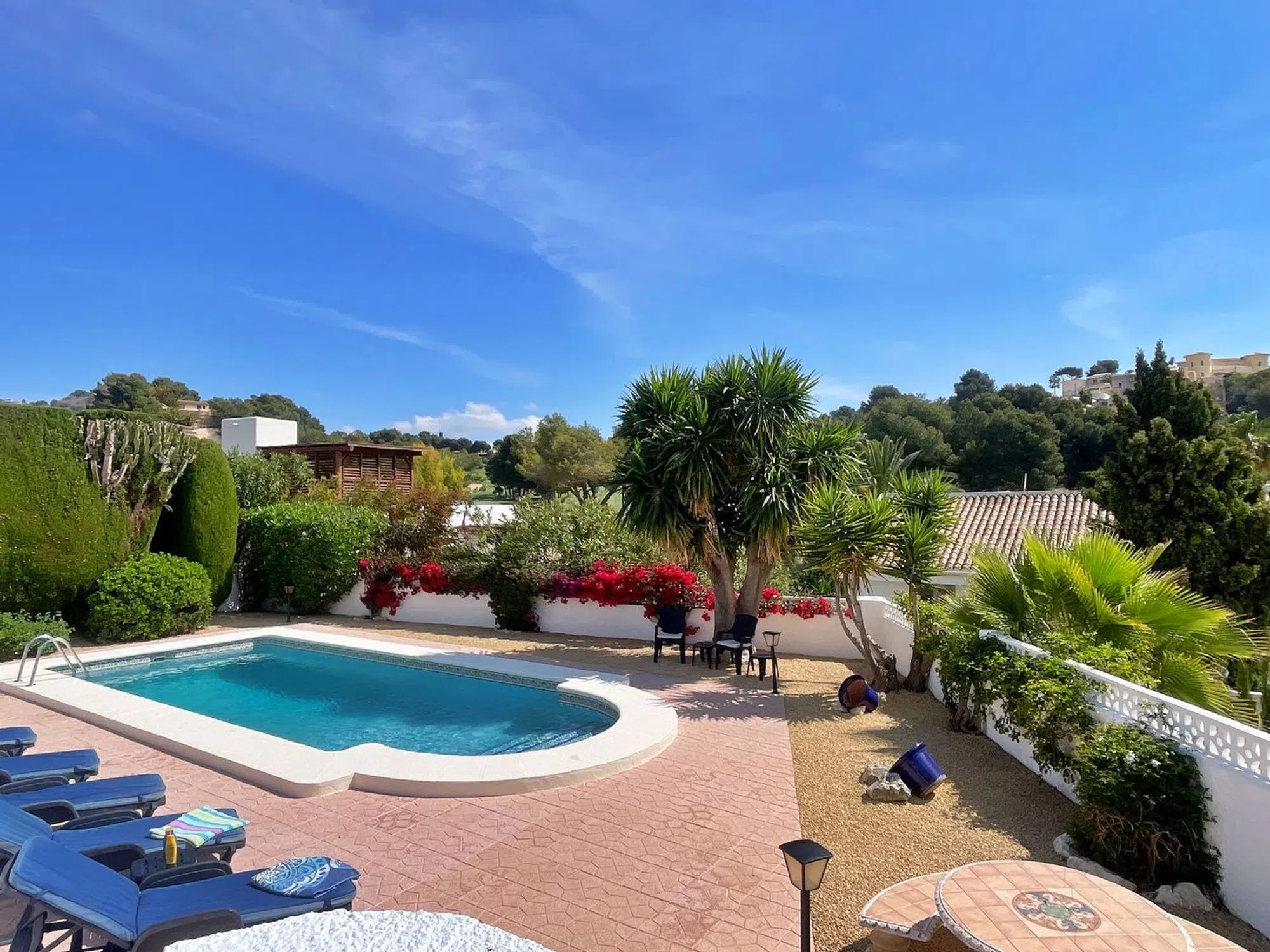 Encantadora villa de un nivel con vistas al golf en Baladrar, Benissa Costa Presentada exclusivamente con Hamiltons de London Moraira, esta encantadora villa de un solo nivel se ubica en la tranquila y buscada zona de Baladrar, esta deliciosa villa unifamiliar ofrece una vida mediterránea sin esfuerzo a solo unos momentos de la costa. Acceda a través de una puerta privada a un amplio camino de entrada con estacionamiento para hasta cuatro vehículos. Los hermosos jardines bien mantenidos rodean la casa, conduciendo a una espaciosa terraza de piscina donde puede disfrutar de vistas abiertas sobre los verdes exuberantes del campo de golf de San Jaime y a solo un corto trayecto en coche del pueblo costero de Moraira. La villa está orientada al este, pero disfruta del sol durante todo el día, perfecto para descansar y entretener al aire libre. En el interior, encontrará una luminosa e invitadora sala de estar y comedor de planta abierta que fluye hacia una cocina de estilo americano. El pasillo conecta con cuatro amplias habitaciones dobles y tres baños. Ya sea que busque una residencia permanente, una casa de vacaciones o una inteligente inversión, esta villa combina conveniencia, comodidad y vistas impresionantes en una de las ubicaciones más deseables de Benissa Costa.