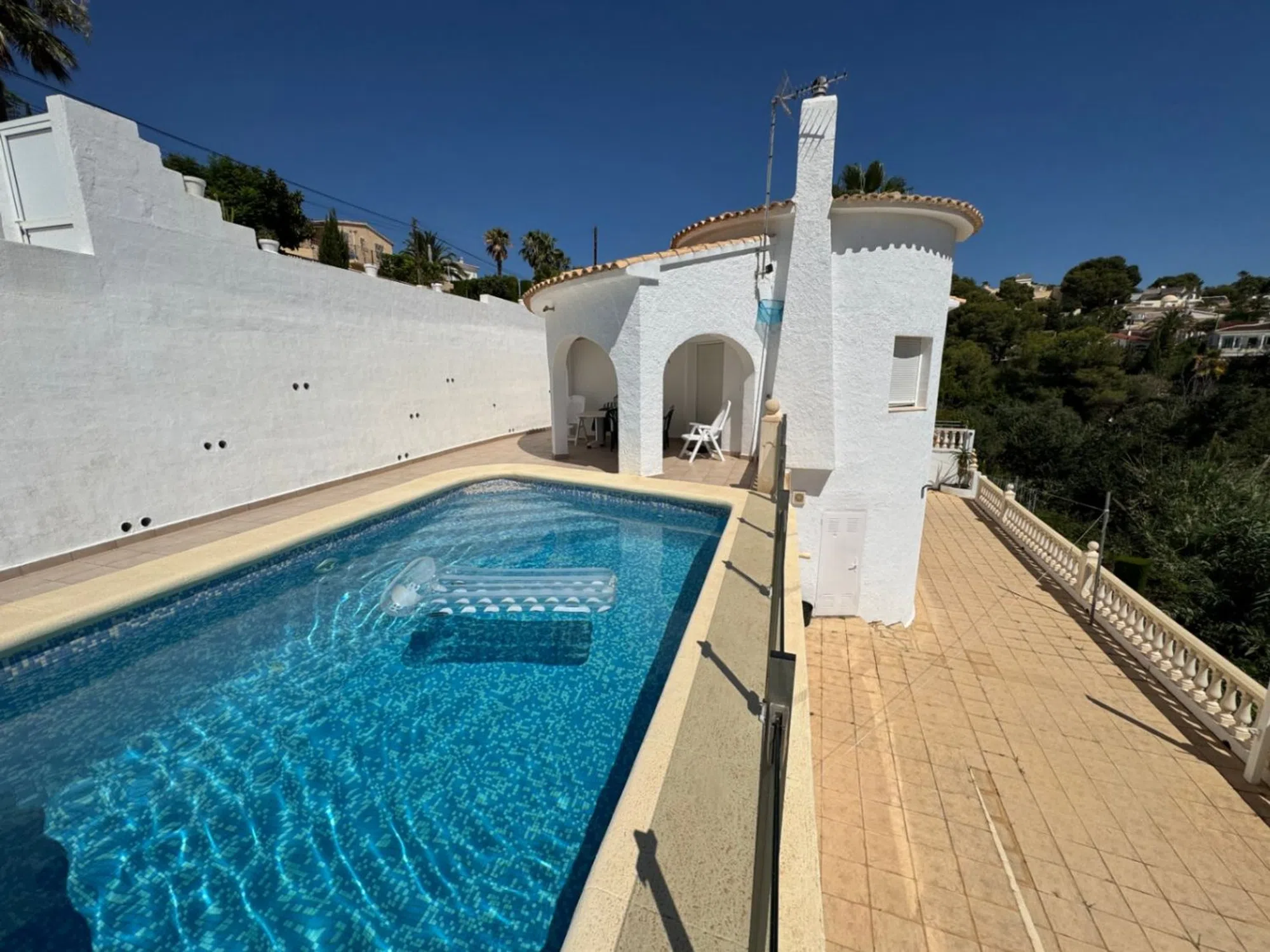 Villa en Benissa-Costa con 2 viviendas independientes, a tan solo 700 m de Cala Baladrar y a 1,4 km de supermercado y servicios. Bonitas vistas panorámicas y un poco al mar desde la terraza de la planta inferior. Sitio tranquilo. La casa, con 2 viviendas independientes, se accede bajando unos pocos escalones desde la calle y se llega a la planta baja (mismo nivel piscina), consta de: cocina cerrada, salón-comedor con chimenea y estufa de leña, 2 dormitorios dobles con armarios empotrados, uno de ellos con baño en-suite y 1 aseo con ducha familiar. La planta inferior consta de: a) trastero y terraza con vistas al mar y horno para pizzas. b) cocina con barra, salón, 2 dormitorios dobles con armarios empotrados, 1 aseo con ducha y trastero, desde esta planta se baja al jardín con césped y árboles frutales (olivos, níspero, limonero, naranjo... ). Ventanas de aluminio con cristal doble. Calefacción central a gas. Piscina de forma irregular con terraza. Parking en el interior de la parcela. Orientación sureste. Esta casa es ideal para vacaciones, pero con todas las comodidades para vivir todo el año.
