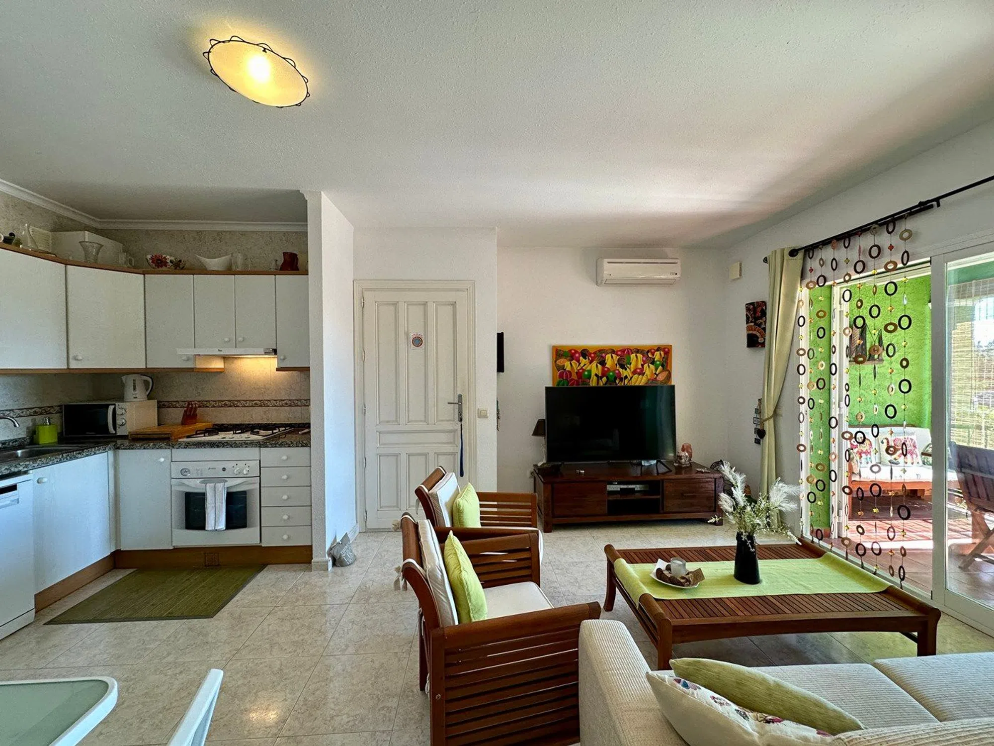 Apartamento en Venta en Cumbre del Sol, Benitachell, Alicante, Costa Blanca Presentamos este magnífico apartamento en planta baja, situado en la exclusiva urbanización Cumbre del Sol. Con una superficie total de 49,50 m², este inmueble destaca por su porche de 8,50 m² con espectaculares vistas al mar y un extenso jardín de grava de 67,50 m². El apartamento dispone de un dormitorio principal con un amplio armario de tres puertas correderas y ventilador de techo, un baño completo con bañera, y un dormitorio secundario con armario. La zona de salón-comedor está equipada con aire acondicionado y se integra perfectamente con una cocina americana. Además, cuenta con un práctico armario para el termo y la lavadora. El porche de 8 m² ofrece acceso directo al jardín, donde se encuentra un pino que proporciona sombra ideal para las horas de descanso, y una pequeña reja que conduce a la calle inferior. Los residentes pueden disfrutar de una piscina comunitaria estilo lago, similar a las de los hoteles, y la ubicación del apartamento es privilegiada, estando muy cerca del bar y de las canchas de tenis y pádel.