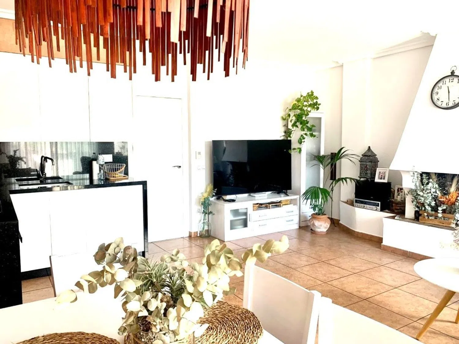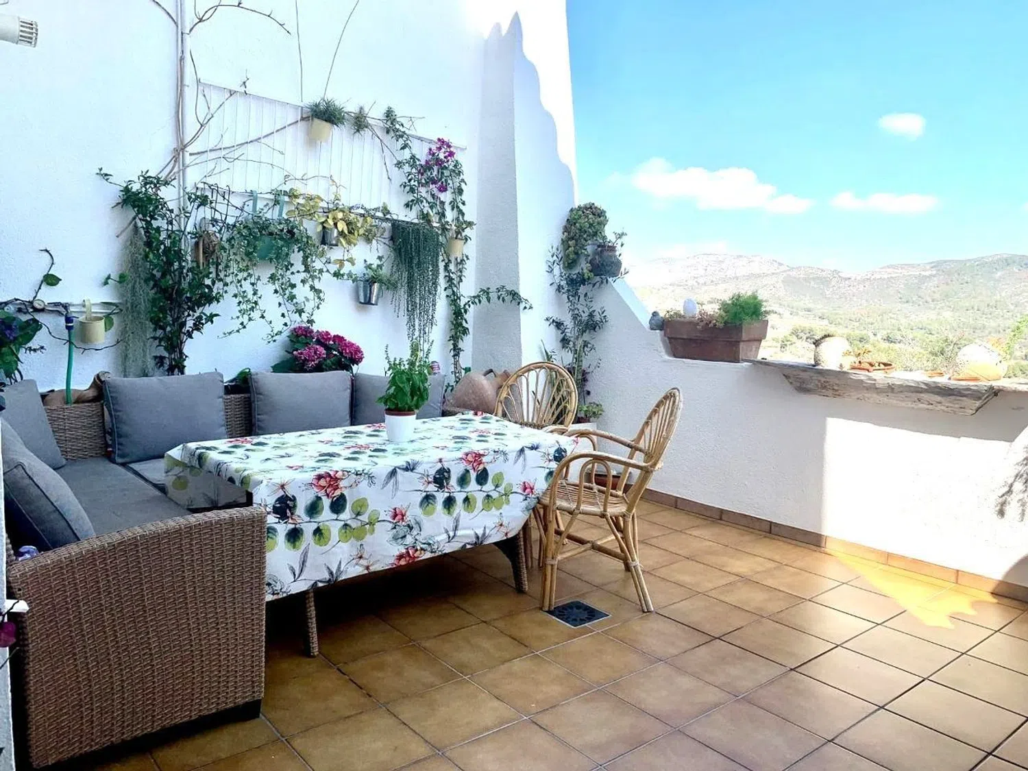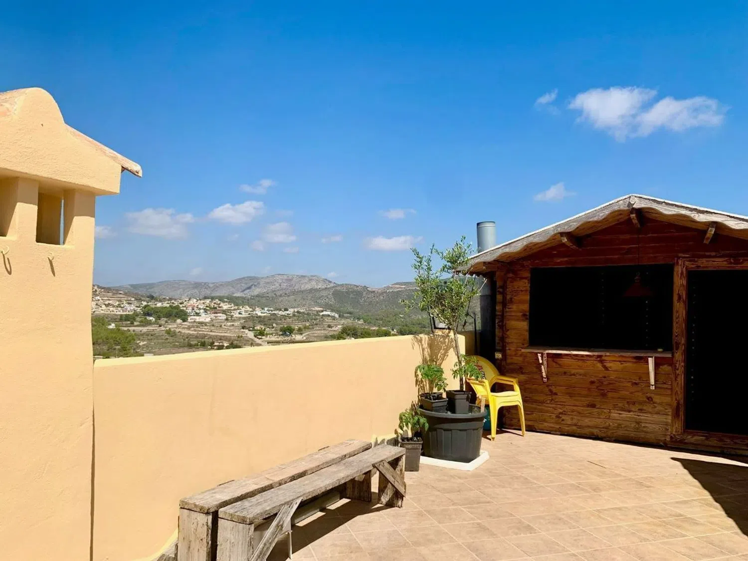 Ascending to the rooftop reveals a generous 50 m² area complete with a wooden shed, perfect for a bar or summer kitchen. There's ample room for a barbecue zone, sun loungers, and even a jacuzzi, all while enjoying breathtaking views of the surrounding hills and the impressive Montgó mountain.