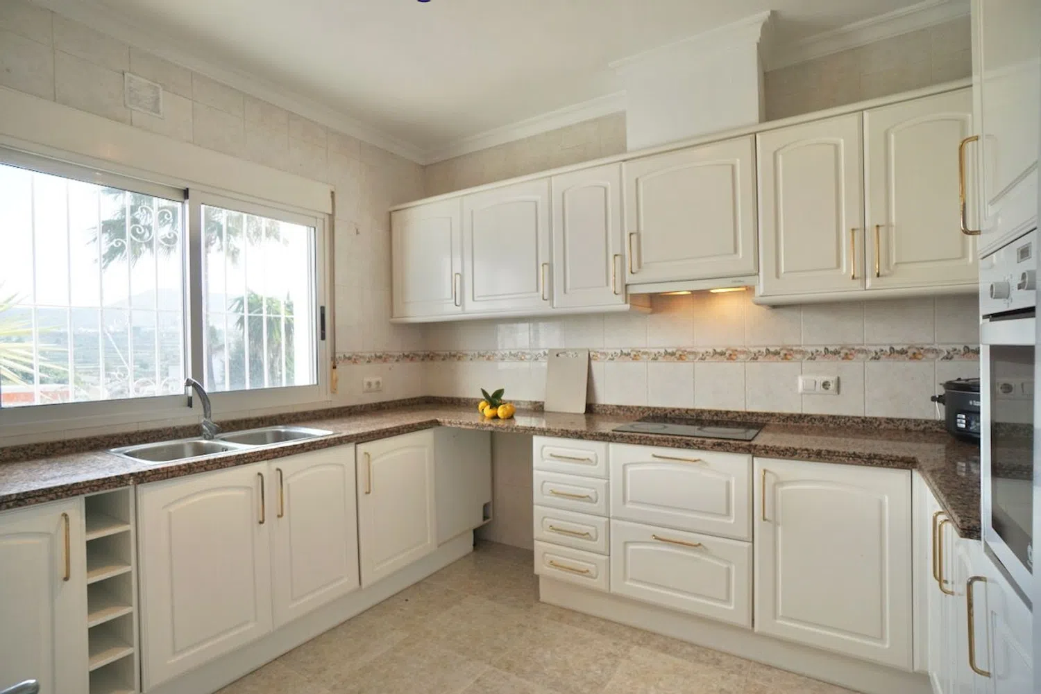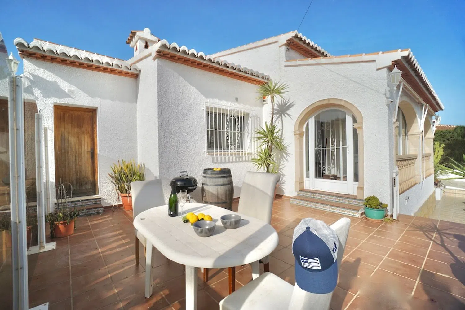 The villa is thoughtfully designed on a single level, enhancing practicality and accessibility. It features three spacious bedrooms, each equipped with built-in wardrobes, along with two well-appointed bathrooms. Open-plan living spaces create a bright and welcoming atmosphere, with a modern, fully-equipped kitchen seamlessly flowing into the living and dining areas. A cozy fireplace in the living room adds warmth and charm, making it perfect for colder winter evenings.