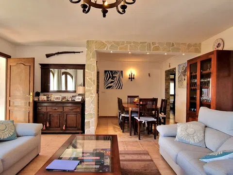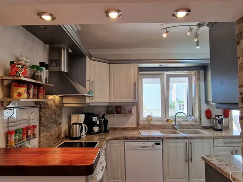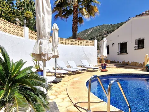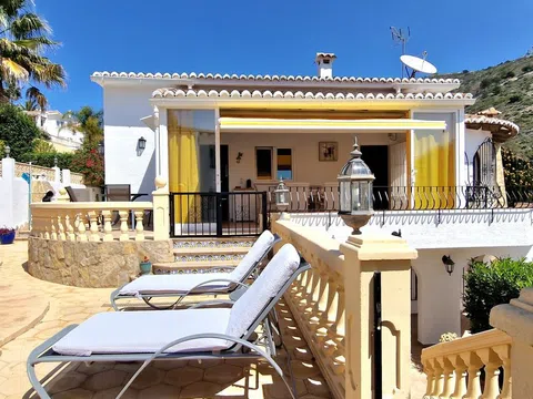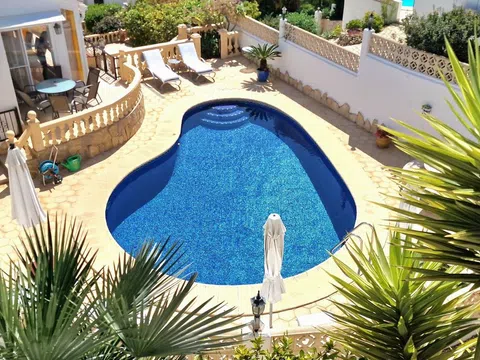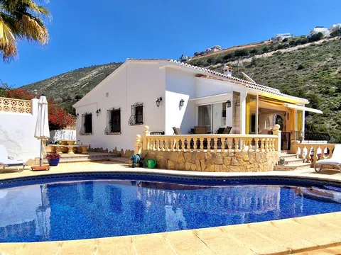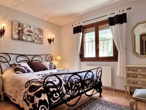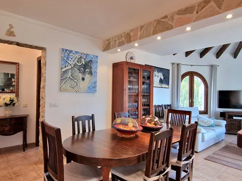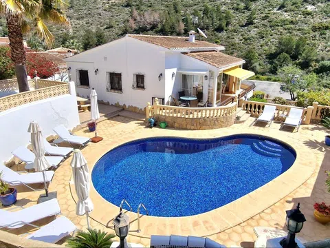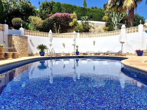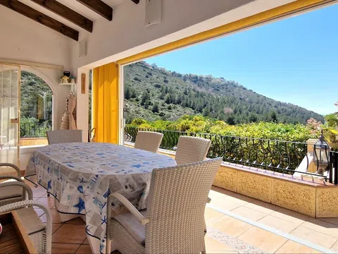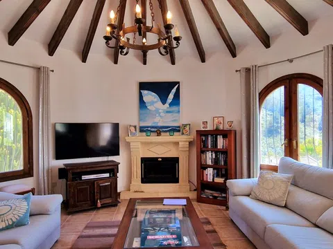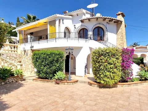 Una hermosa villa mediterránea con vistas al mar, piscina climatizada y garaje situado en el Valle del Portet en las afueras de Moraira, a pocos minutos en coche de la playa, supermercados y centro de la ciudad. La villa consta de dos plantas independientes y se encuentra en una parcela con terrazas y hermoso jardín. La villa tiene un acceso a la calzada y el garaje a través de un portón eléctrico. Usted entra en la casa a través de una Naya acristalada con una hermosa vista y espacio para comer al aire libre y relajarse. A continuación, se encuentra en la amplia y luminosa sala de estar / comedor con chimenea y cuenta con un mar. Una cocina totalmente equipada tiene acceso directo a la Naya. Luego hay dos dormitorios con armarios empotrados y aire acondicionado, cuarto de baño con ducha y dormitorio principal con amplio armario empotrado, aire acondicionado y cuarto de baño con bañera. En la planta baja hay una zona de invitados con terraza privada, amplio dormitorio con baño en-suite con bañera y ducha También en este nivel se encuentra un amplio lavadero/trastero. Al final de la escalera exterior se accede al garaje, que cuenta con una sala de calderas y trastero, así como un almacén independiente en la parte trasera del garaje. El jardín es especial, desde la valla junto a la carretera hasta la zona de petanca en la parte superior de la propiedad, el jardín está lleno de plantas, flores de colores y árboles frutales. Amplia terraza soleada alrededor de la piscina con un montón de tumbonas. Junto a la piscina hay una barbacoa donde podrá sentarse con su familia. La casa está equipada con calefacción central de gas.