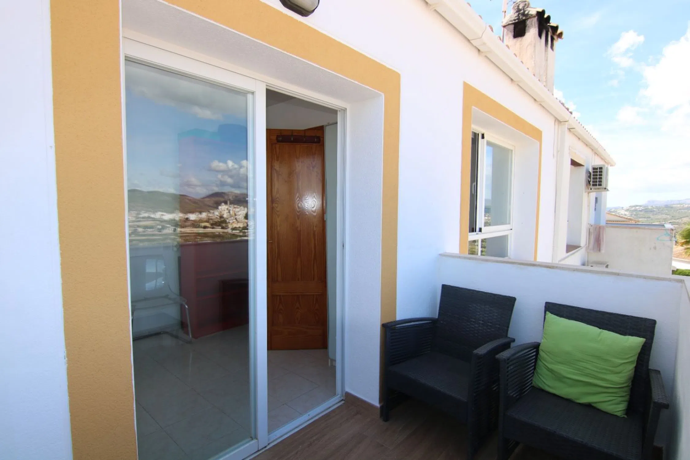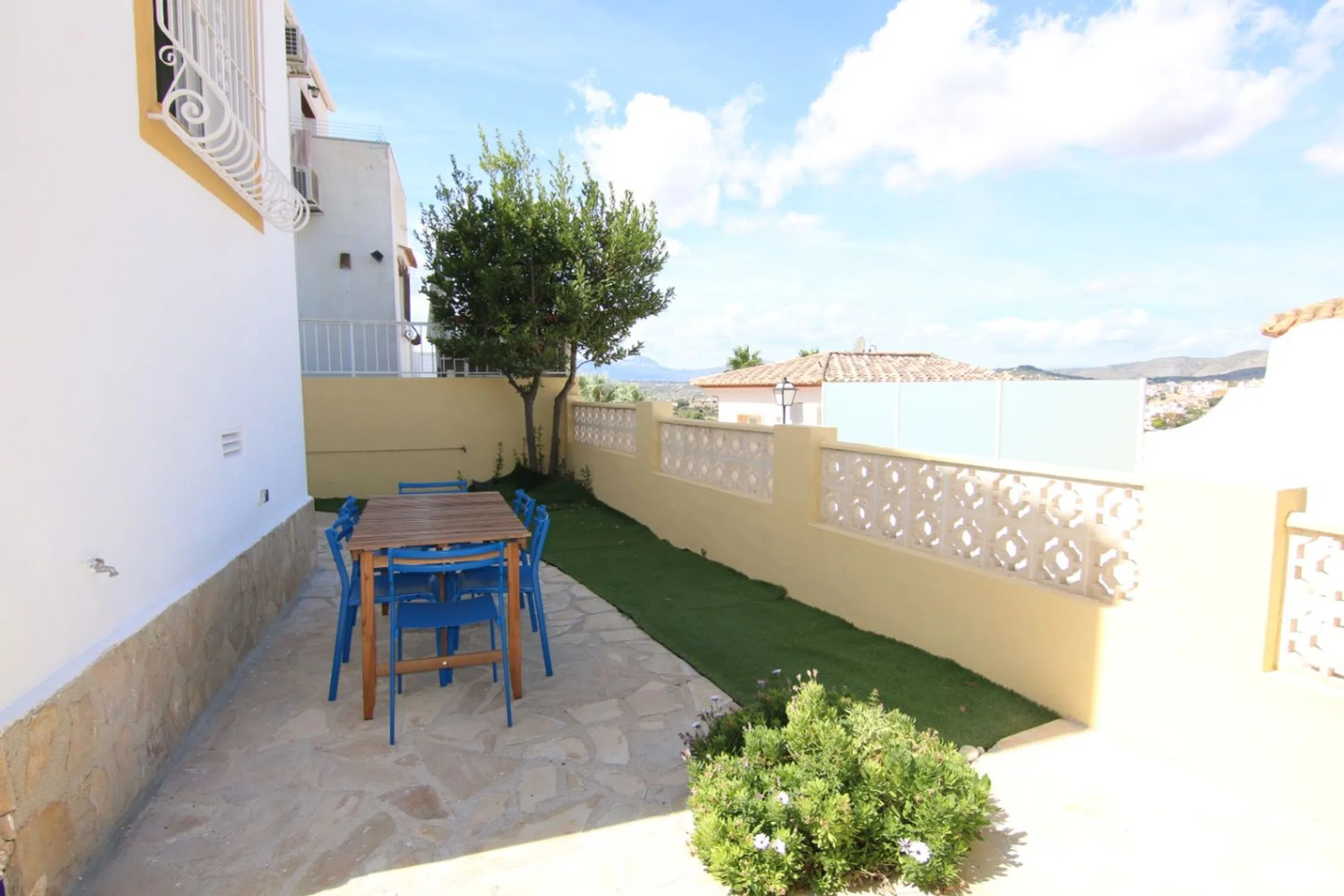 Villa adosada con vistas impresionantes desde la costa de Jávea hasta el valle y el Montgó y el pueblo de Benitachell. Distribuida en tres niveles: la planta principal terraza recibidor, cocina moderna abierta al luminoso salón-comedor con estufa de pellet, dormitorio con acceso a la terraza con bonitas vistas y aseo de cortesía. En planta baja dispone de dos dormitorios dobles con armarios empotrados, amplio baño familiar con ducha y bañera, un pequeño trastero y una estufa chimenea de pellets. En el jardín de la planta baja hay terraza para cenar y comer, barbacoa.. . Destacamos tambien: sótano para almacenamiento, aparcamiento privado, y acceso inmediato a piscinas comunitarias. Perfecta como residencia, segunda vivienda o inversión de alquiler. Muy buena ubicación, muy próximo a servicios, tiendas y al Colegio Internacional.