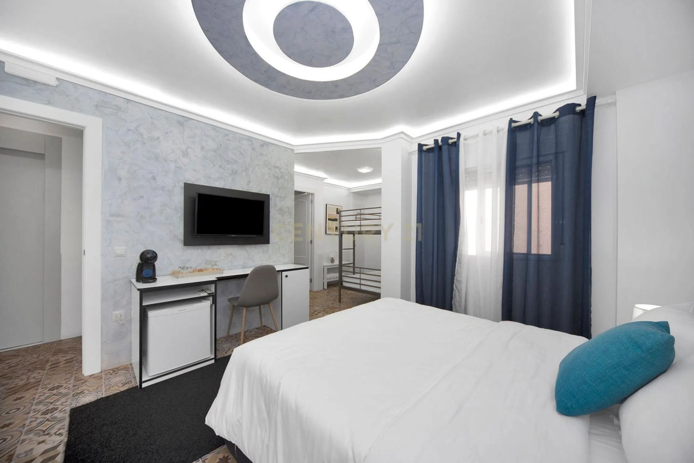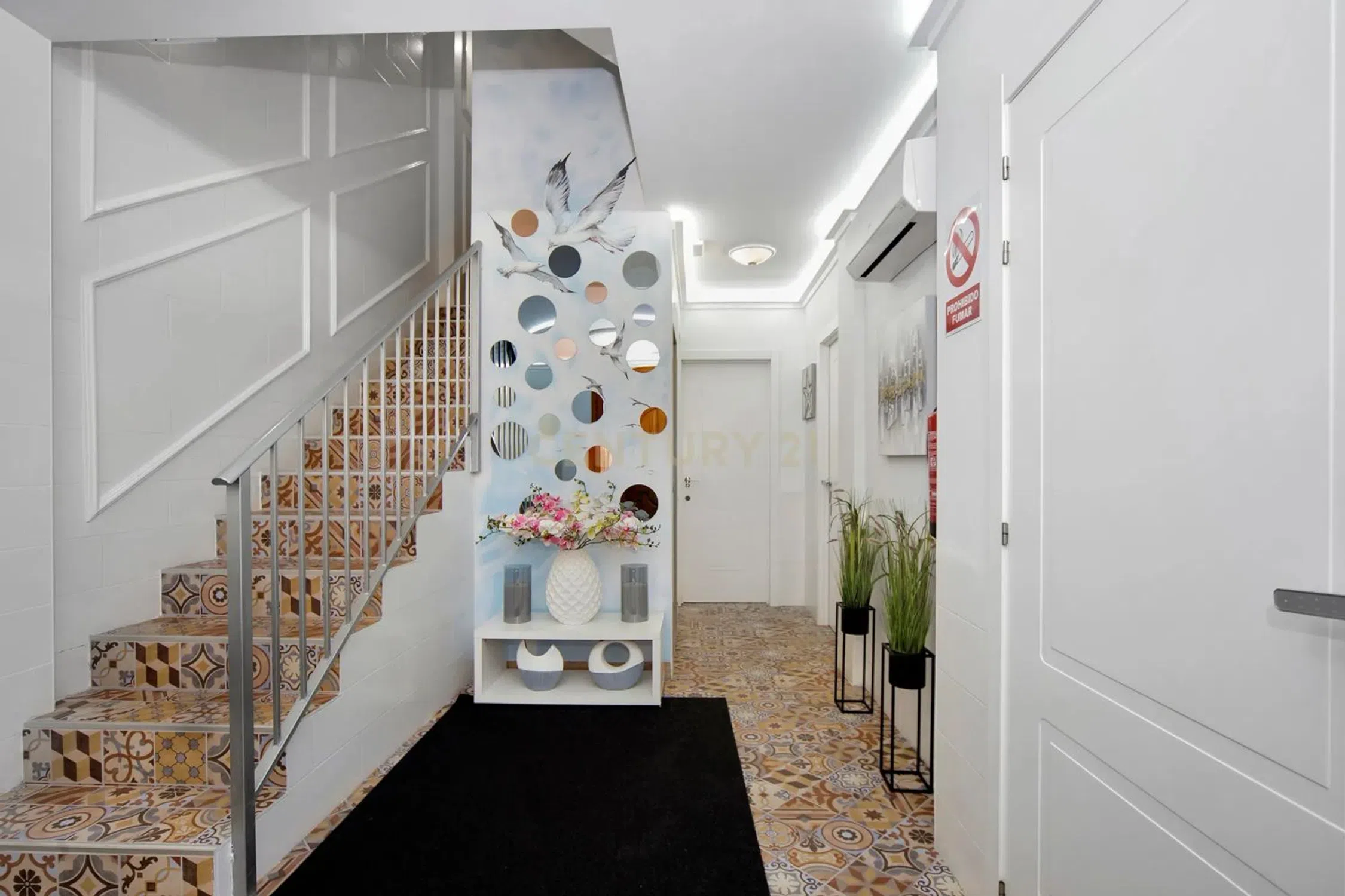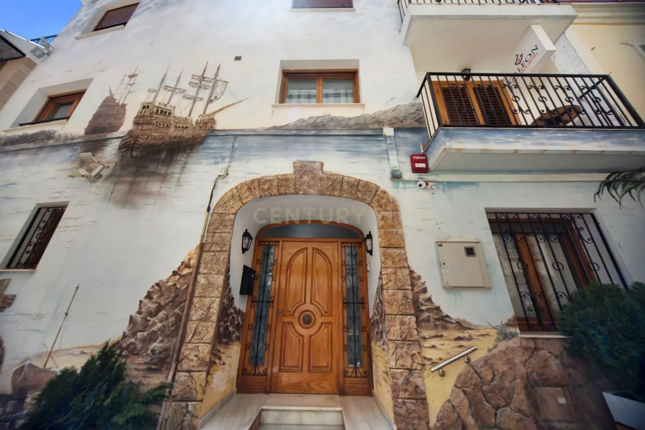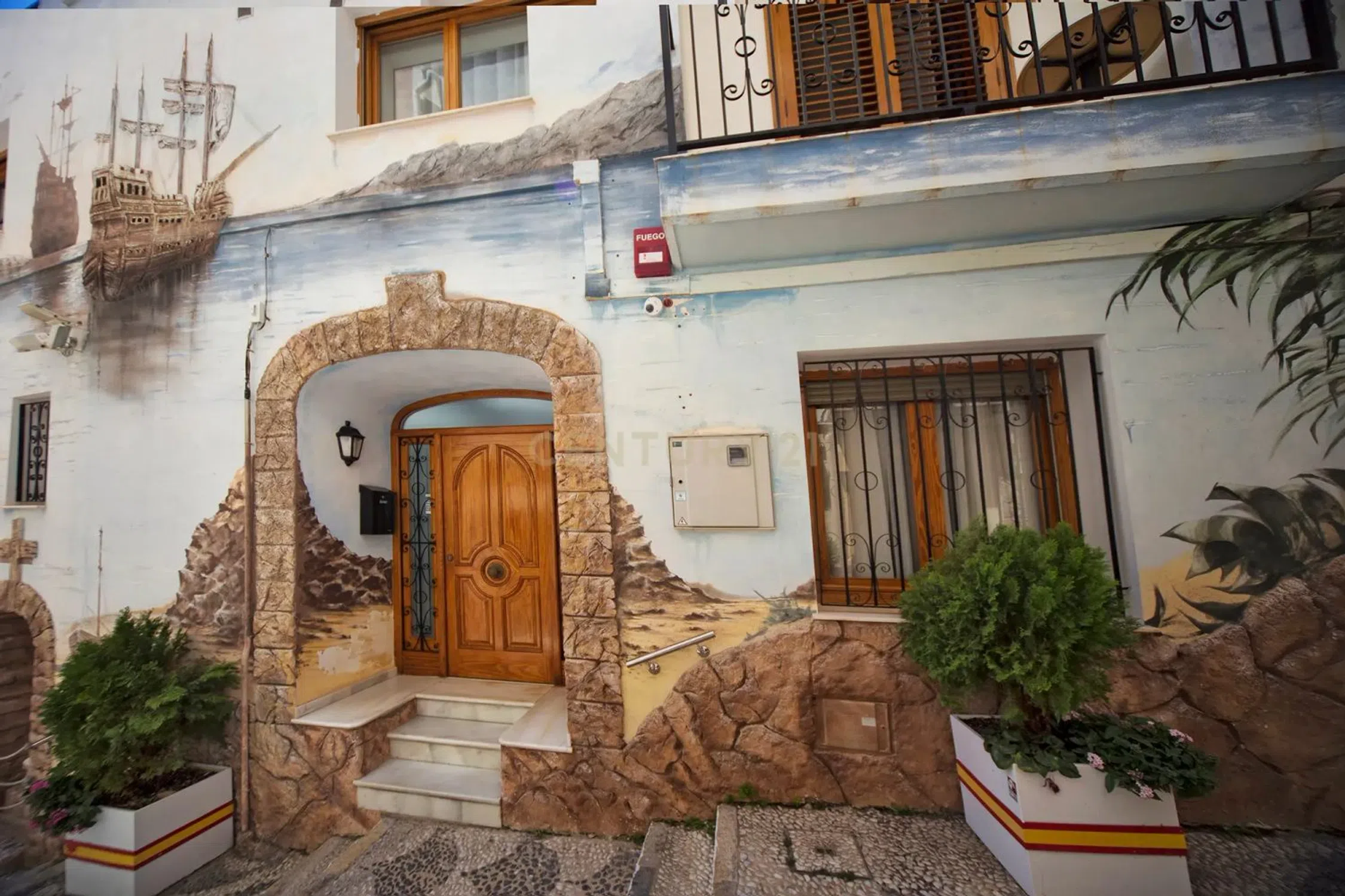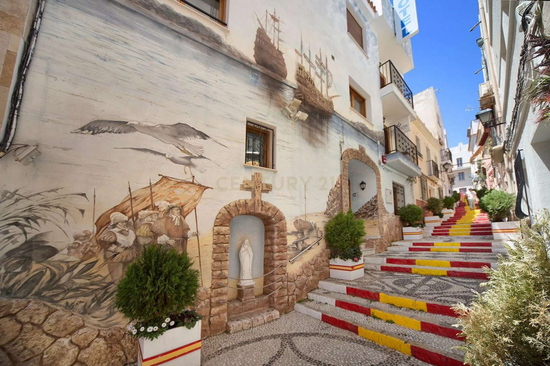 Elegante hotel en el centro histórico de la ciudad de Calpe, situado directamente en la Escalera de España y muy cerca de la playa y el mar. Este hotel cuidadosamente restaurado (completamente renovado en 2023) ofrece alojamiento para hasta 26 huéspedes en sus 8 habitaciones. La renovación se ha llevado a cabo con atención al detalle y sigue siendo muy fácil de mantener y, sobre todo, visual y arquitectónicamente, a pesar de su toque moderno, encaja perfectamente en el centro histórico de la ciudad de Calpe. Se encuentra justo en uno de los sitios más fotografiados de toda la Costa Blanca, las escaleras de la Calle Puchalt pintadas con la bandera española. En la zona de entrada se encuentra una recepción sencilla, luminosa y elegante con zona de espera y aseo para invitados. Desde aquí un ascensor llega a todas las plantas y a la azotea. En este nivel hay un dormitorio doble y otro dormitorio con litera. Todas las habitaciones están totalmente equipadas con aire acondicionado (frío/calor), minibar, TV de pantalla plana con canales internacionales, recepción WIFI, baño con WC, lavabo y ducha. En el segundo y tercer piso (a todos ellos accesibles por escalera interior o en ascensor) hay dos dormitorios con cama de matrimonio y literas, así como una habitación con cama de matrimonio y una pequeña terraza con vistas a la “ciudad española”. Pasos” y el casco antiguo. La zona superior es una amplia azotea (50 m²), desde donde se puede disfrutar de una hermosa vista de los tejados del casco antiguo de Calpe, hasta el Peñón de Ifach y el mar. Este lugar es ideal para desayunos de huéspedes o agradables veladas de cócteles en un grupo pequeño. También hay una conexión de agua, lo que significa que tienes la opción de instalar un jacuzzi allí. Todo el hotel está muy limpio y bien conservado, fue reformado y renovado completamente en 2023 (todas las instalaciones de agua y electricidad), así como muebles y camas nuevos, así como los baños, que fueron rediseñados y equipados en 2023. La calle Puchalt, donde se encuentra el hotel, es, junto con el Peñón de Ifach, el tema más fotografiado de Calpe y una de las imágenes más publicadas en Internet. Aquí estás justo en el corazón de Calpe, en el casco histórico, cerca del castillo y de los encantadores pequeños museos y exposiciones de arte. La playa de arena con bandera azul de Arena-Bol se encuentra a 700 m del hotel, justo desde la principal calle comercial de Calpe, la Avenida Gabriel Miró. Además de diversas oficinas y comercios, también encontrará pequeños bares locales, supermercados y restaurantes de cocina mediterránea e internacional. Hay un gran aparcamiento a 200 metros del hotel. La estación de autobuses está a aproximadamente 1,5 km del hotel.