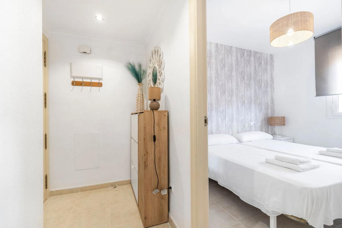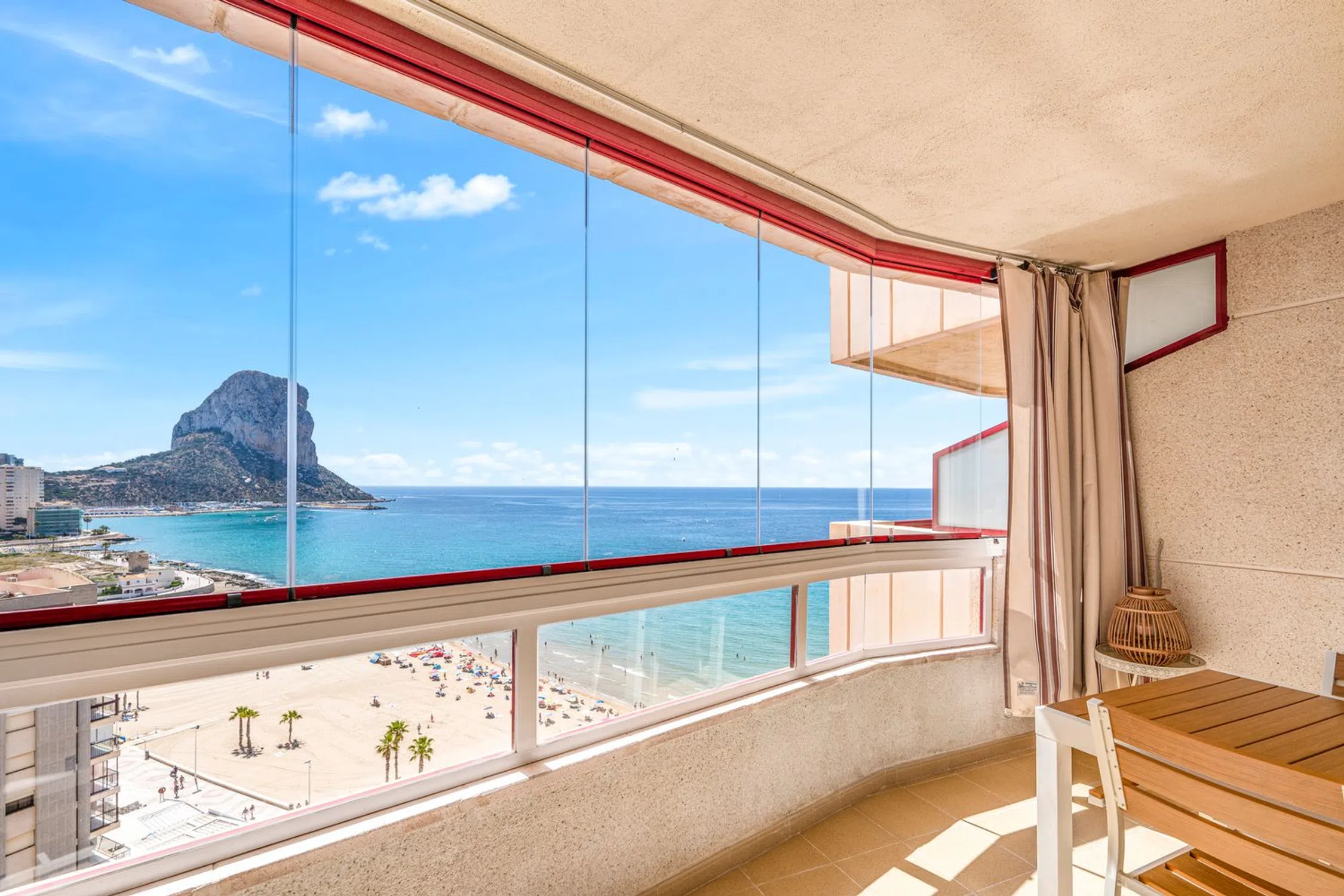 Apartamento Reformado con Vistas al Mar en Playa Arenal – Calpe | Planta 14, 2 Dormitorios y Terraza Ubicado en una de las zonas más demandadas de Calpe, este apartamento en planta 14 se encuentra a solo 30 metros del mar, en segunda línea de la Playa Arenal-Bol. Reformado recientemente y en perfecto estado, ofrece un estilo mediterráneo cómodo y funcional, ideal tanto como residencia habitual como inversión con alta rentabilidad turística. Con una superficie útil de 92 m², la vivienda cuenta con una excelente distribución: amplio salón-comedor con acceso directo a una terraza acristalada de 14 m² con vistas abiertas al mar, al Peñón de Ifach y a la ciudad; cocina americana equipada, dos dormitorios dobles con armarios empotrados y dos baños completos, uno de ellos en suite. El edificio ofrece servicios de conserjería y vigilancia 24h, además de piscina comunitaria, jardines y aparcamiento privado en el mismo complejo. Una oportunidad muy completa en una ubicación estratégica. Características: El apartamento dispone de aire acondicionado central por conducto (frío y calor), calefacción eléctrica centralizada y doble acristalamiento, lo que garantiza un confort térmico y acústico durante todo el año. La cocina americana se integra de forma funcional con la zona de día y está conectada a una galería con lavadero y despensa. La terraza, ubicada en altura y orientada al sureste, ofrece un espacio ideal para disfrutar del exterior, con vistas despejadas al Mediterráneo y a la zona común del edificio. Se vende completamente amueblado, con mobiliario actual y en excelente estado, por lo que está listo para ocupar o alquilar de inmediato. El inmueble cuenta con licencia turística en vigor, lo que lo convierte en una opción muy interesante para inversores que buscan alta demanda vacacional. Además, se incluye una plaza de aparcamiento privada en el mismo edificio, un valor añadido clave en esta zona del centro urbano. Zona: Situado en pleno centro de Calpe, en la Playa Arenal-Bol, este apartamento ofrece acceso inmediato a todo tipo de servicios y ocio: supermercados, restaurantes, farmacias, tiendas, transporte público y más, todo a pocos pasos. La ubicación permite disfrutar de la vida de playa sin necesidad de vehículo, y al mismo tiempo garantiza rentabilidad gracias a su alto atractivo turístico. La zona combina ambiente familiar, servicios completos y vistas privilegiadas al mar y al emblemático Peñón de Ifach, uno de los grandes atractivos naturales de la Costa Blanca. Su cercanía al paseo marítimo y al núcleo urbano de Calpe refuerzan el valor de esta propiedad, tanto para uso propio como para alquiler vacacional o de temporada.