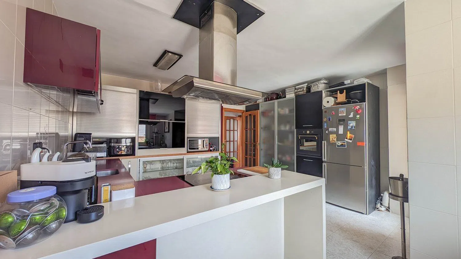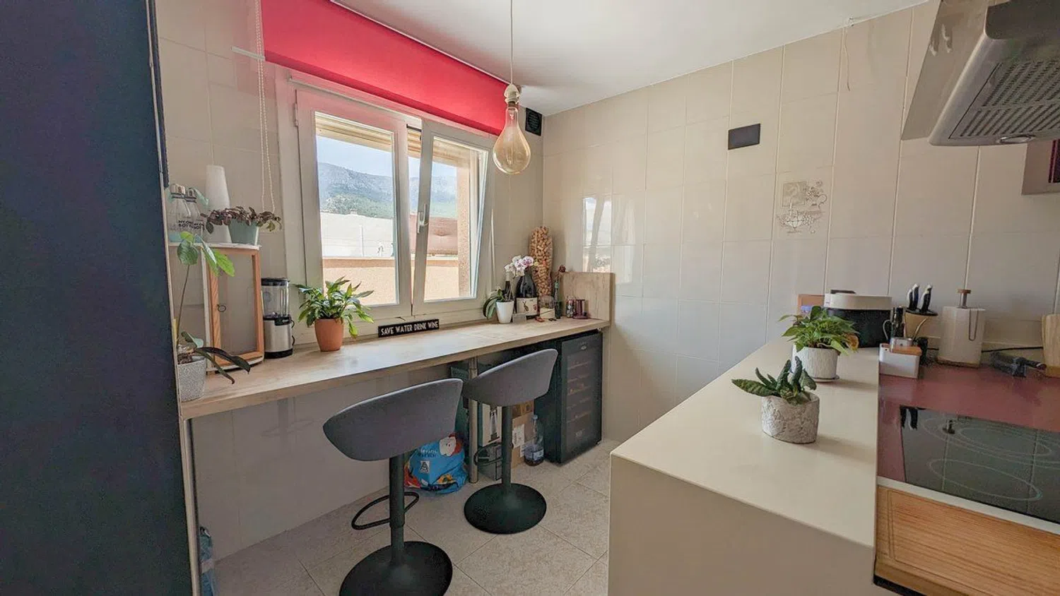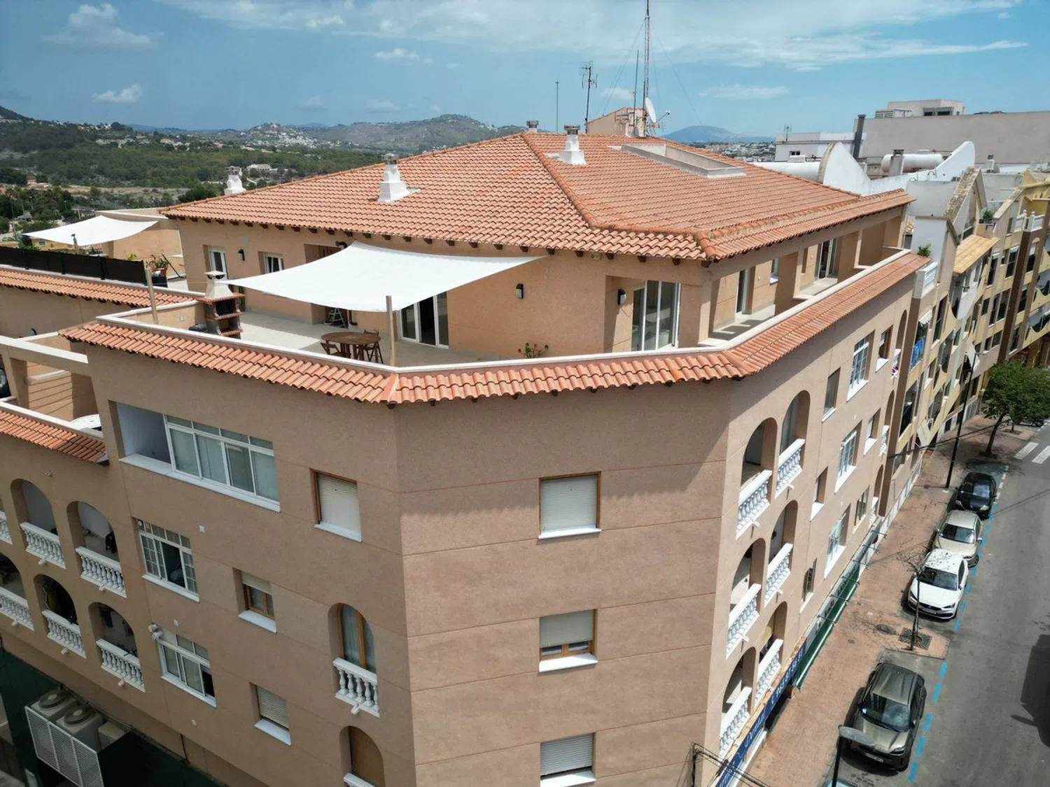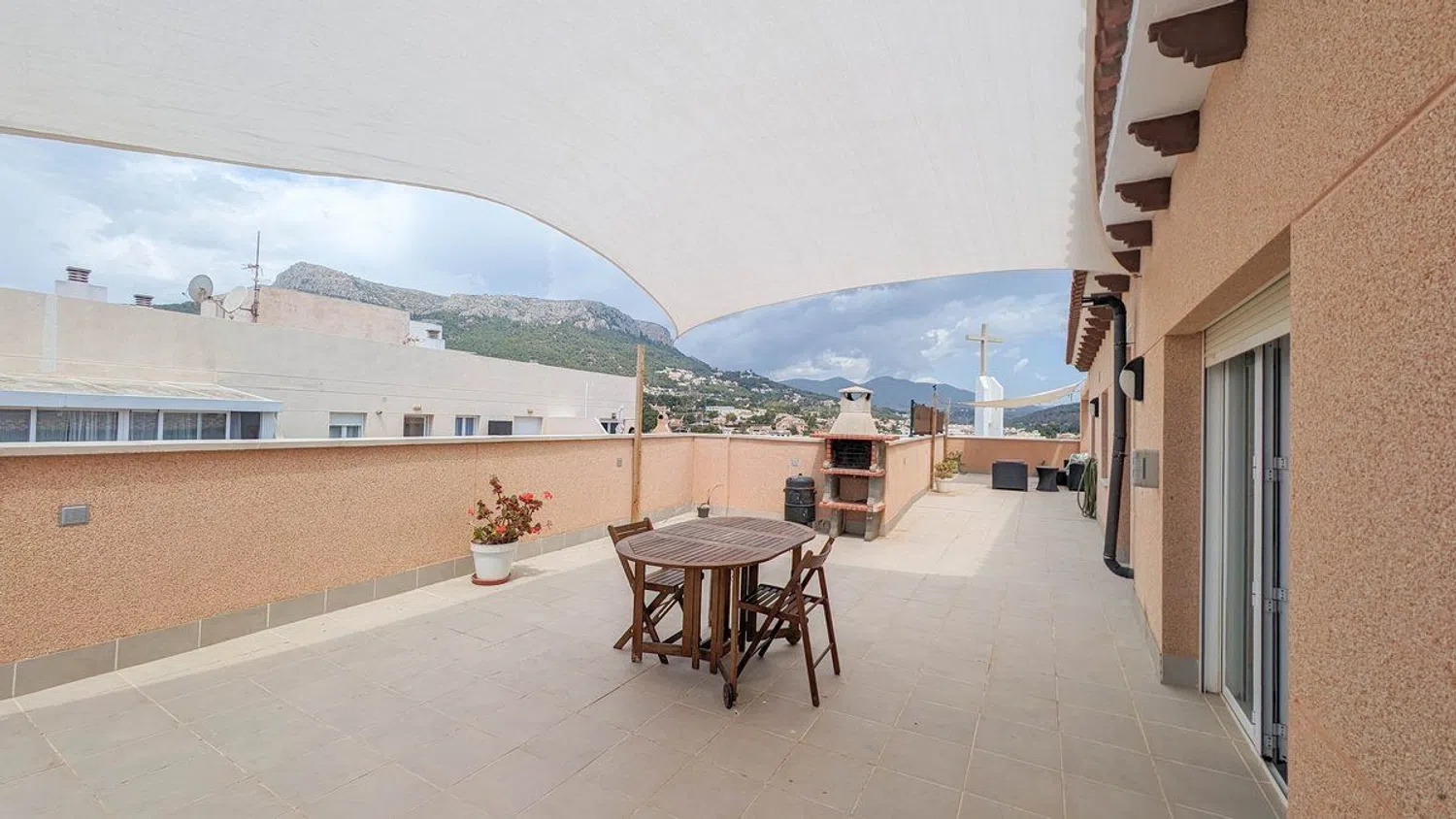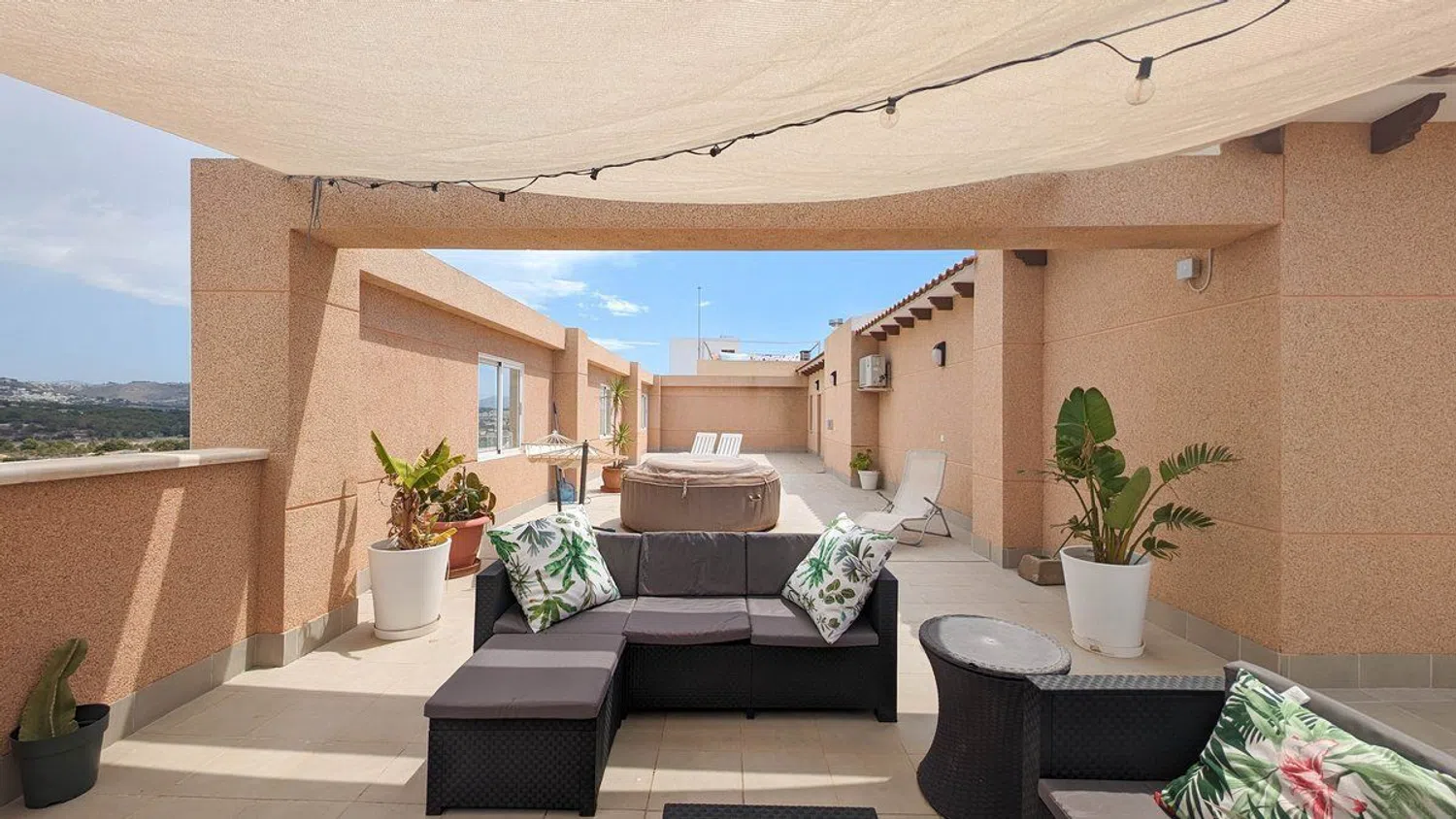 One of the most remarkable features of this property is the extensive terrace that surrounds the entire penthouse. This outdoor space is designed to fully embrace the Mediterranean climate and includes distinct areas: a laundry section, a barbecue area ideal for outdoor gatherings, a cozy chill-out zone for relaxation, and a luxurious jacuzzi corner for indulgent moments. From the terrace, stunning views of the Oltá mountain enhance the sense of tranquility and natural beauty amid an urban setting.