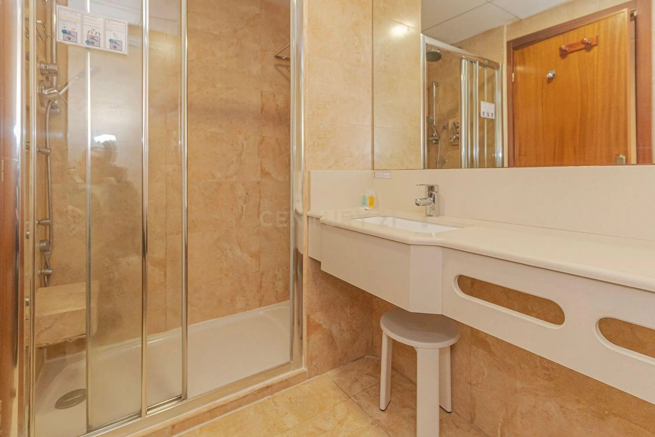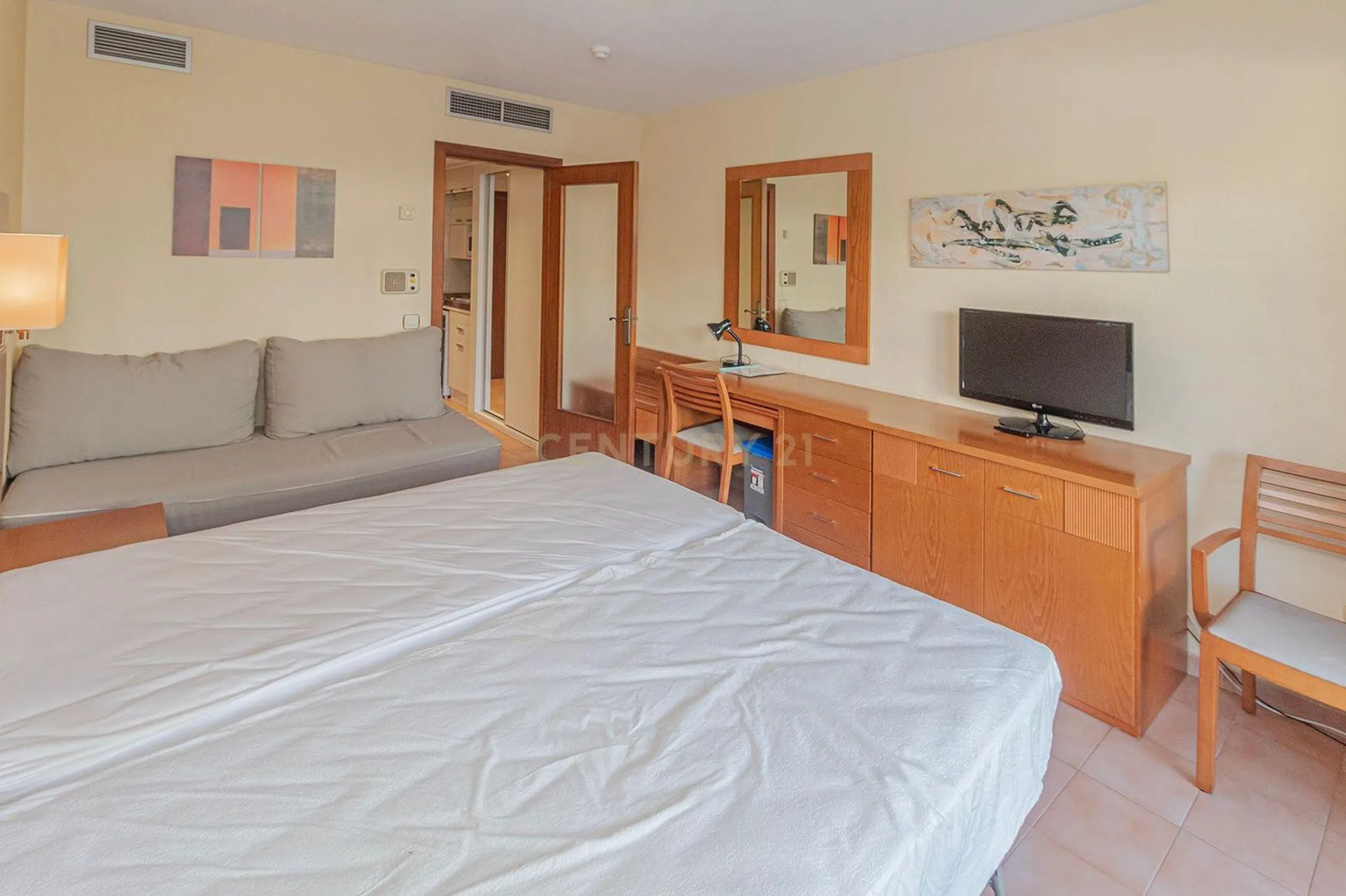 Te ofrecemos este apartamento, tipo estudio, de 30m2 con una terraza privada de 5m2. Esta en la primera planta de un edificio con ascensor. El apartamento consta de un pasillo de entrada, una habitacion grande, con acceso a la terraza, una cocina americana pequeña con nevera, micronda y placa, un cuarto de baño privado con bañera y un armario grande Se ubica en un Apartotel asi que se puede aprovechar a los servicios del hotel como la piscina comunitaria. No se puede alquilar el apartamento de forma comercial ni personal, (por razón de los estatutos del Hotel) pero puede ofrecerse al hotel para alquilarlo a sus huéspedes, de los que podrá recibir un dividendo al final de cada año. El propietario puede vivir en la propiedad de forma permanente o puede ser utilizada por familiares cercanos (padres, hermanos, hijos). Los gastos de comunidad ascienden a unos 130 € al mes, pero esto incluye los gastos de agua y electricidad. La propiedad se vende amueblada como se ve. El hotel está situado a sólo 100 metros de la playa de La Fossa y a 200 metros de dos grandes supermercados, así como de una gran variedad de cafeterías, bares y restaurantes. Aparte, hay la opcion de adquirir un garaje cerrado, por debajo del mismo edifico por un precio de €23,000.