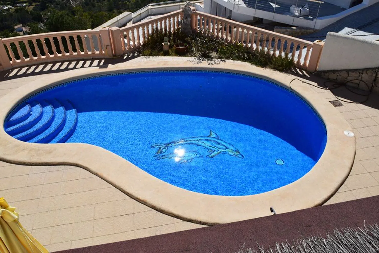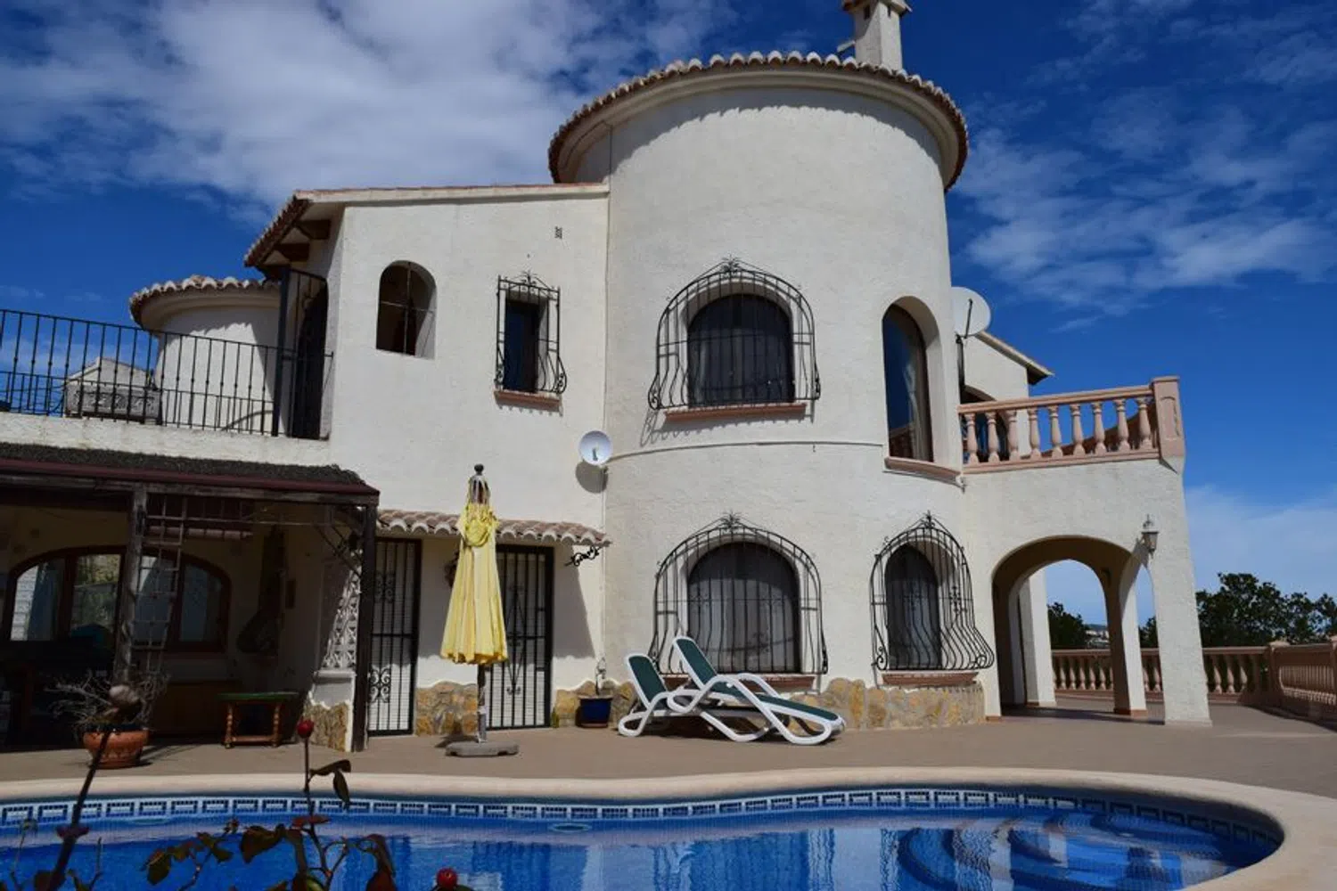 On the lower level, you will find another expansive living area, along with three additional bedrooms and two bathrooms, one of which is en-suite. This level directly accesses the inviting swimming pool and covered terrace, making it an excellent space for entertaining or simply unwinding in the sun.