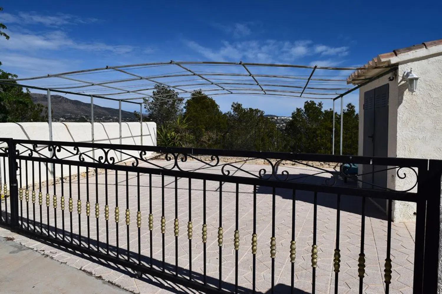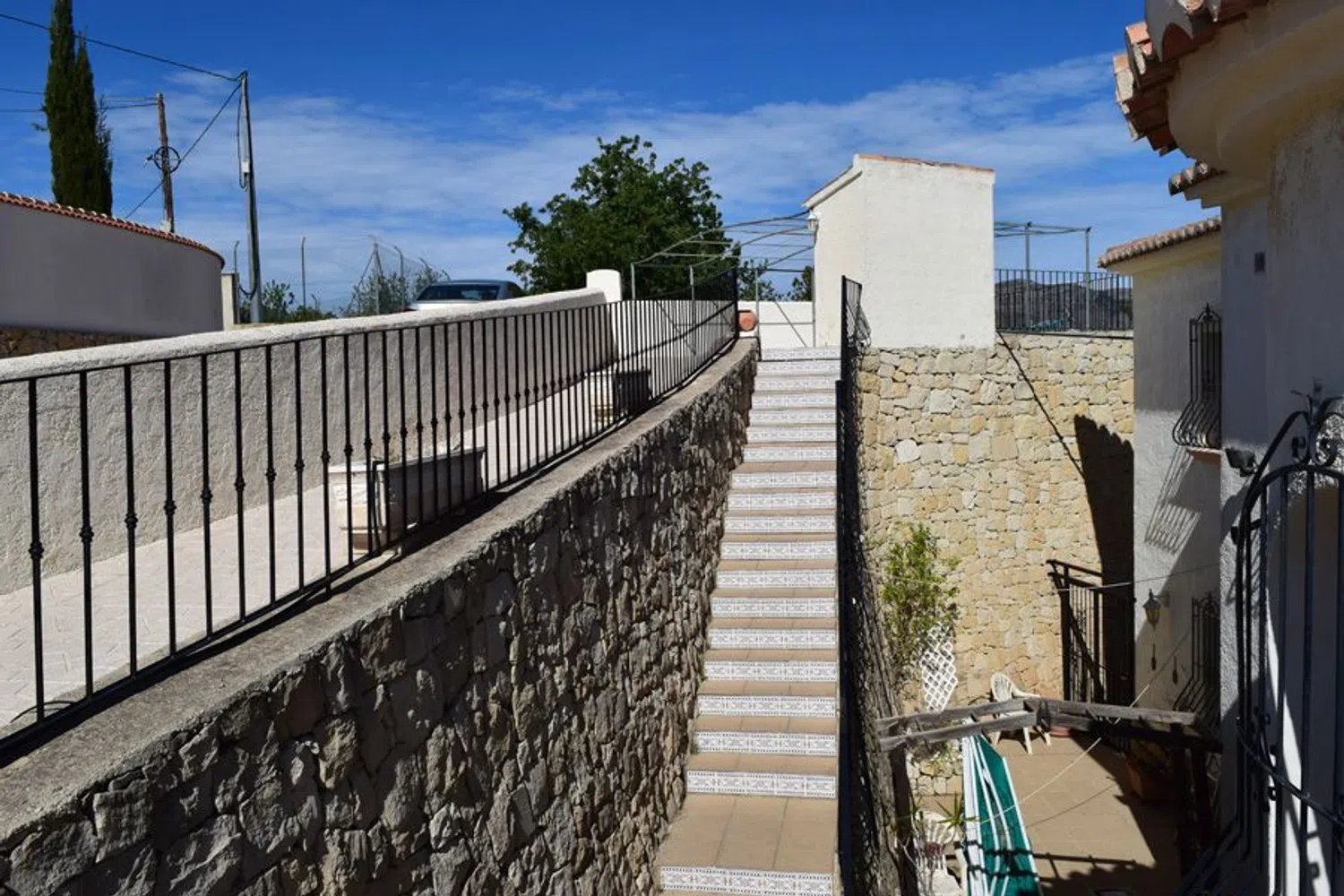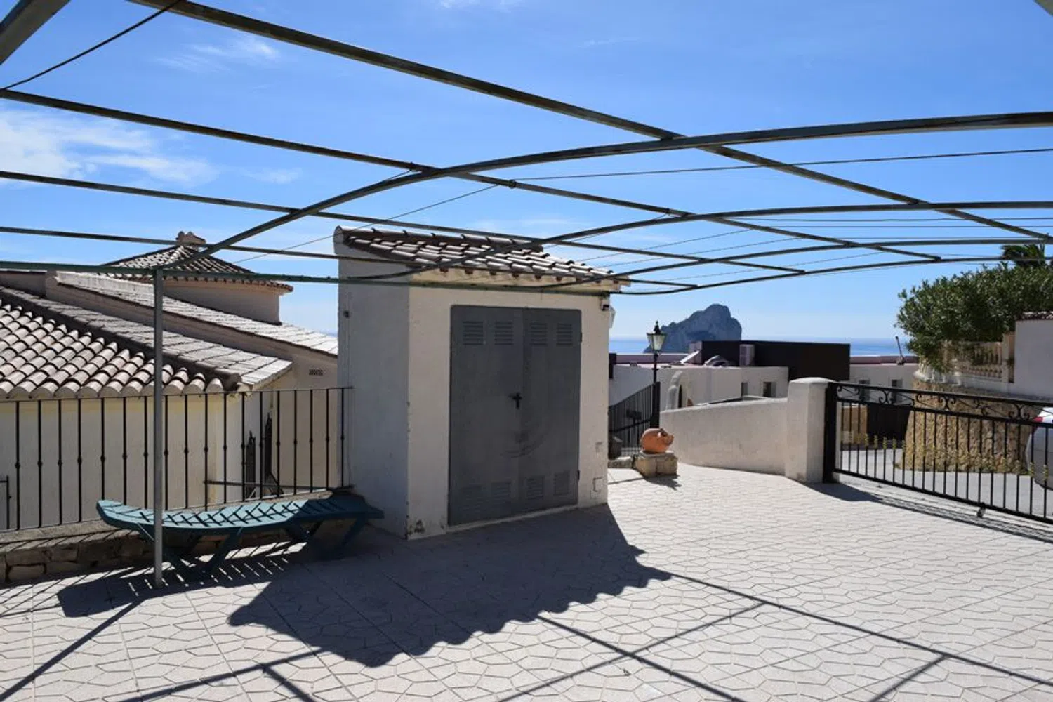The upper level features a spacious living and dining area that opens onto both covered and uncovered terraces, providing an ideal setting to enjoy panoramic views. This floor also includes an open-plan kitchen, a guest restroom, a laundry room, and a generously sized master bedroom complete with an en-suite bathroom featuring both a shower and jacuzzi, perfect for relaxation.