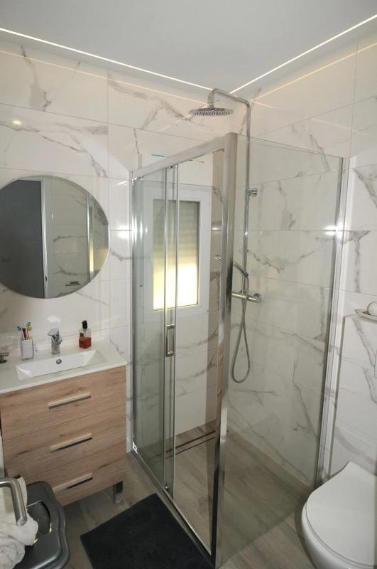 Moving to the second floor, a large bedroom with a built-in wardrobe awaits, complete with an en-suite bathroom featuring a shower, wall-mounted toilet, and sink. This level grants access to a spacious terrace that offers stunning views of greenery and the mountains beyond.