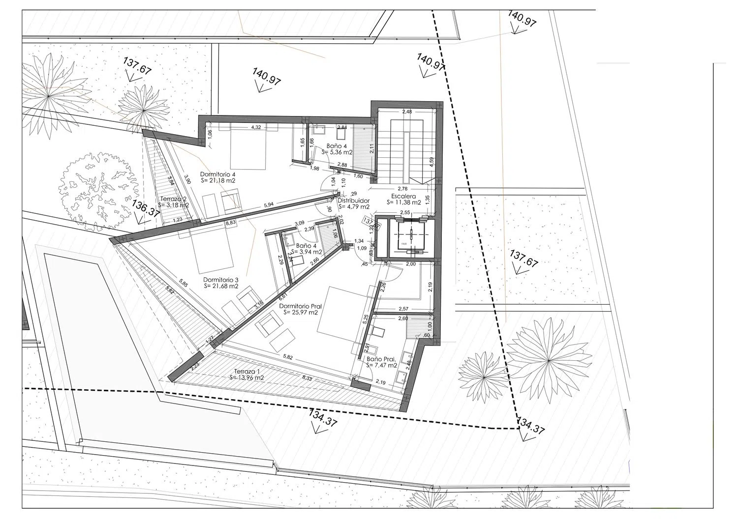 Set on a generous plot of 627 m², the villa boasts a total built area of 421 m², thoughtfully distributed across three levels connected by both an elevator and an internal staircase. The first floor features a relaxing area, highlighted by a spacious master bedroom of 26 m² complete with an en-suite bathroom and walk-in closet, along with two additional well-sized bedrooms, each with their own en-suite bathrooms and built-in wardrobes. All three bedrooms enjoy access to private terraces.