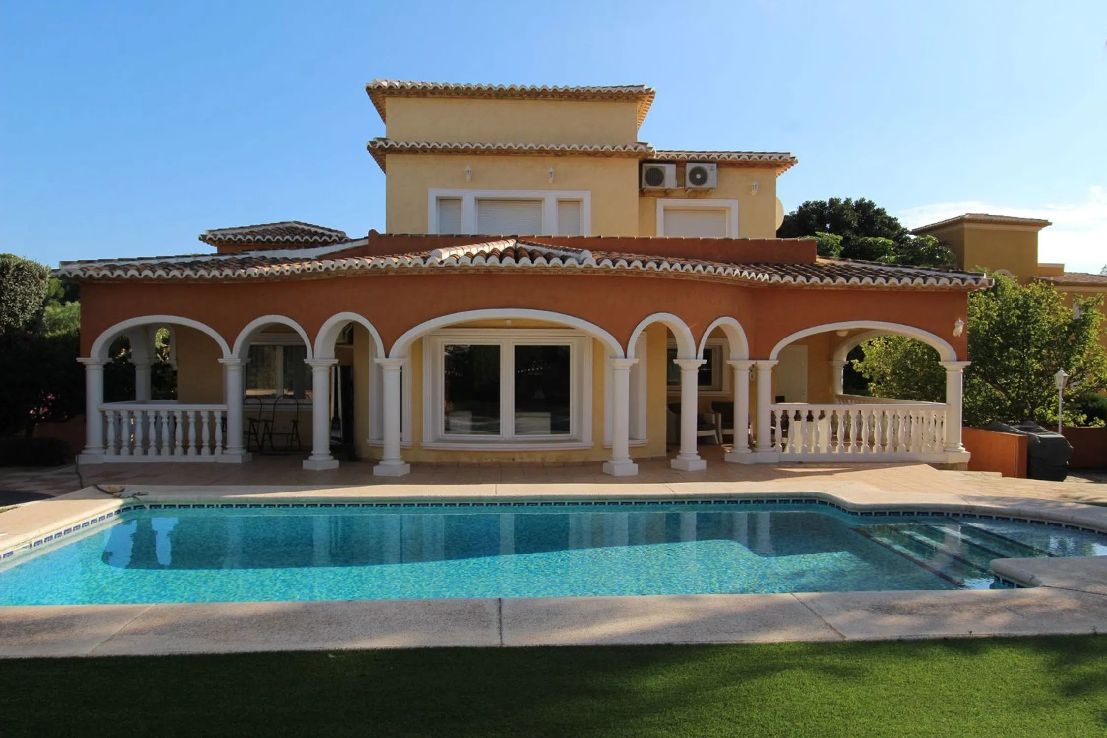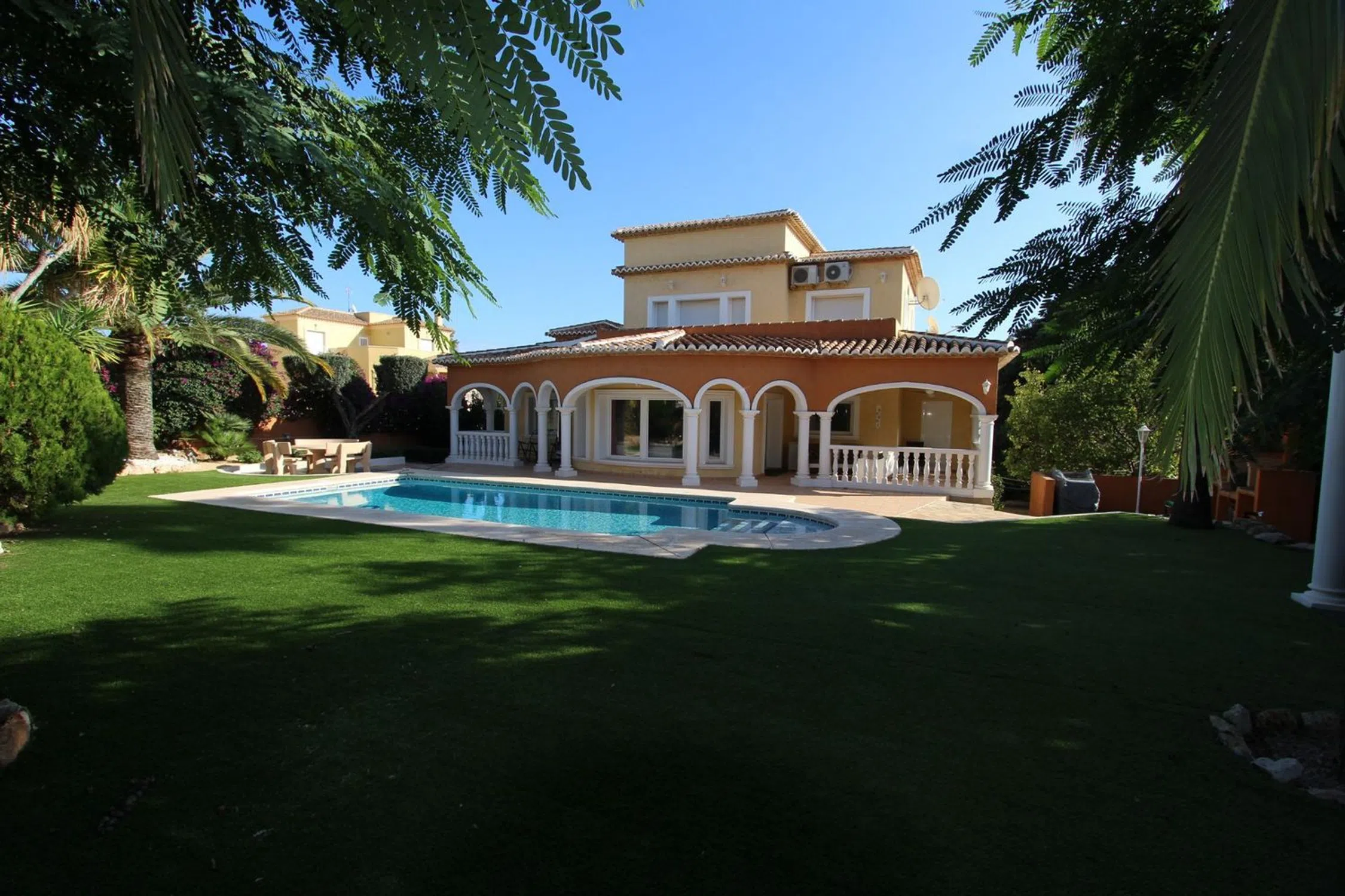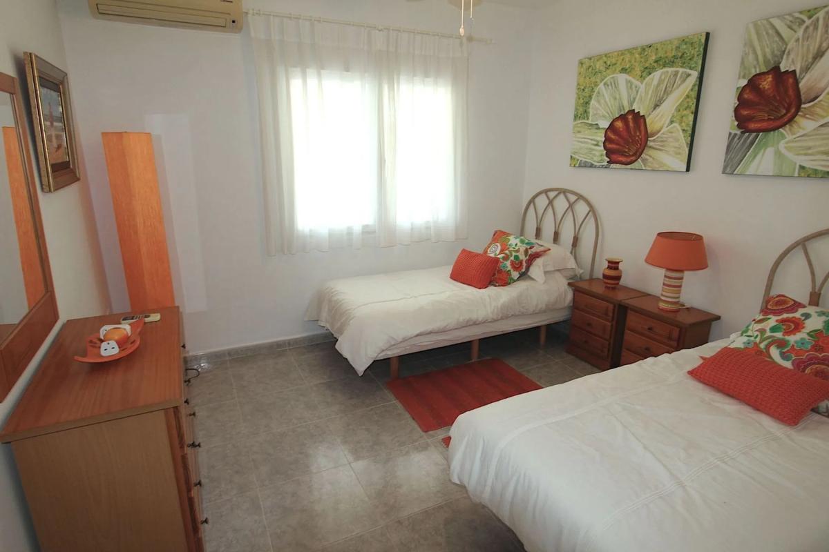 Fantástica ubicación en una zona privilegiada a un paso de la playa y de todos los servicios. La Villa esta construida en una parcela plana de excelente construcción y con amplias estancias. La vivienda se distribuye en dos alturas; en la parte principal consta de un hall, un pequeño trastero, 2 dormitorios amplios con armarios, baño completo, cocina independiente con una galería, amplio y luminoso salón comedor con acceso a la encantadora terraza cubierta desde donde se accede a la maravillosa piscina rodeada de un excelente jardín con césped; en la parte superior nos encontramos con 2 dormitorios muy amplios con sus armarios empotrados y 1 baño (en-suite). Esta vivienda es muy cómoda para vivir todo el año, o como inversión para alquilar en la temporada de verano por su situación. Merece la pena visitarla! . [IW].