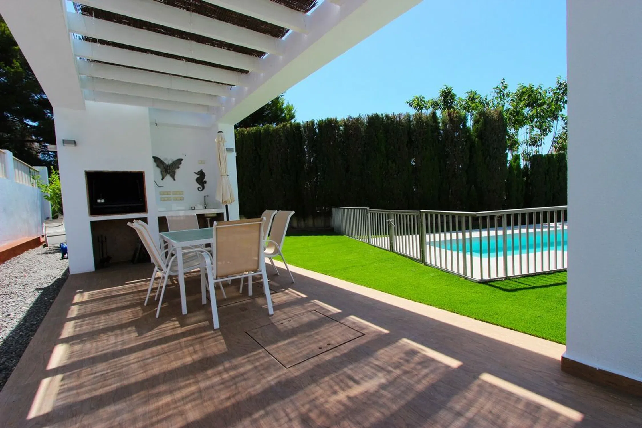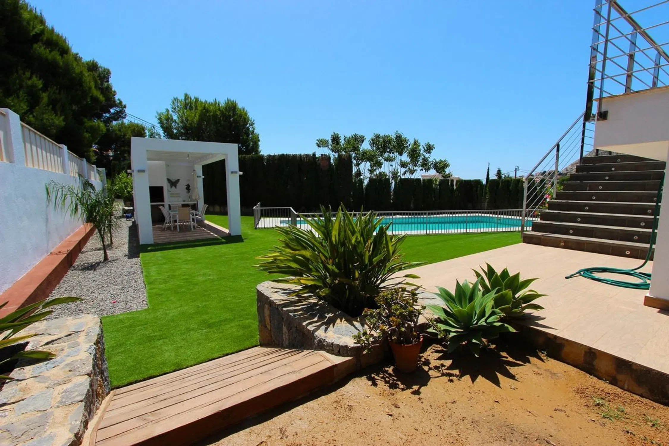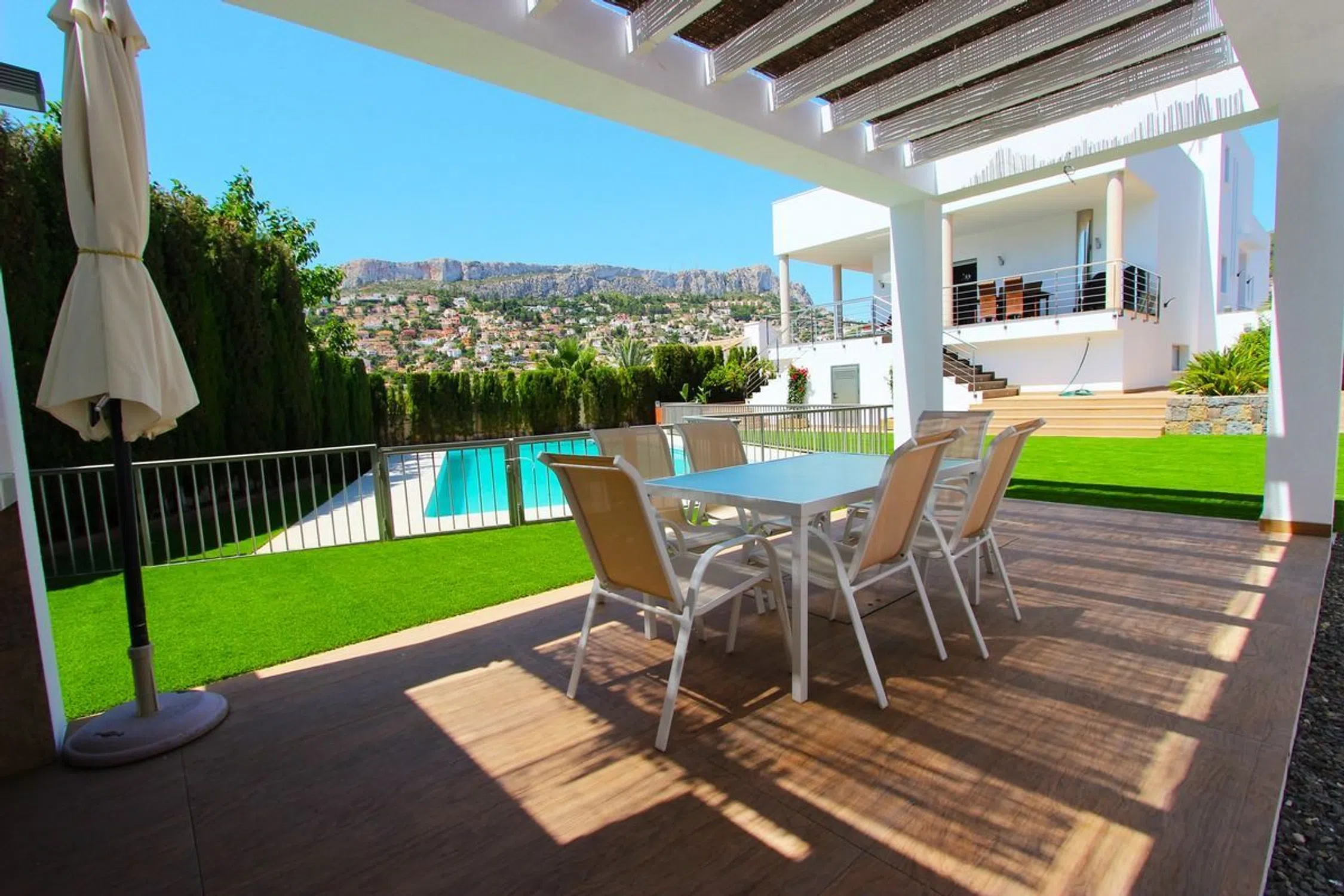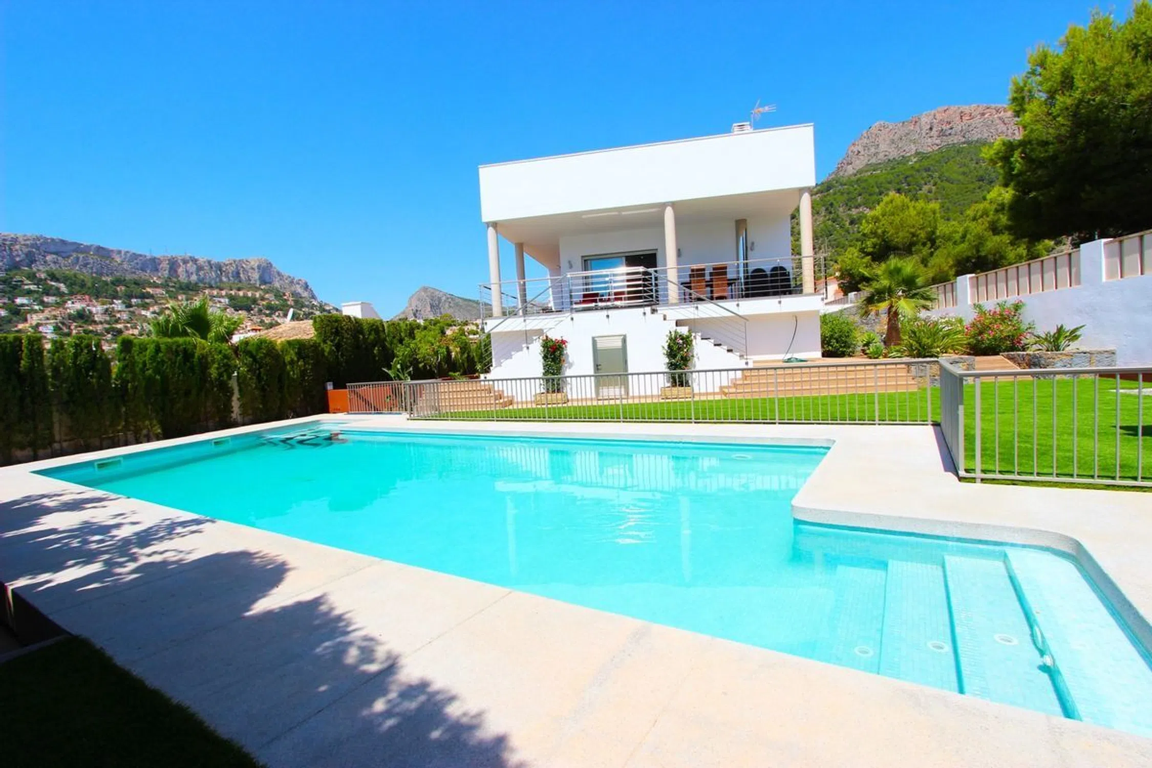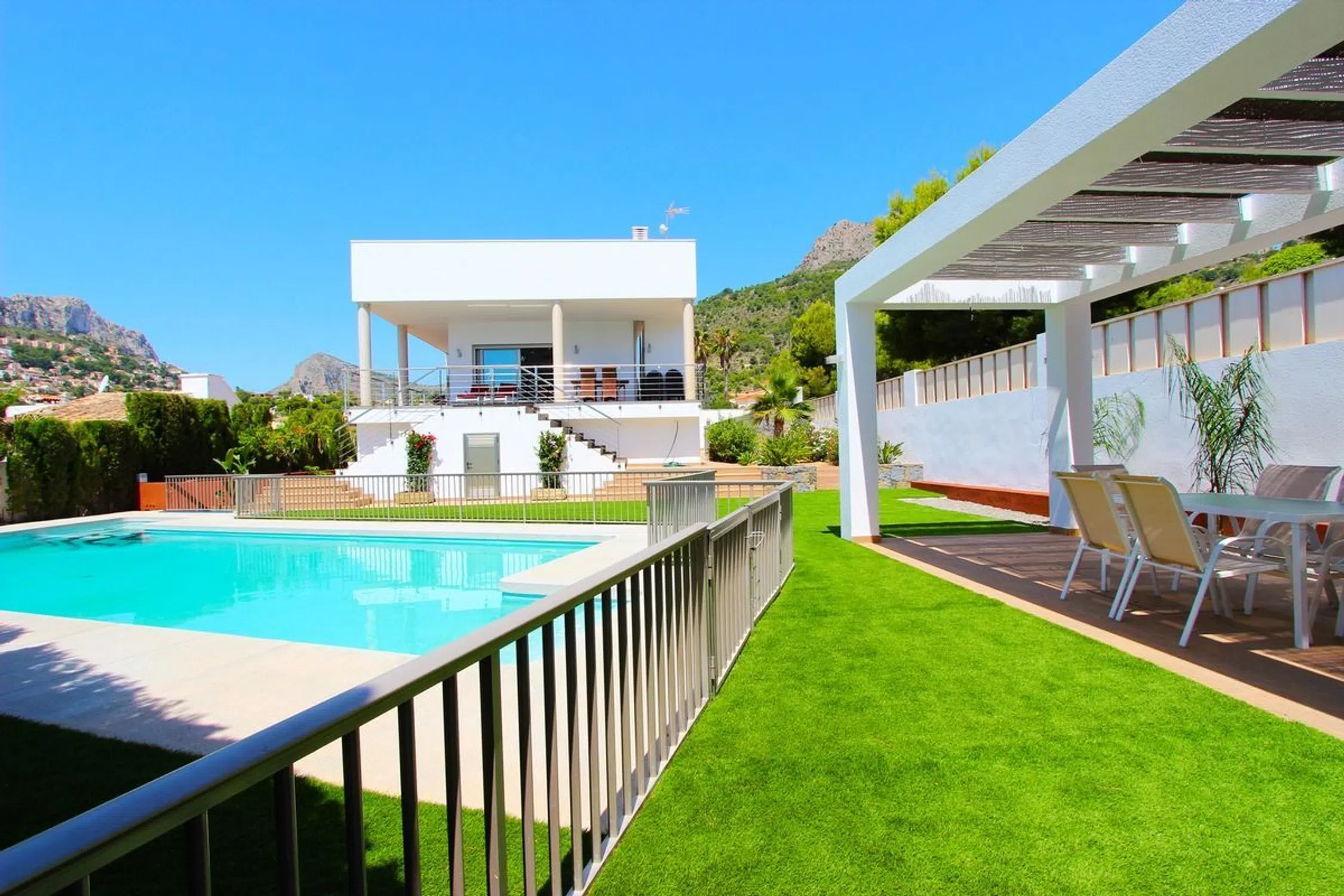 Impresionante villa de lujo con piscina privada ubicada en Calpe de 5 dormitorios y 3 baños en dos plantas. PLANTA PRINCIPAL Consta de un gran salón con acceso a la terraza cubierta y la piscina. Amplia cocina independiente totalmente equipada, 2 habitaciones dobles con cama de matrimonio, una de ellas con baño en suite. Dos dormitorios con dos camas individuales cada uno y otro baño. La PLANTA ALTA consta de un amplio dormitorio con cama de matrimonio, un baño con ducha en suite y acceso al solárium con bonitas vistas a la piscina y al mar. La villa tiene aire acondicionado en el salón y todos los dormitorios. EXTERIOR: Hermosa piscina salada de 11x5 con escalera romana y ducha exterior. Hay una pérgola con barbacoa incorporada y también hay un aseo exterior. Hay parking en la misma parcela para 3 vehículos y garaje cerrado de 260m2 [IW].