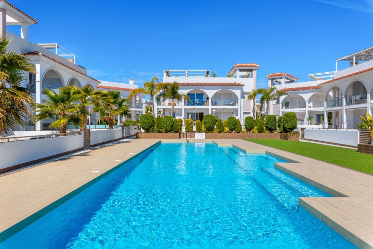 The expansive garden offers plenty of room for both dining tables and sun loungers, making it a perfect spot for outdoor relaxation. Residents can also enjoy a beautifully maintained communal pool, complete with an outdoor shower. Surrounding the pool, well-kept artificial grass creates a serene environment, exclusively for the benefit of residents. Additionally, the apartment comes with an outdoor parking space within the property grounds.