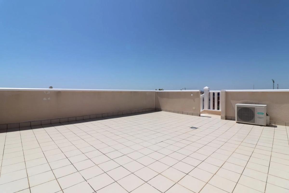 Este apartamento esquinero de dos dormitorios y última planta, con orientación suroeste, en Doña Pepa, se encuentra en un codiciado complejo residencial cerrado e impecablemente mantenido, a solo 5-10 minutos a pie de bares y restaurantes, con las principales cadenas de supermercados y una tienda de muebles JYSK a unos 15 minutos. El campo de golf La Marquesa en Rojales, así como las localidades de Benijófar y Quesada, se encuentran a 5-10 minutos en coche, mientras que las hermosas playas están a solo 10 minutos en coche. Con una atractiva ubicación esquinera, este impecable apartamento de 76 m² ofrece un luminoso salón diáfano con puertas correderas de doble acristalamiento que dan a una amplia terraza. Dispone de cocina equipada, dos dormitorios dobles con armarios empotrados y un baño familiar. Desde la terraza, unas escaleras exteriores conducen a un impresionante solárium privado de aproximadamente 60 m², con trastero (con conexión para posible uso como lavadero), fregadero empotrado, barbacoa y magníficas vistas abiertas al lago salado, perfecto para disfrutar de espectaculares puestas de sol. Los extras incluyen plaza de aparcamiento subterráneo y aire acondicionado. El impresionante complejo cuenta con tres piscinas comunitarias de diseño elegante, una piscina infantil, elementos decorativos como una fuente y varias zonas ajardinadas con palmeras. Ubicada en la Costa Blanca Sur, esta propiedad combina comodidad, estilo y una ubicación privilegiada cerca de todos los servicios.