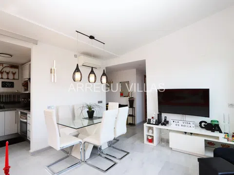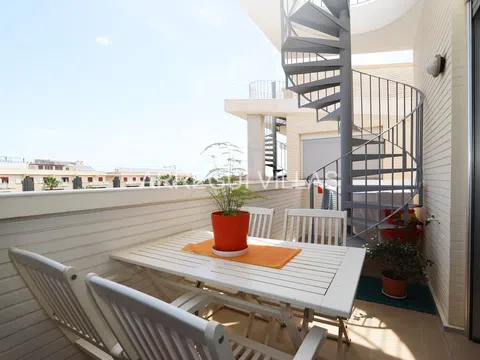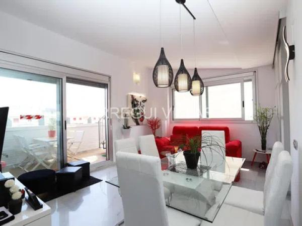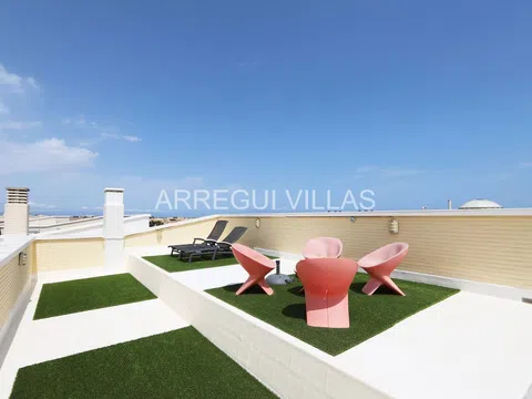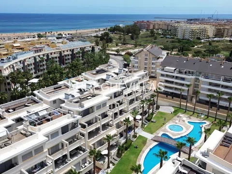 Os presentamos un magnífico ático con espectaculares vistas al mar y la montaña, además de un amplio solárium para disfrutarlo durante todo el año. Este ático se encuentra en una urbanización exclusiva que ofrece servicio de conserje durante todo el año, dispone de sauna, área de juegos para niños, un gimnasio, una sala de ordenadores, extensos jardines y una gran piscina. Gracias a su ubicación y características, esta propiedad es ideal tanto para vacaciones como para residencia habitual. Está situada a unos 800 metros del centro de Dénia, lo que permite desplazarse sin necesidad de utilizar vehículo, y a tan sólo 300 metros de la playa de arena, a la que se puede llegar con un agradable paseo. La vivienda ha sido actualizada en 2023 con acabados de alta calidad. La distribución es la siguiente: Accedemos a través de un hall de entrada, salón-comedor con acceso a la terraza, una cocina completamente equipada e independiente, tres dormitorios dobles con armarios empotrados y dos baños completos (El dormitorio principal con baño en suite). La terraza principal tiene acceso, mediante una escalera de caracol, a un solárium con césped artificial, perfecto para disfrutar de las vistas y relajarse. Equipamiento: Pavimentos de mármol, aire acondicionado frío/calor por splits marca Mitsubishi, carpintería exterior con doble acristalamiento, persianas, armarios empotrados, video portero, ascensor y trastero, este ático también cuenta con dos amplias plazas de garaje incluidas en el precio. Construido en 2005 en una zona residencial tranquila y próxima a todos los servicios y comodidades, este ático es ideal para disfrutar de vacaciones relajantes en la costa mediterránea. ¡Recomendamos la visita!