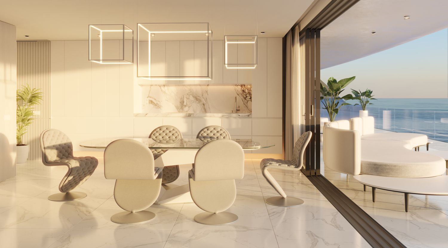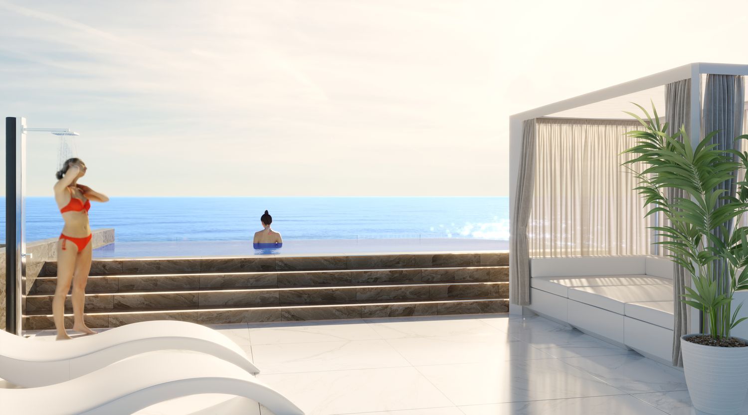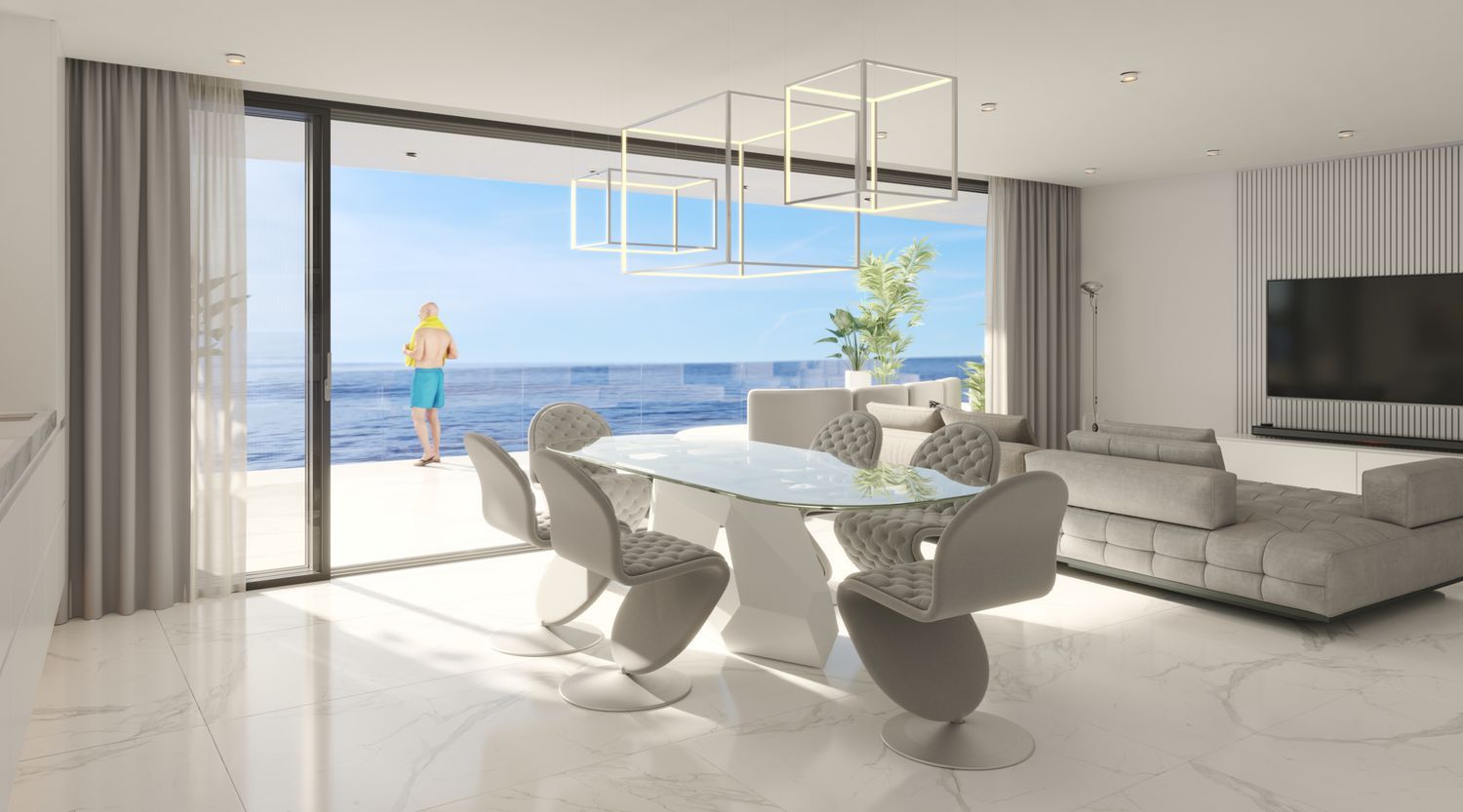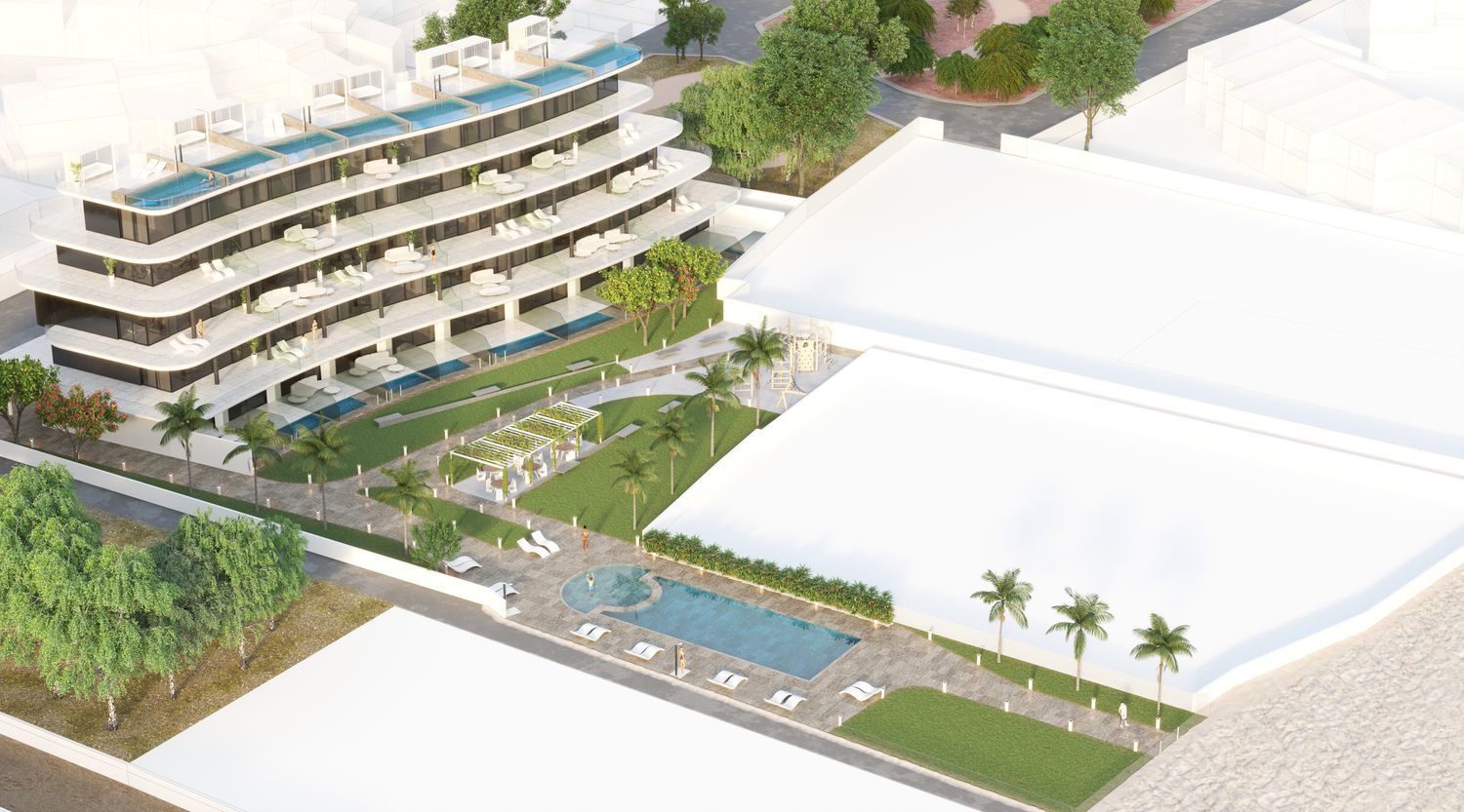 Ground-floor residences and penthouses differ from the first and second floors, featuring duplex layouts complete with private pools on their terraces. The complex includes underground parking for 30 vehicles, a large communal pool, a children's play area, a paddle tennis court, a gym, and direct private access to the beach.