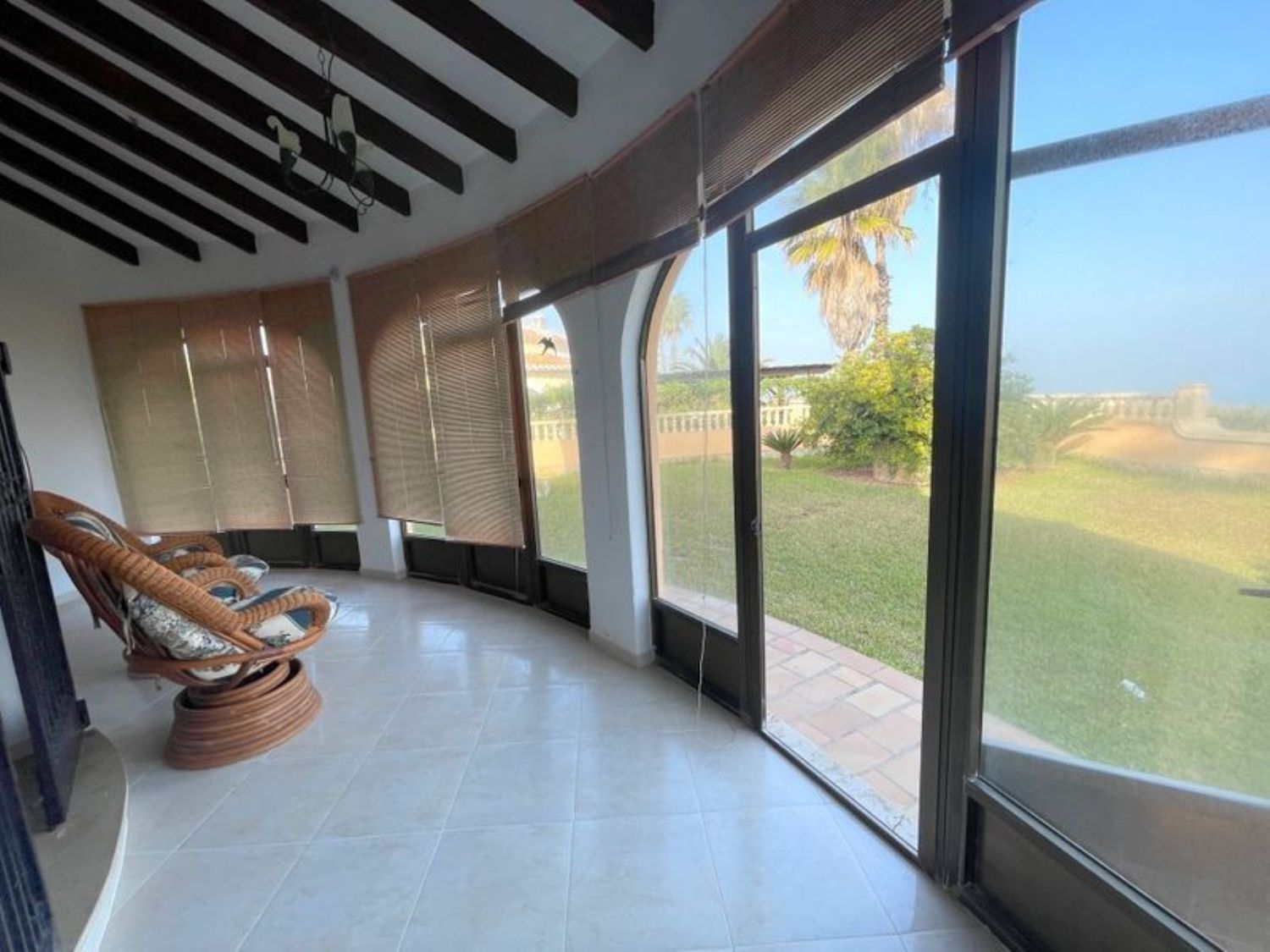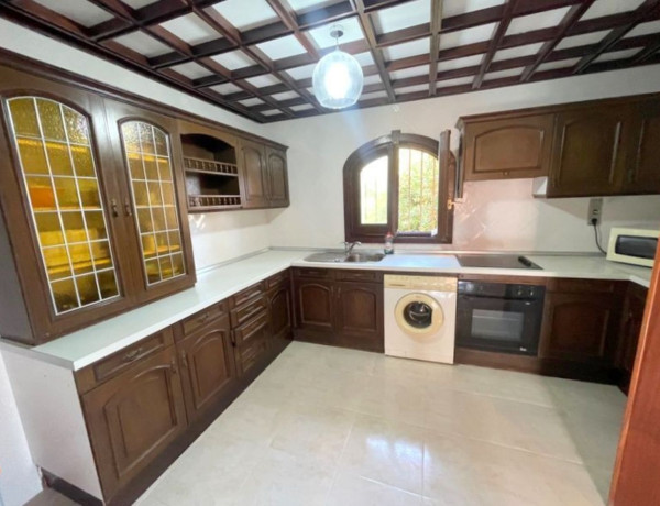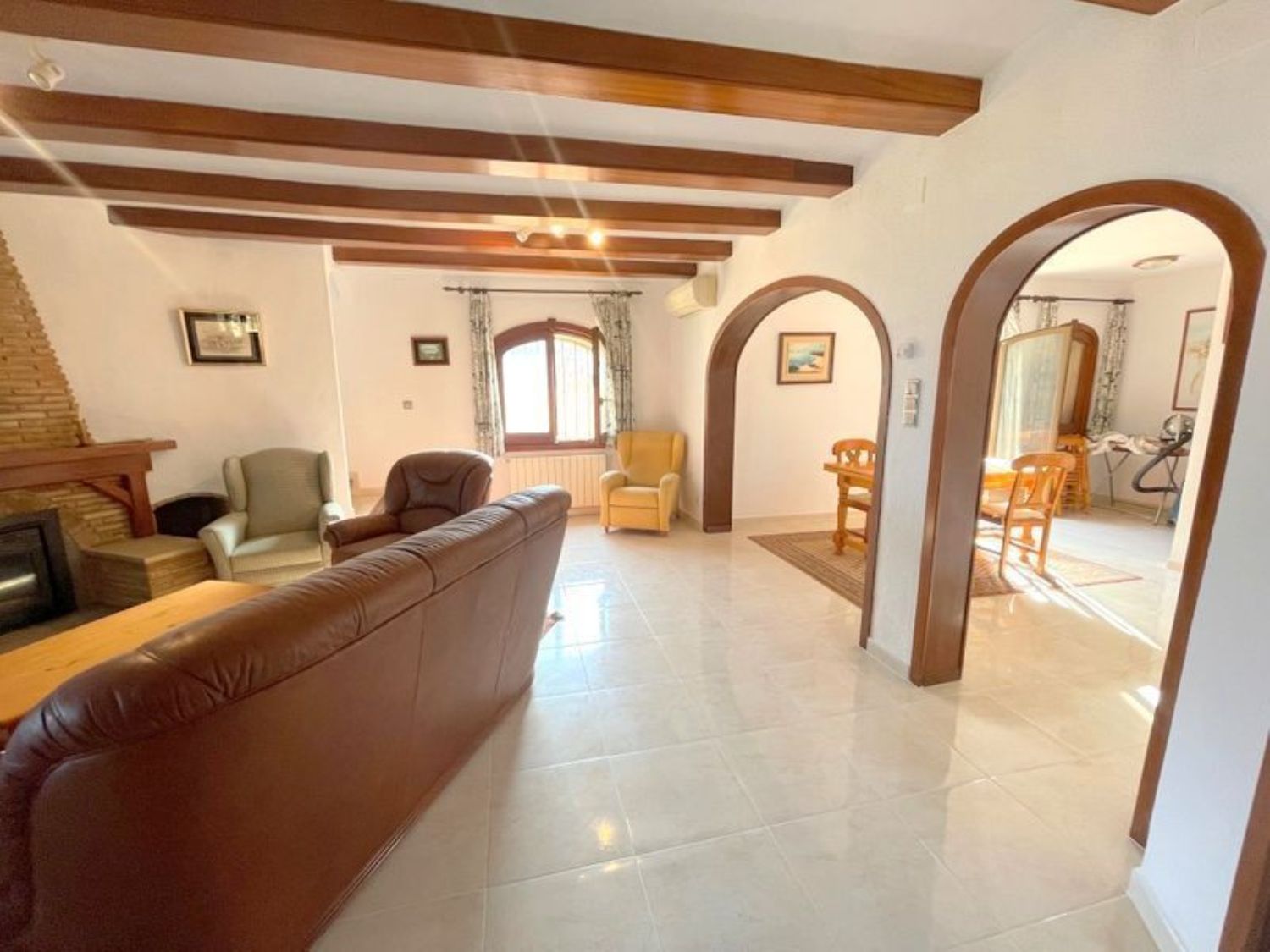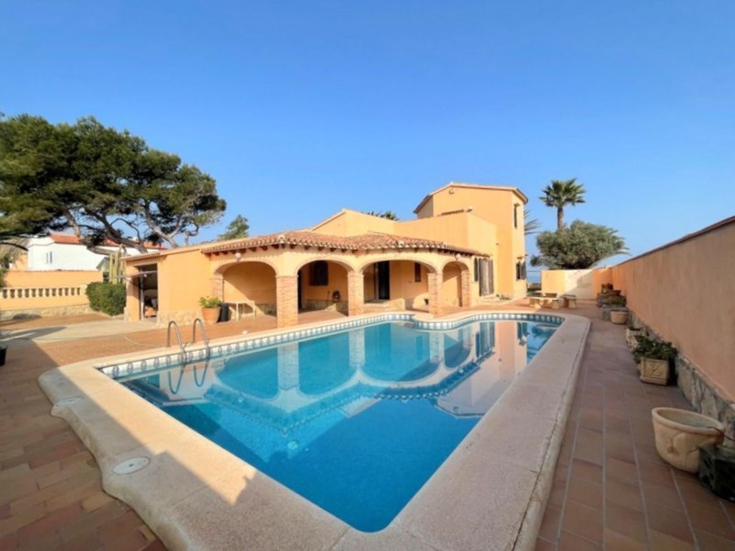 The property features three spacious bedrooms and two bathrooms, including an en-suite bathroom in the master bedroom. A cozy living room with a fireplace complements a bright dining area. The kitchen is well-furnished, and there is a glass-enclosed porch offering stunning sea views, alongside another porch and a rear area overlooking the pool, complete with additional sun terraces. An expansive garage and a storage room provide ample space. The home is equipped with both heating and air conditioning, ensuring year-round comfort. The exterior boasts a beautifully illuminated pool with an outdoor shower, and the property benefits from a private water well and automatic irrigation system. High-quality double-glazed windows and wooden finishes enhance the overall appeal.