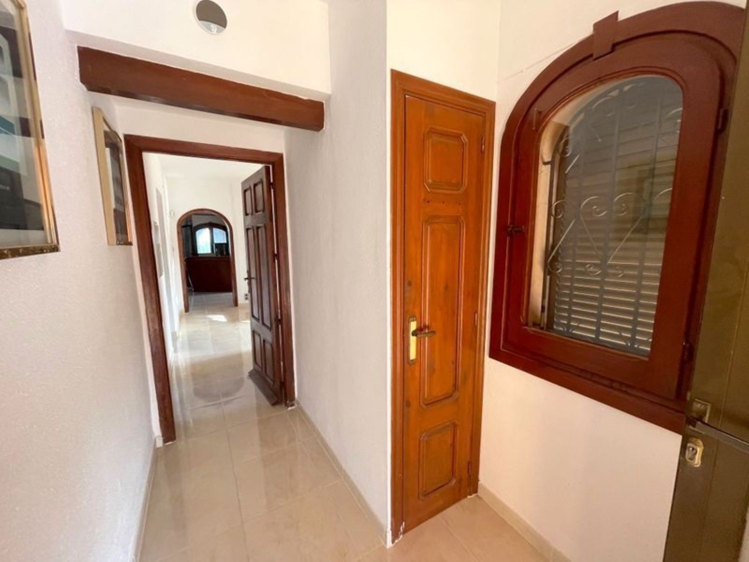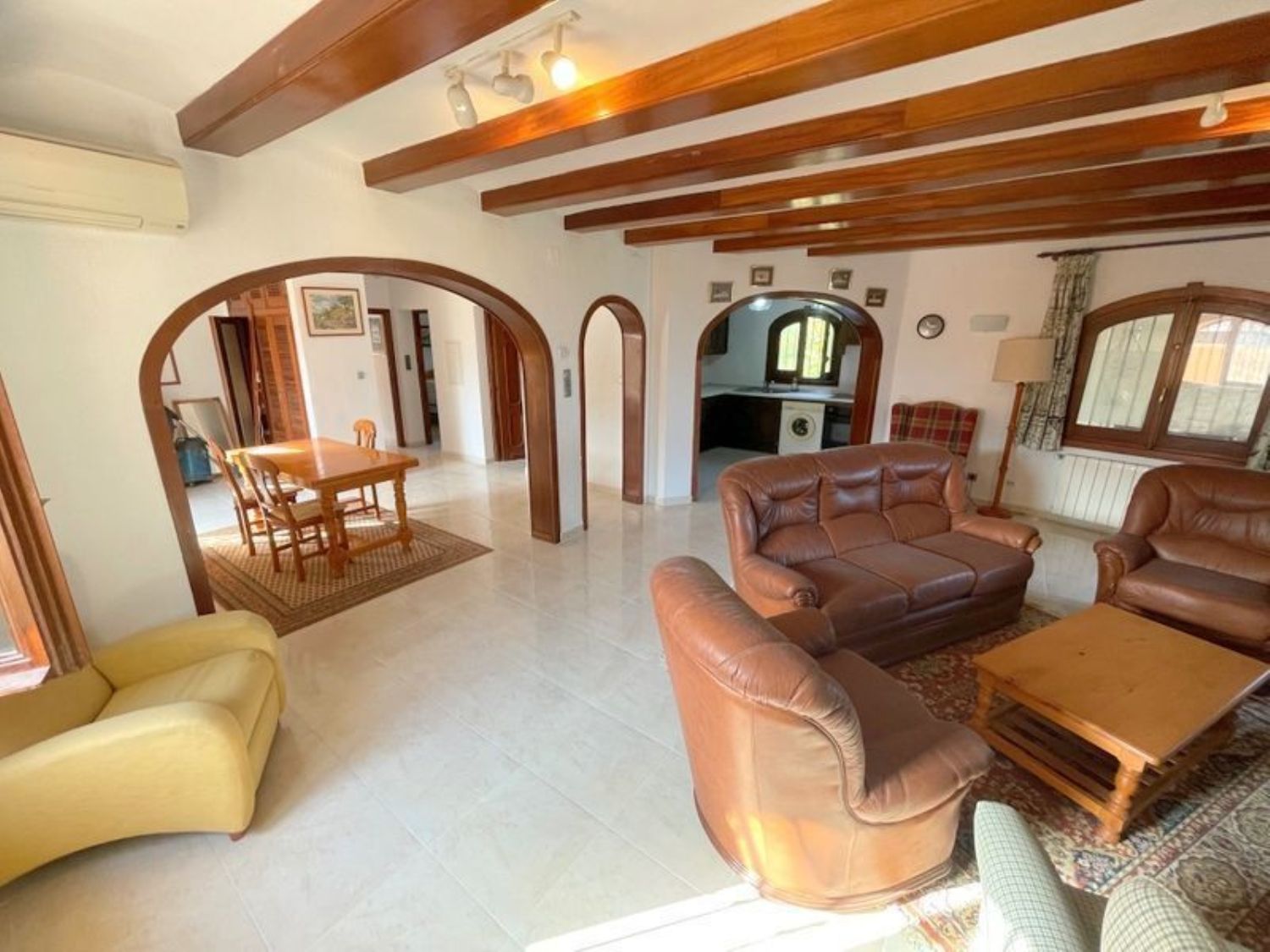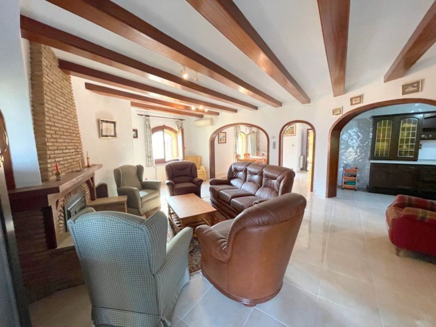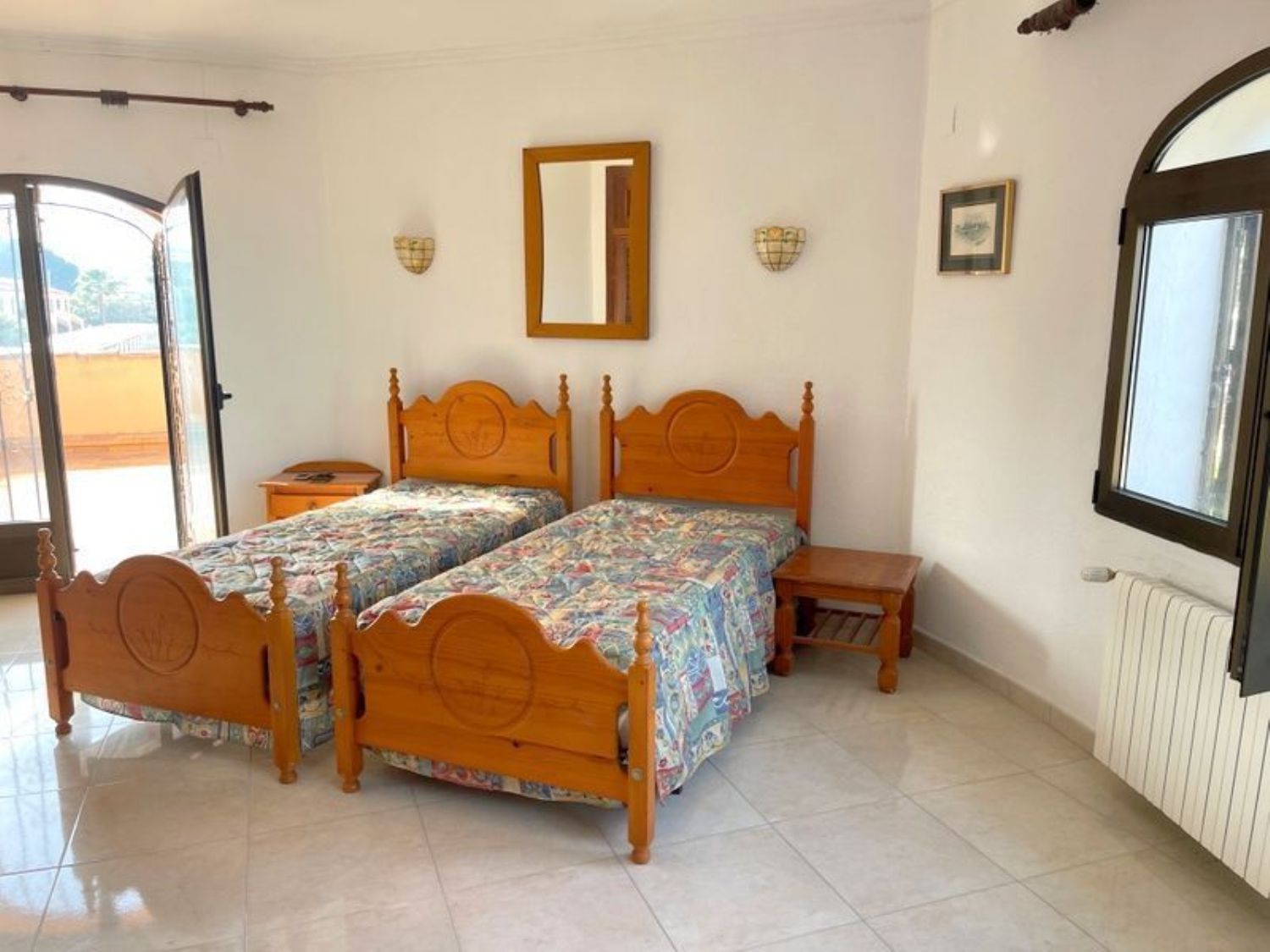 The property features three spacious bedrooms and two bathrooms, including an en-suite bathroom in the master bedroom. A cozy living room with a fireplace complements a bright dining area. The kitchen is well-furnished, and there is a glass-enclosed porch offering stunning sea views, alongside another porch and a rear area overlooking the pool, complete with additional sun terraces. An expansive garage and a storage room provide ample space. The home is equipped with both heating and air conditioning, ensuring year-round comfort. The exterior boasts a beautifully illuminated pool with an outdoor shower, and the property benefits from a private water well and automatic irrigation system. High-quality double-glazed windows and wooden finishes enhance the overall appeal.