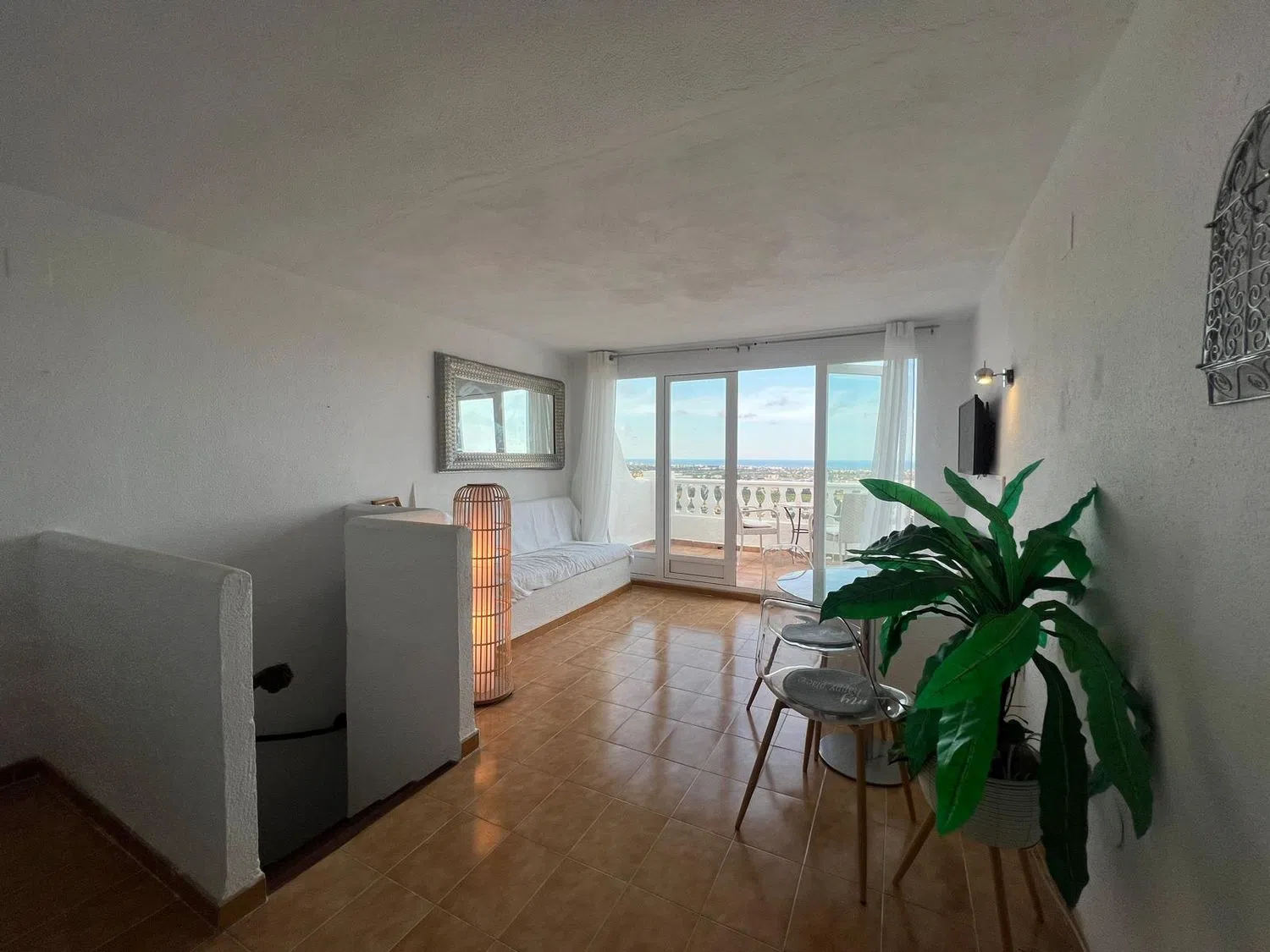 From this inviting space, access to a lovely terrace offers breathtaking panoramic views of the sea and mountains, making it an ideal spot for outdoor enjoyment. Also located on this floor is a master bedroom equipped with built-in wardrobes, along with a complete bathroom.