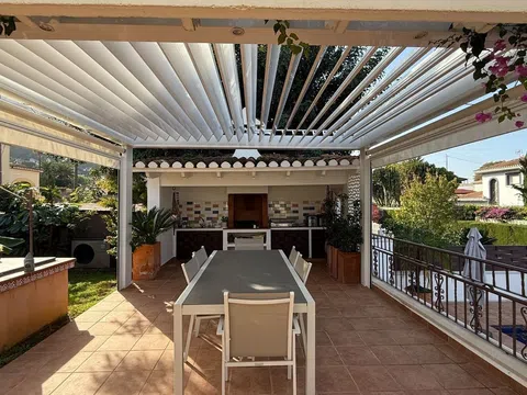 RANDOF Real Estate con oficinas ubicadas en Dénia, Jávea y Moraira les ofrece esta villa independiente ubicada en Denia en un callejón sin salida. La villa está a solo un paso del centro de la ciudad de Denia, la playa, bares y restaurantes. Esta villa de estilo mediterráneo está construida sobre una parcela de 830 m2 y recientemente reformada por completo. La propiedad se distribuye en dos plantas. Entrando en la planta baja por un bonito recibidor, se accede al amplio salón comedor con chimenea y a la cocina abierta totalmente equipada con isla de cocción. En esta planta hay tres habitaciones dobles. Un baño con jacuzzi y el dormitorio principal tiene su baño privado en suite con amplia zona de ducha. Todas las habitaciones son muy amplias con aire acondicionado frío-calor por zona Air, grandes armarios empotrados, ventanas de doble acristalamiento, mosquiteras y persianas. La escalera interior nos lleva al sótano donde encontramos un apartamento de invitados completo con entrada privada, salón comedor, cocina abierta, tres habitaciones dobles con armarios empotrados, dos baños con ducha, varios trasteros y acceso al garaje. En el exterior hay una terraza cubierta con vistas al mar, piscina y montaña. La piscina tiene agua salada, cubierta eléctrica y se puede calentar. La cocina exterior está totalmente equipada con agua y electricidad y todo el confort que necesitas. En este lado encontramos una gran terraza con pérgola eléctrica que cubre la zona de comedor. La villa ha sido recientemente reformada y cuenta con doce paneles solares, una bomba de calor con Air zone, dos bombas de calor extra para la producción de 200 litros de agua caliente, así como toda la electricidad de la casa ha sido renovada. El jardín es de fácil mantenimiento, para regar hay un depósito de agua independiente con una capacidad de 48 m3 y el jardín tiene un sistema de riego automático. Además, la villa cuenta con domótica, sistema de alarma y cámaras de vigilancia en el exterior. Hay mucho espacio de aparcamiento, un amplio aparcamiento cubierto para varios coches y garaje. Esta villa es un lugar perfecto para vivir todo el año y disfrutar del estilo de vida mediterráneo. Situado a sólo un par de minutos de Denia con sus playas de arena, cerca de las tiendas, tres supermercados y varios bares y restaurantes. La propiedad está situada en la Costa Blanca con sus 244 km de playas de arena blanca y un clima saludable ideal con más de 300 días de sol al año y una temperatura media de más de 20 grados. Denia, la capital de la Costa Blanca, ofrece a sus habitantes e invitados una rica oferta cultural, naturaleza pura en sus playas de arena y roca, el Parque Natural del Montgó - el castillo de la ciudad de Denia y, no menos importante, su gastronomía, que ha sido premiada por la UNESCO, por lo que Dénia ahora es titulada "Ciudad de la Gastronomía Creativa". Denia está a una hora en coche de los aeropuertos de Valencia y Alicante, y a sólo 30 minutos de Oliva, Benidorm, Calpe y Moraira. [IW].