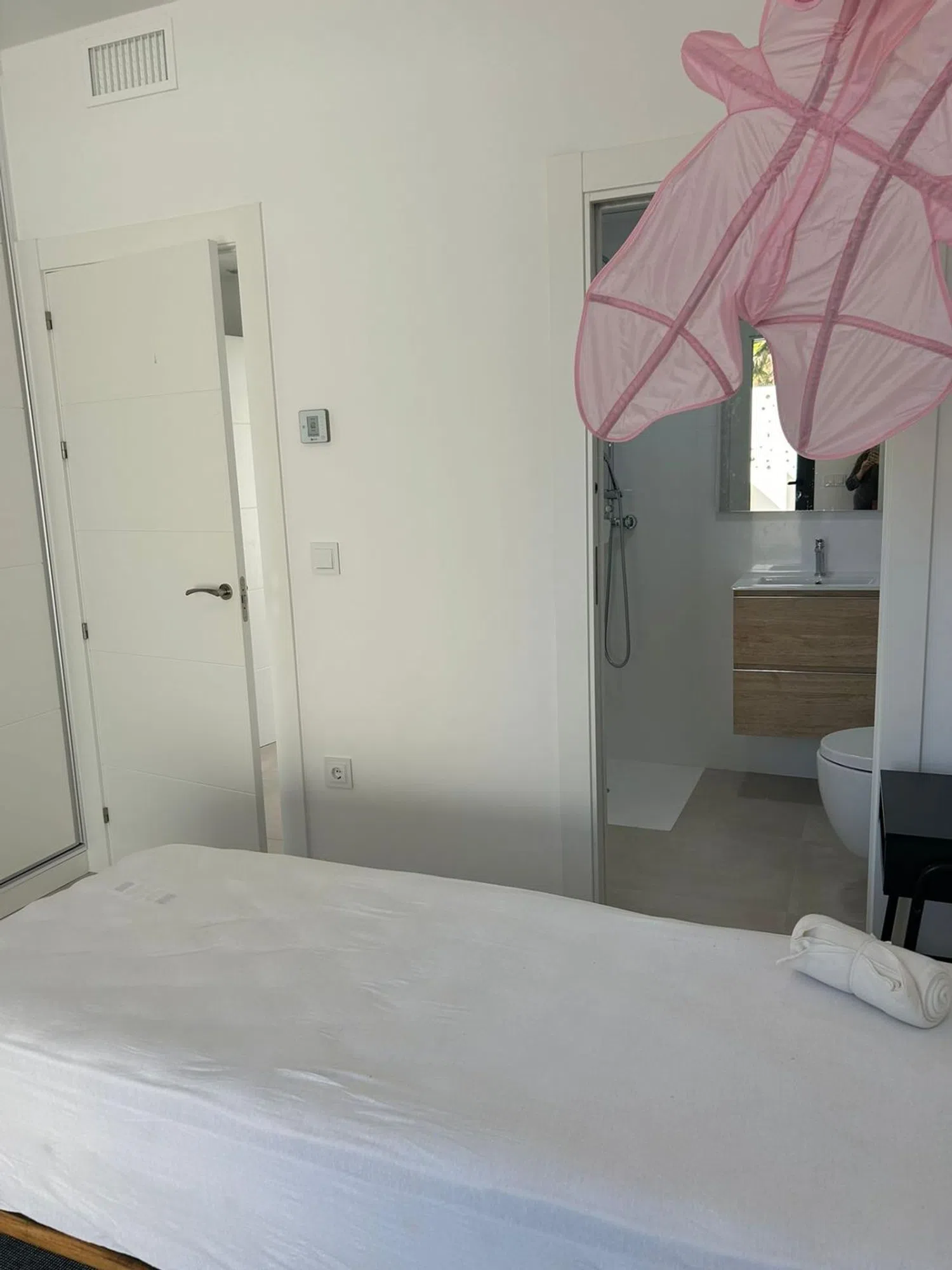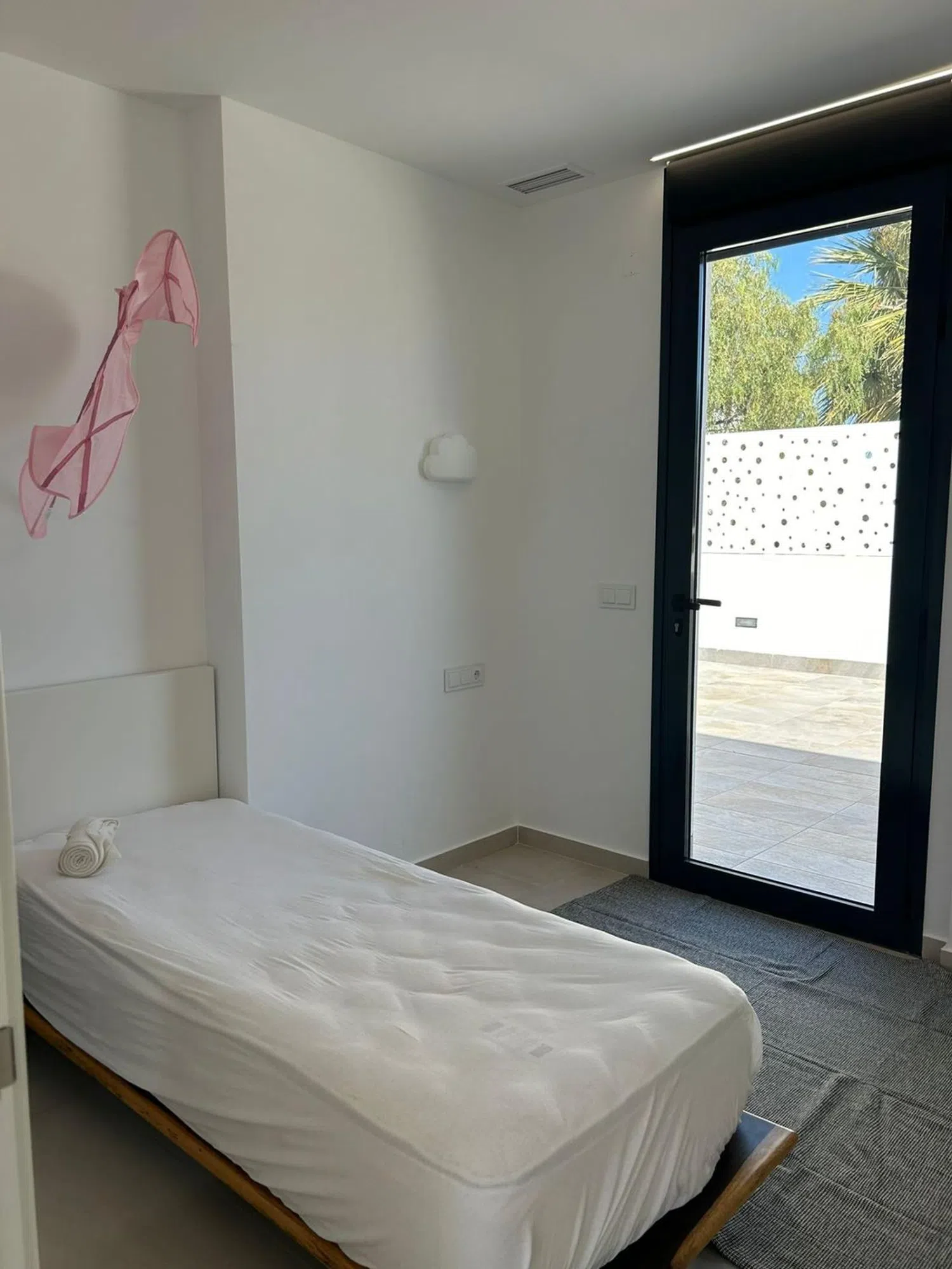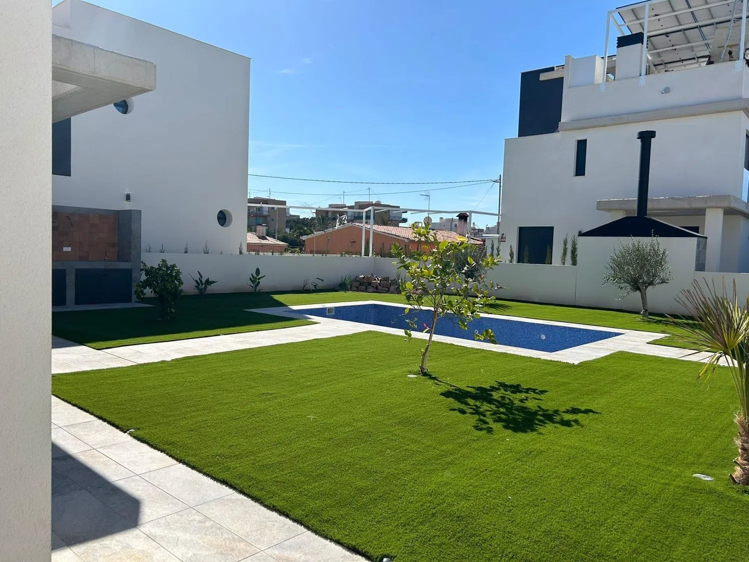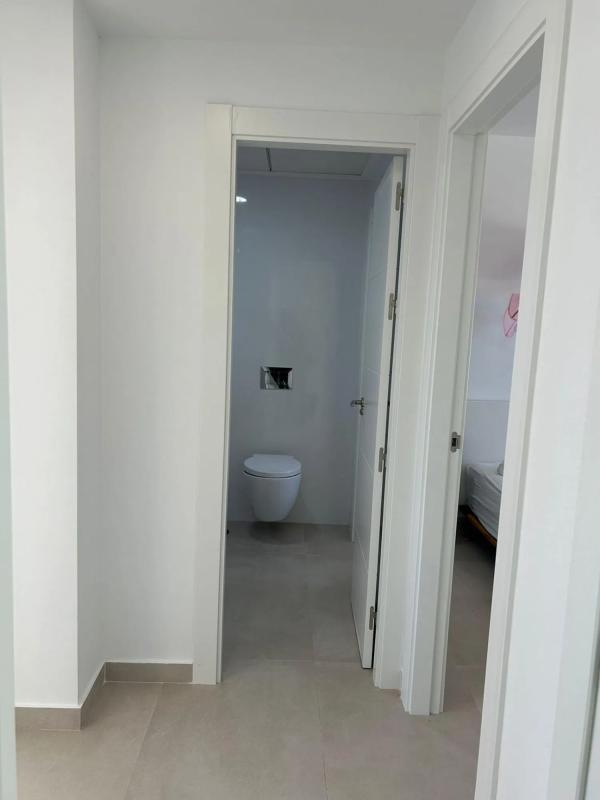 This modern villa, constructed with premium materials, features three levels and includes a private pool, a spacious 57 m² solarium, and a private garage, all nestled within a gated community of independent residences. The ground floor, surrounded by lush gardens, hosts the entrance and the inviting pool area. Inside, an open-concept living and dining area merges with a fully equipped kitchen, along with two bedrooms and two en-suite bathrooms. The upper floor is dedicated to the master suite, complete with its own bathroom and solarium access, offering breathtaking views of the mountains.