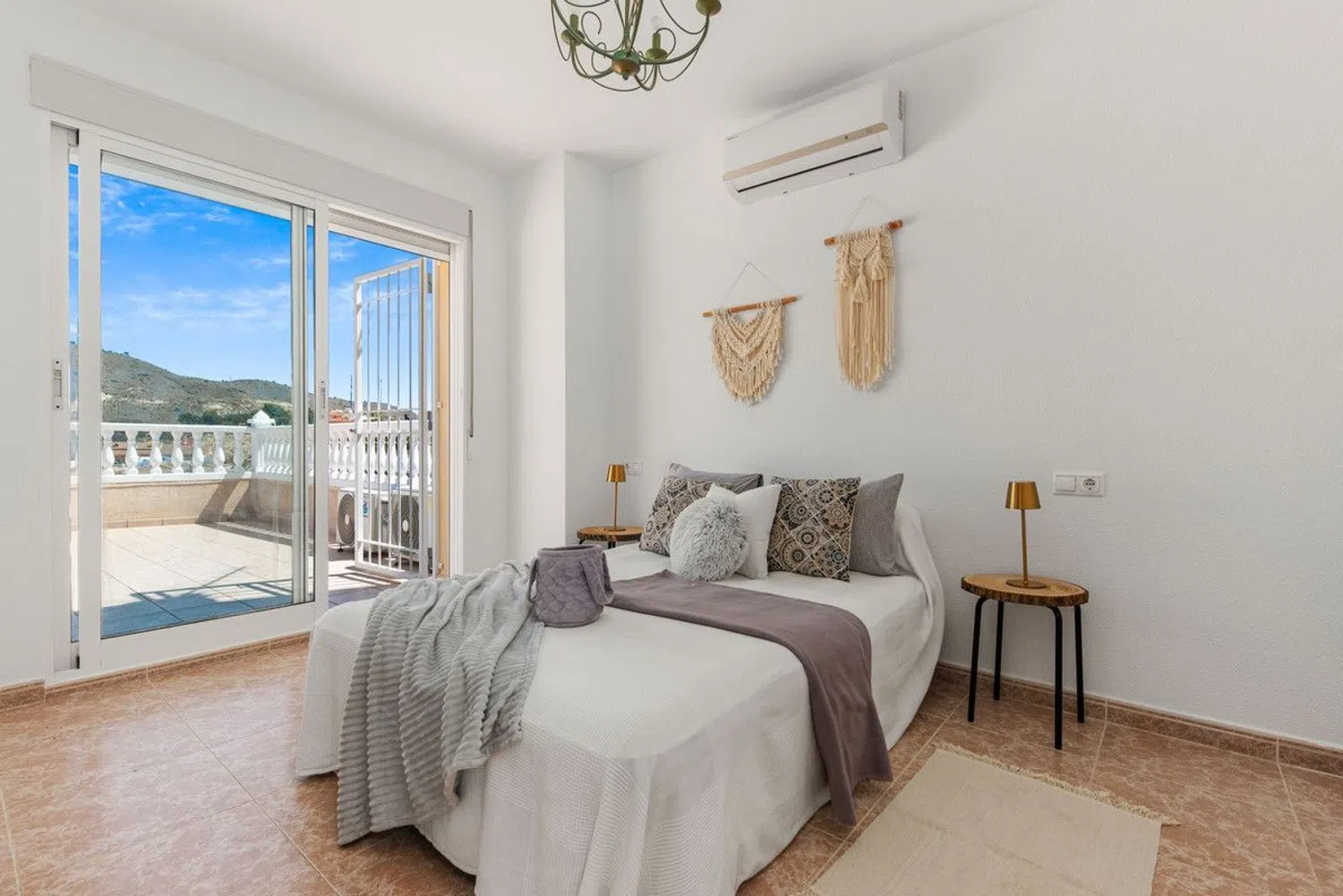Ascending to the upper floor, the luxurious master suite awaits, complete with an en-suite shower and private access to an open terrace with marvelous views of the sea and surrounding landscape. The villa faces southeast, ensuring a sunlit atmosphere throughout the day.