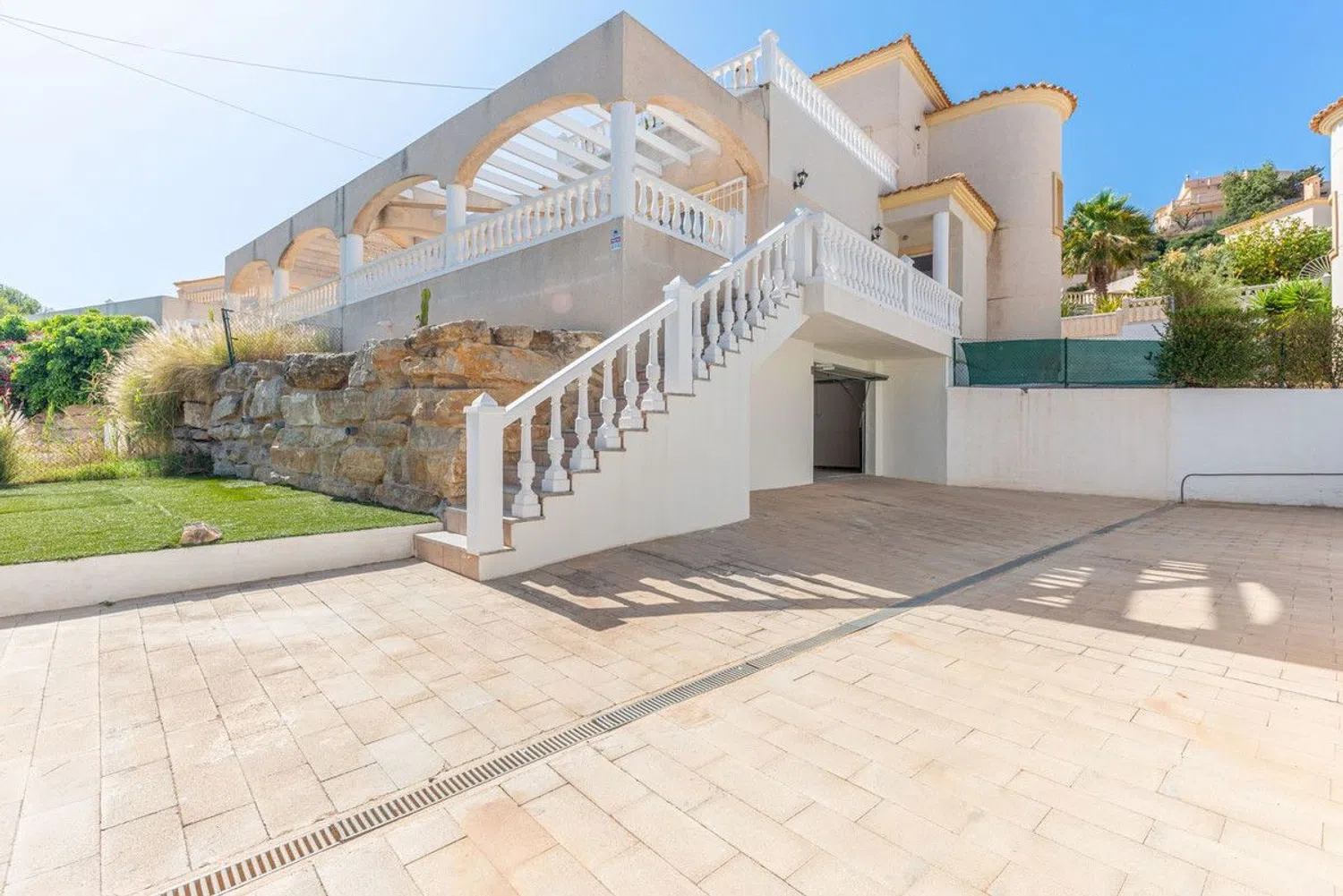 The villa's allure is enhanced by its proximity to a charming sandy cove, which is merely a 10-minute stroll away. The property boasts a generous plot and a spacious garage, ensuring ample space for vehicles. Access to the villa is granted via a peaceful residential road leading to the main entrance, which opens directly into the garage measuring 70 square meters.