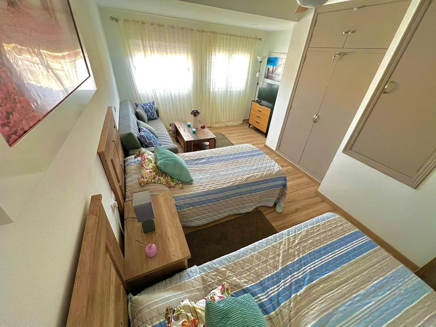 Two of the bedrooms are double-sized and offer ample space, with one providing exclusive access to another terrace. The chalet boasts two well-appointed bathrooms, both featuring bathtubs. Additional enhancements include double-glazed windows, elegant lacquered doors, stylish laminated flooring, and textured wall finishes. The bedrooms also come with built-in wardrobes and air conditioning, ensuring comfort year-round.