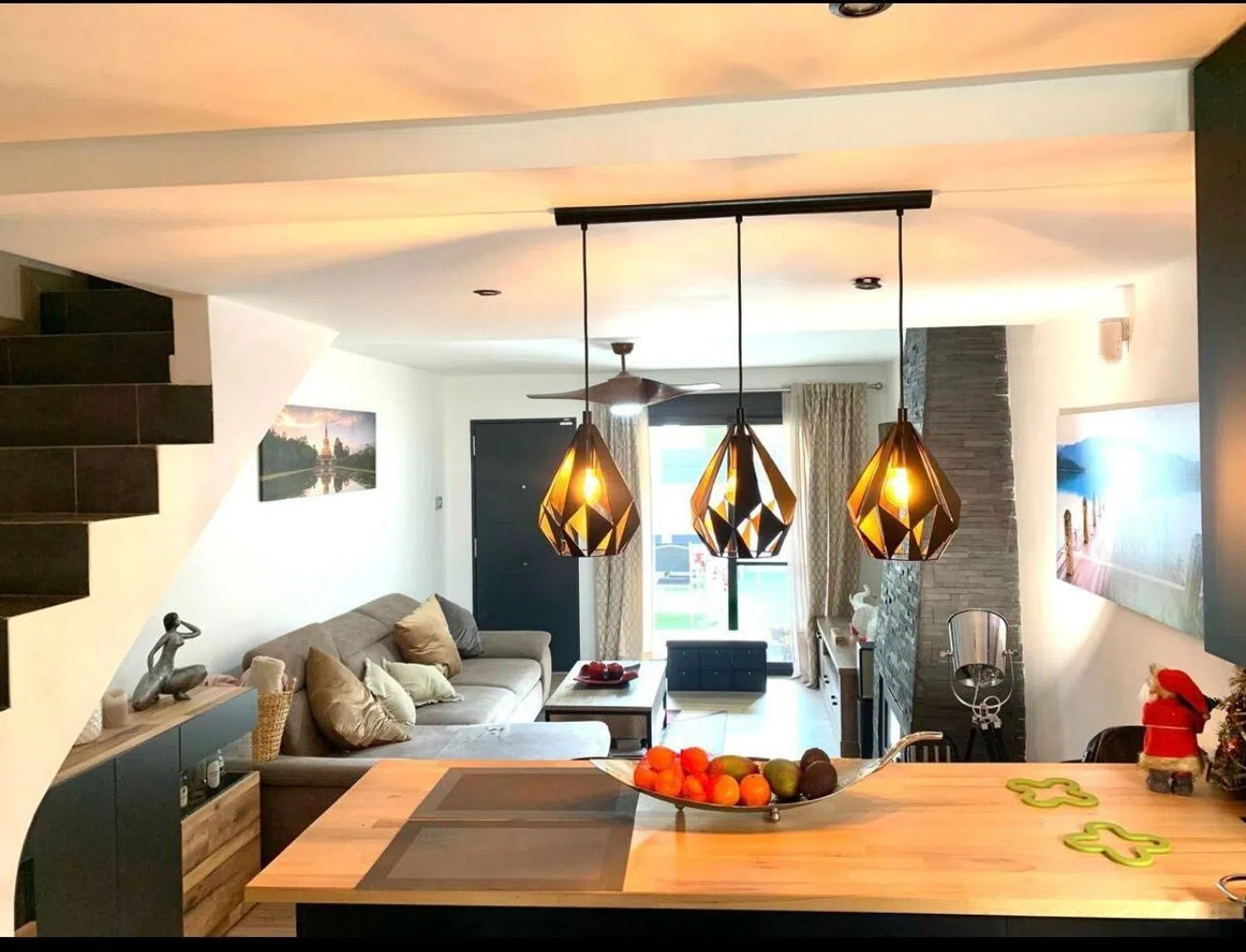 The bright living and dining area includes a cozy fireplace and opens onto one of the terraces, perfect for enjoying the Mediterranean climate. The modern, open-plan kitchen is equipped with an island and contemporary lighting, catering to both functionality and aesthetics.
