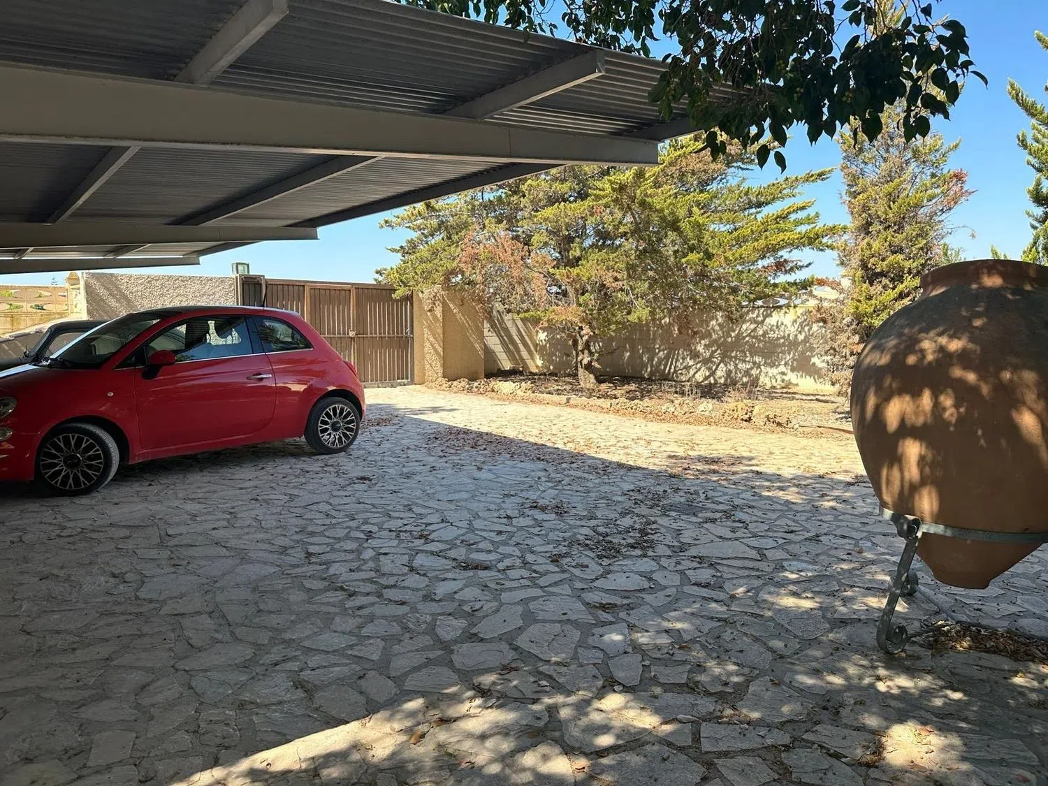 The basement spans 181 m² and is thoughtfully divided into two distinct sections. One area boasts a large living room, an American-style kitchen with a dining space, a wine cellar, a pantry, a double bedroom, and another bathroom with a shower. The other section is completely open, providing ample space for parking multiple vehicles, complete with an automatic door.