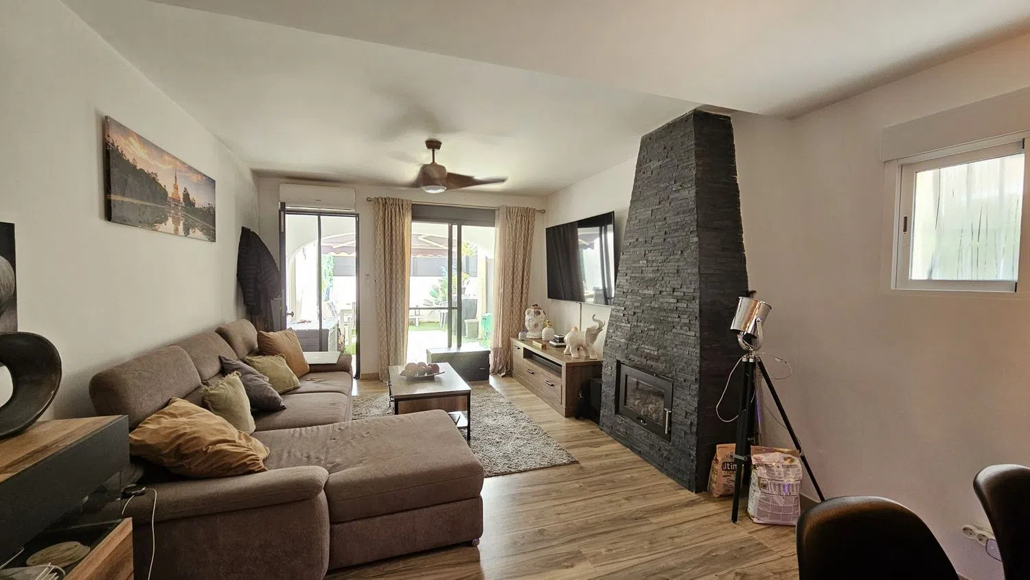 The community boasts a lagoon-style swimming pool and a children's playground, perfect for family enjoyment. Additional amenities include communal parking, a cozy wood-burning fireplace, electric heating, air conditioning, and double-glazed windows to ensure maximum comfort.