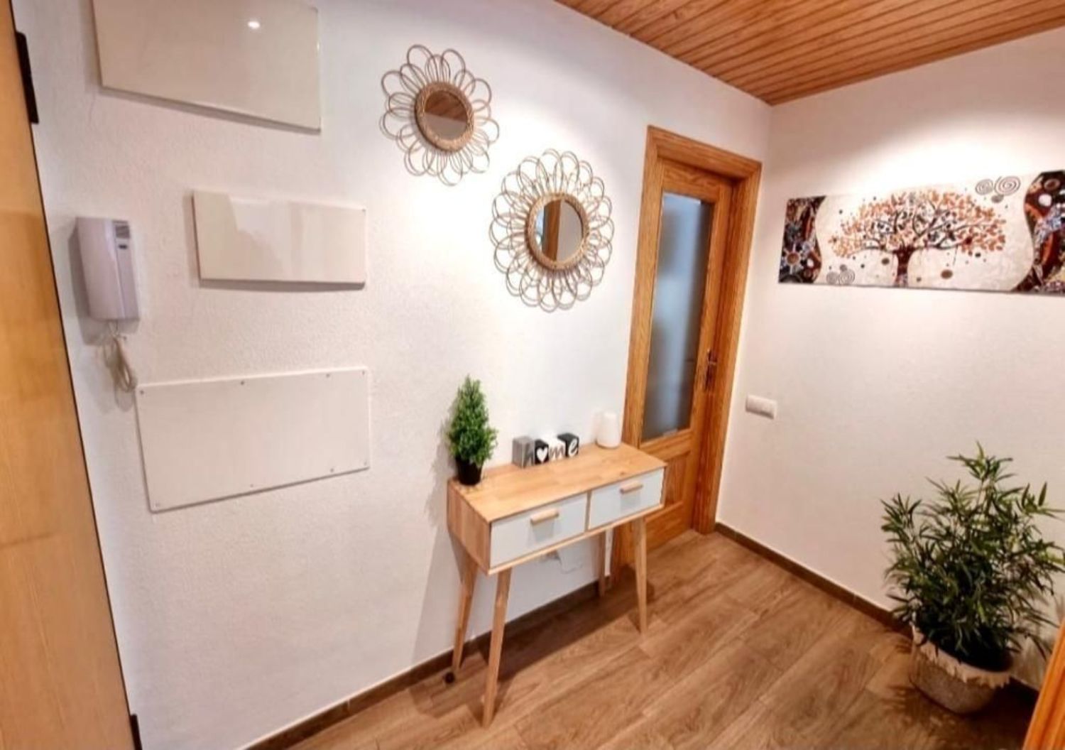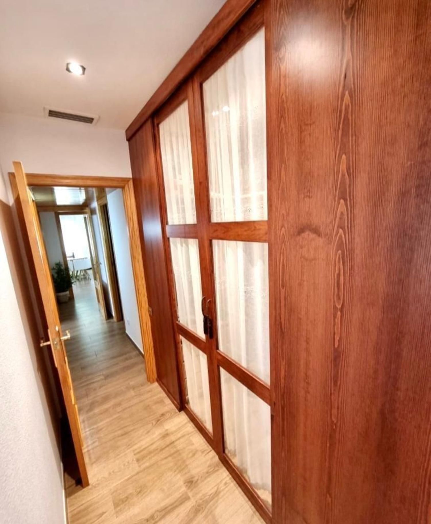 The interior includes a welcoming entrance hall, a spacious living-dining room that opens onto a balcony, and a generously sized independent kitchen equipped with white cabinetry and storage for laundry and cleaning supplies. There is also a guest bathroom and a comfortable suite featuring a dressing area and private bathroom. Additionally, a hallway loft offers convenient storage space for suitcases and other belongings, alongside two more bedrooms.