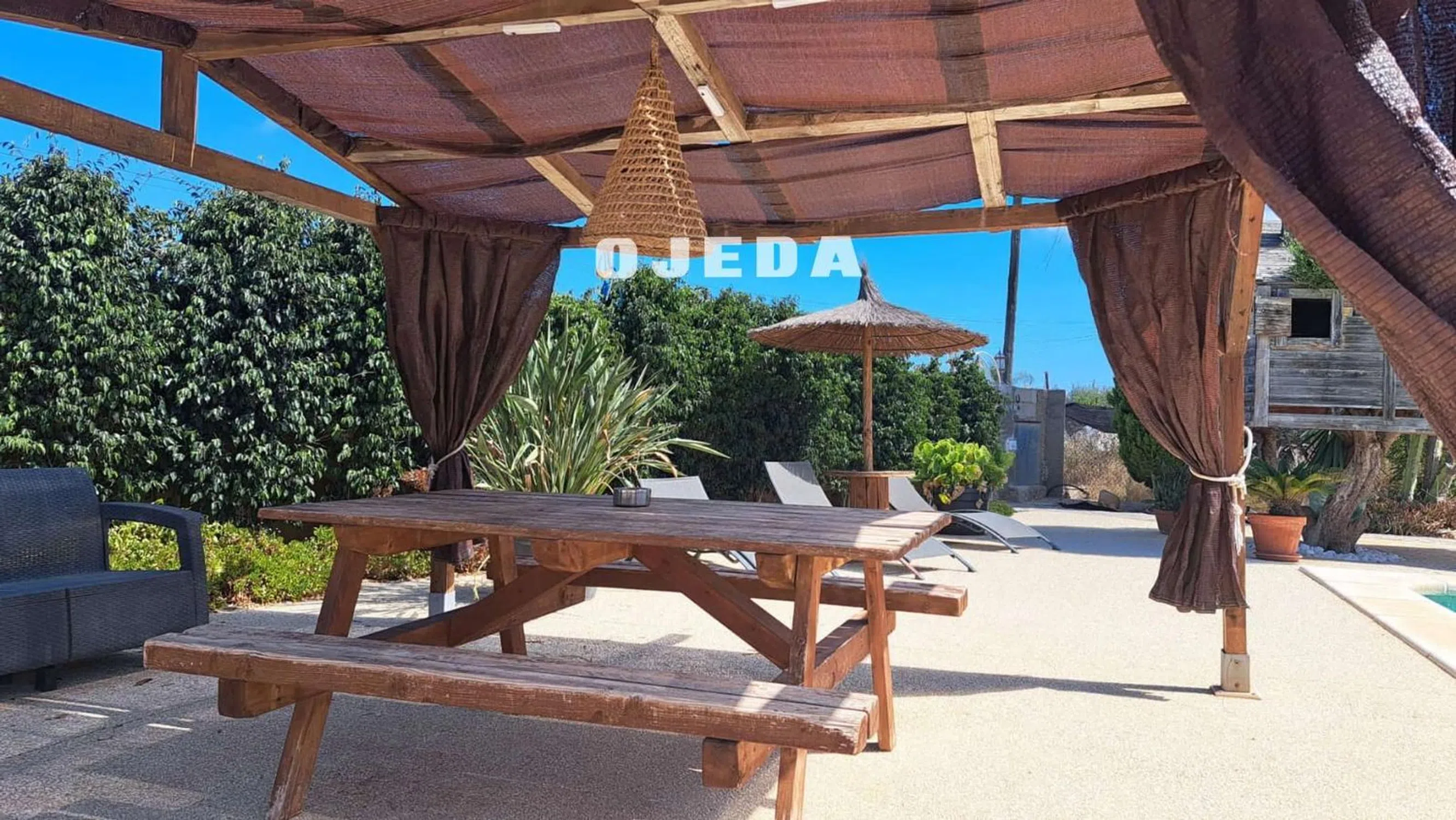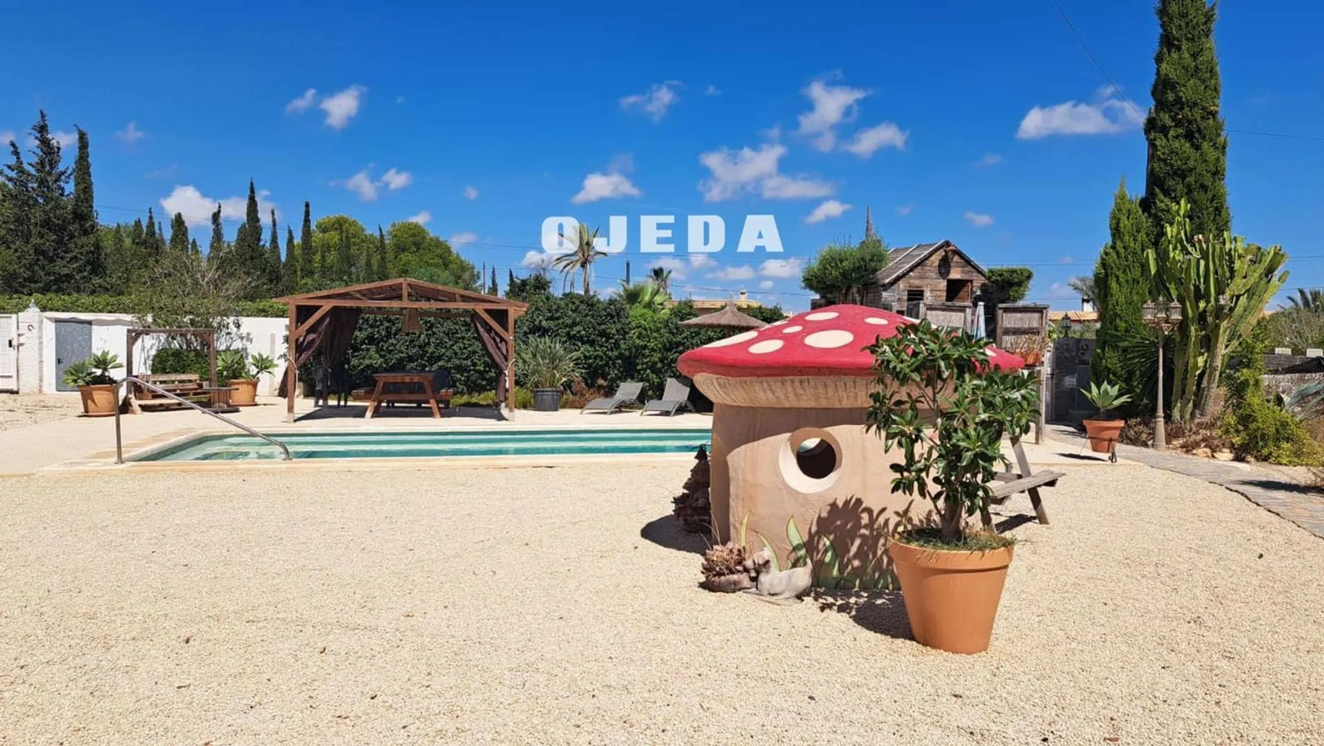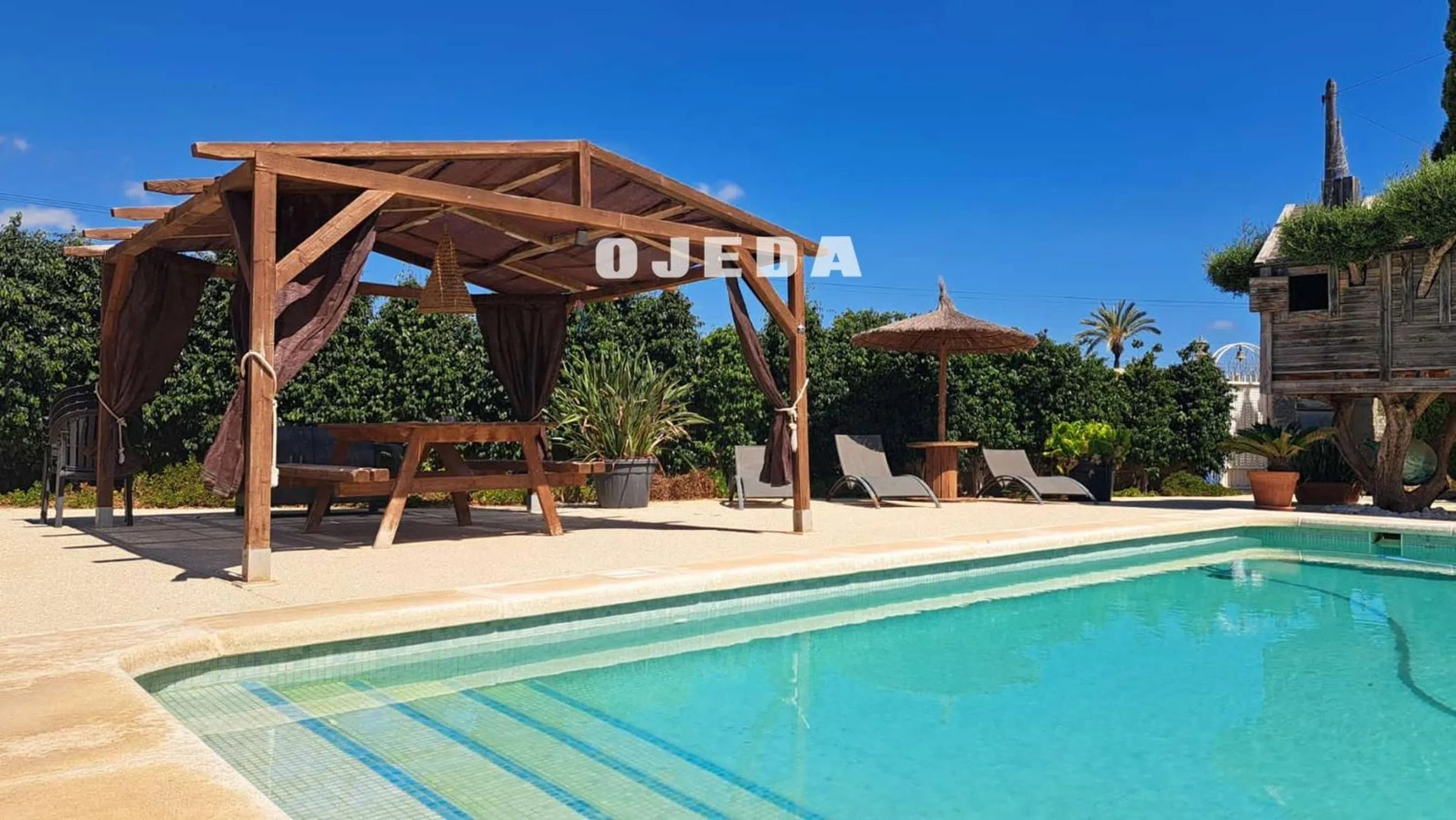 Precioso chalet situado a pocos metros de Elche, Alicante, Santa Pola. Consta de 3 dormitorios, 2 baños, cocina, gran patio con barbacoa y lugar de relax, garaje, zona protegida para coches, piscina, gran casa independiente con jardín para invitados. Su pardela es de unos 2.000 metros cuadrados. La casa tiene una bonita distribución que es muy confortable al estar todo situado en el mismo nivel. Tiene zonas exteriores con un gran pino y vegetación para que la estancia en los meses de calor sea más llevadera, sus varias pérgolas exteriores y en zona de piscina lo hacen de lo más agradable. A destacar que es una urbanización donde se vive todo el año, estando acompañado de otros residentes. Un gran lugar donde instalarse.