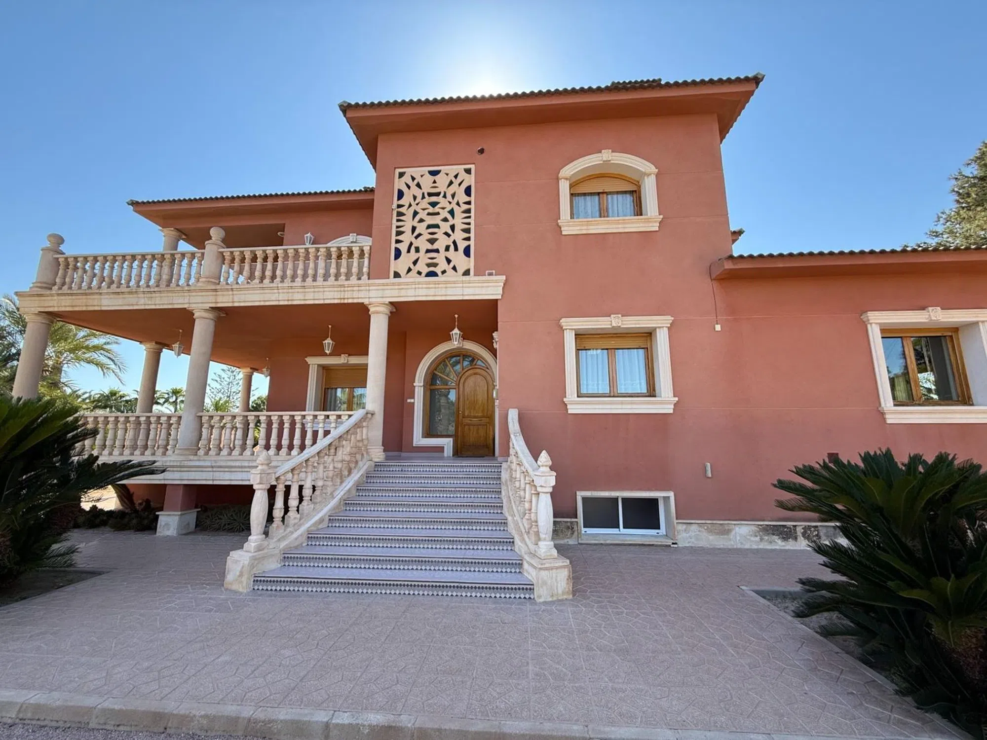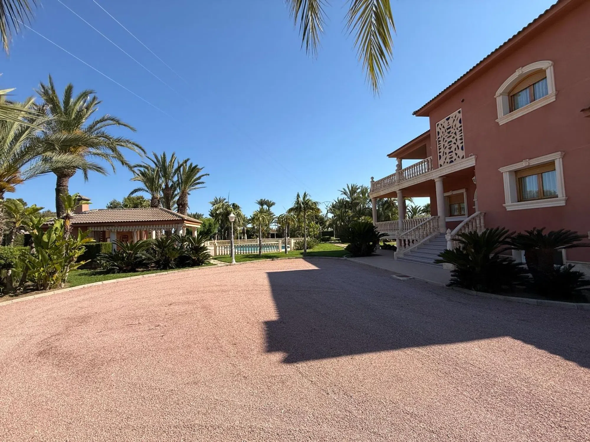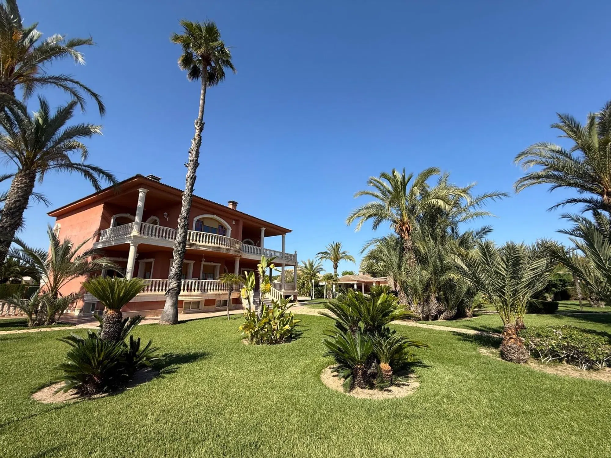 REF: GV-130. Ginta Veisa properties les presenta este espectacular chalet de lujo urbano en Elche, zona Valverde a solo 10 minutos de la ciudad y de las playas de Santa Pola. Destaca por su gran parcela de 7498 m2 con unos impresionantes jardines con césped, olivos, palmeras que rodean su fantástica piscina con forma de riñón, además cuenta con un lago de piedra con un puente de madera. Una barbacoa bastante grande cubierta para celebrar cualquier tipo evento. Además de su gran terraza de 30 m2. La casa principal tiene 750 m2 construidos distribuidos en 3 plantas. La planta principal consta de un gran salón-comedor, una cocina espaciosa, una acogedora sala de estar y Además, cuenta con tres dormitorios, dos baños. Sótano impresionante con capacidad para hasta 5 vehículos y un amplio trastero. La planta superior encontramos una vivienda totalmente independiente con tres amplios dormitorios, dos baños, un salón-comedor, una sala de estar, una cocina independiente, una galería y una gran terraza con vistas panorámicas impresionantes. Dispone de aire acondicionado centralizado con bomba de calor, calefacción central por gasoil, carpinterías exteriores con doble cristal y cámara de aire, pavimento de granito italiano con acabado cristalizado, paramentos acabados en pintura lisa, etc.. . La casa esta conectada al alcantarillado municipal, tiene un deposito de agua de riego bajo rasante de 100 m2 x 5 m de alto todo ello por contador, agua de la red municipal, agua sanitaria en la casa, deposito de agua para la casa de 3000 litros, un acuífero pinchado con brocal de piedra y sistema de riego por goteo instalado. ***Este anuncio puede contener errores. La información se muestra a título informativo, no comprometiendo contractualmente a Ginta Veisa Servicios Inmobiliarios. Tanto los datos, como las imágenes y planos pueden estar sujetos a cambios, por lo que le invitamos a que, si precisa una información más exacta y detallada, comprobar datos, así como situación jurídica de los inmuebles, contacte con nosotros y le atenderemos a la mayor brevedad posible. Gastos de compraventa e impuestos no incluidos en el precio publicado. ¡LLÁMENOS PARA AMPLIAR LA INFORMACIÓN!
