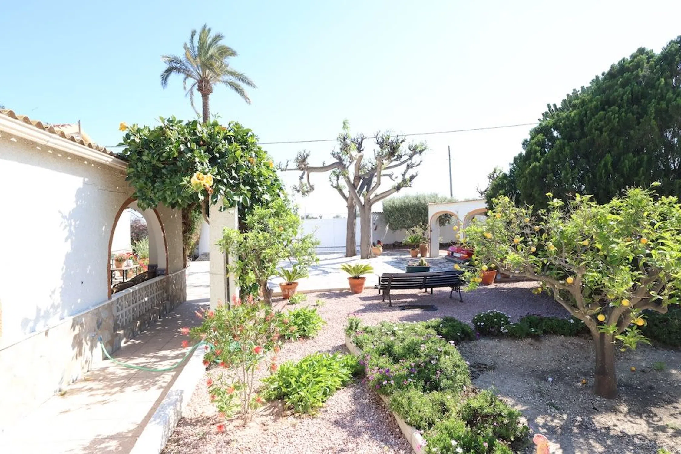 Sueño mediterráneo – ¡Exclusiva finca a solo 400 m del mar! La Marina | 5 dormitorios | 3.086 m² de parcela | Potencial de ampliación | Privacidad absoluta ¡Bienvenido a su nuevo paraíso en la Costa Blanca! Esta finca excepcional en La Marina combina encanto mediterráneo, tranquilidad y cercanía inmediata a la playa: solo 400 metros lo separan de la arena dorada y el mar turquesa. En una amplia parcela de más de 3.000 m², rodeada de palmeras y árboles frutales, disfrutará de total privacidad y un paisaje natural de ensueño. La encantadora casa principal (construida en 1960) se distribuye en una sola planta y ofrece 5 amplios dormitorios, 2 baños totalmente equipados y un aseo de cortesía. Una gran cocina independiente y un luminoso salón-comedor con acceso directo a la terraza cubierta con zona de barbacoa crean el ambiente perfecto para relajarse y disfrutar de agradables veladas. Más espacio, más posibilidades: Una ampliación adyacente sin terminar ofrece la posibilidad de añadir hasta 4 dormitorios y 4 baños adicionales, ideal para invitados, alquiler vacacional o incluso como un pequeño hotel rural con encanto. Otras características destacadas: •Aire acondicionado •Sistema de alarma •Aparcamiento cubierto para 2 vehículos (ampliable) •Parcela en zona protegida sin posibilidad de nuevas construcciones: garantiza exclusividad y estabilidad del valor Ya sea como residencia permanente, elegante casa de vacaciones o proyecto turístico rentable, esta finca representa una oportunidad única con gran potencial de desarrollo. Resumen: •Parcela: 3.086 m² •Superficie construida: aprox. 315 m² •Año de construcción: 1960 •Estancias: 5 dormitorios, 2 baños, 1 aseo •Extras: terraza, barbacoa, aire acondicionado, alarma ¡No deje pasar esta oportunidad! Concierte ahora su cita para visitarla y descubra lo mejor del estilo de vida mediterráneo.