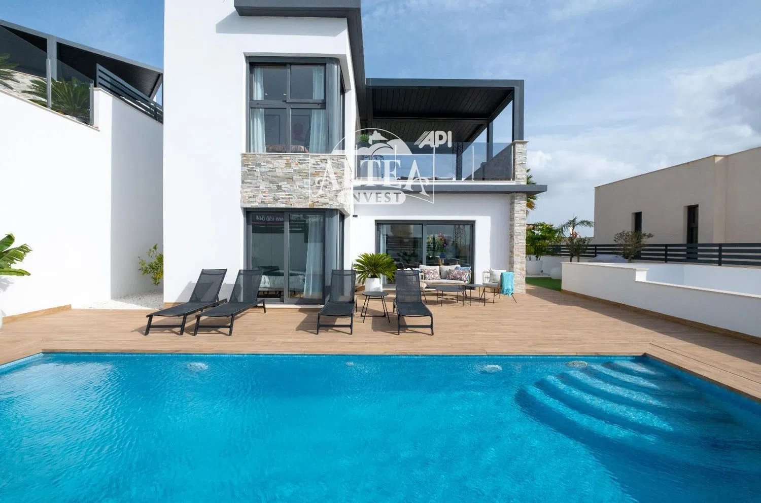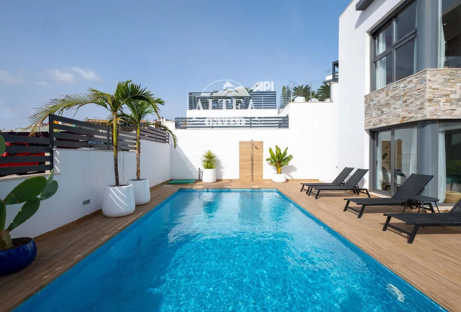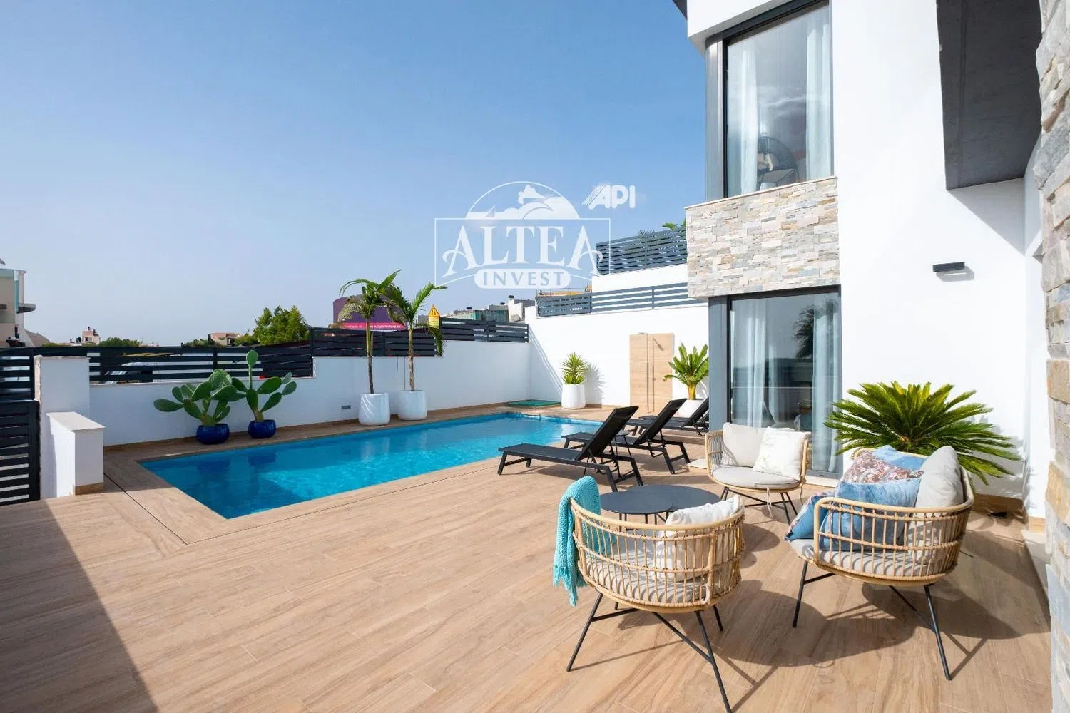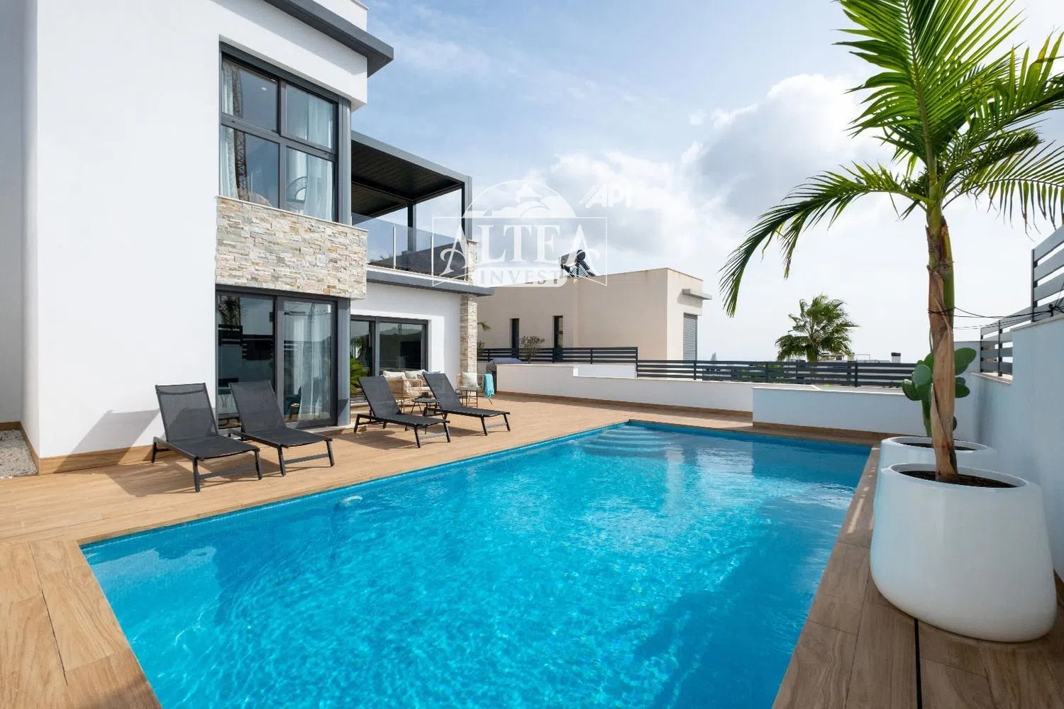 Set on a generous 400 square meter plot, the property features a stylish pool enveloped by beautifully landscaped gardens, providing the perfect oasis for relaxation or social gatherings with family and friends.