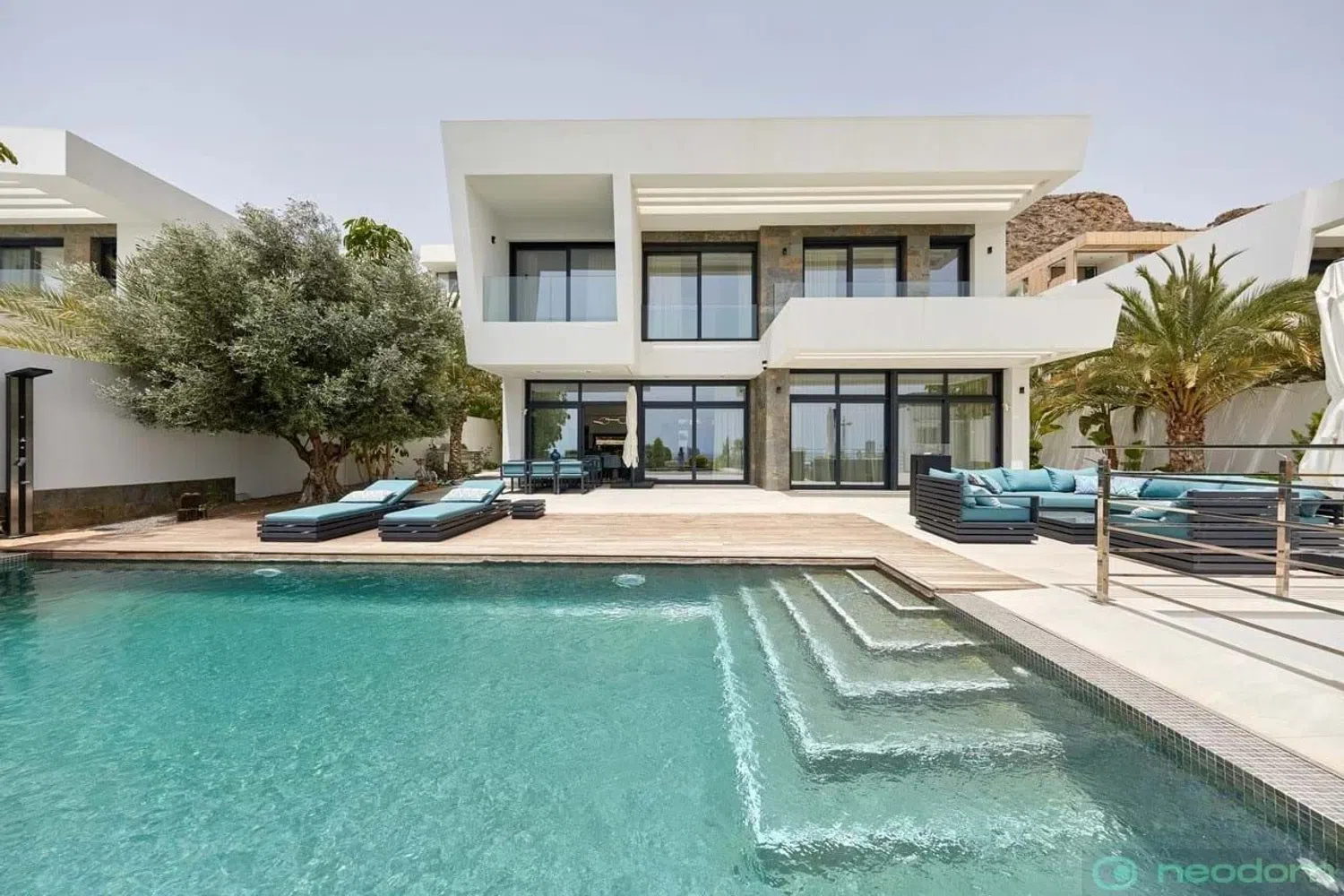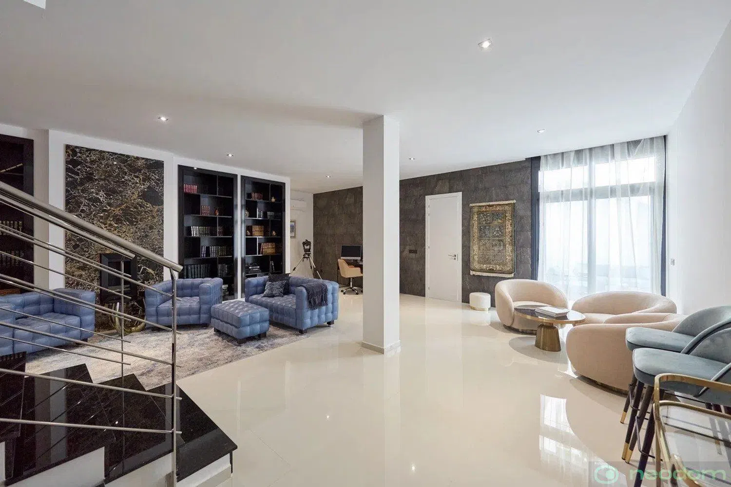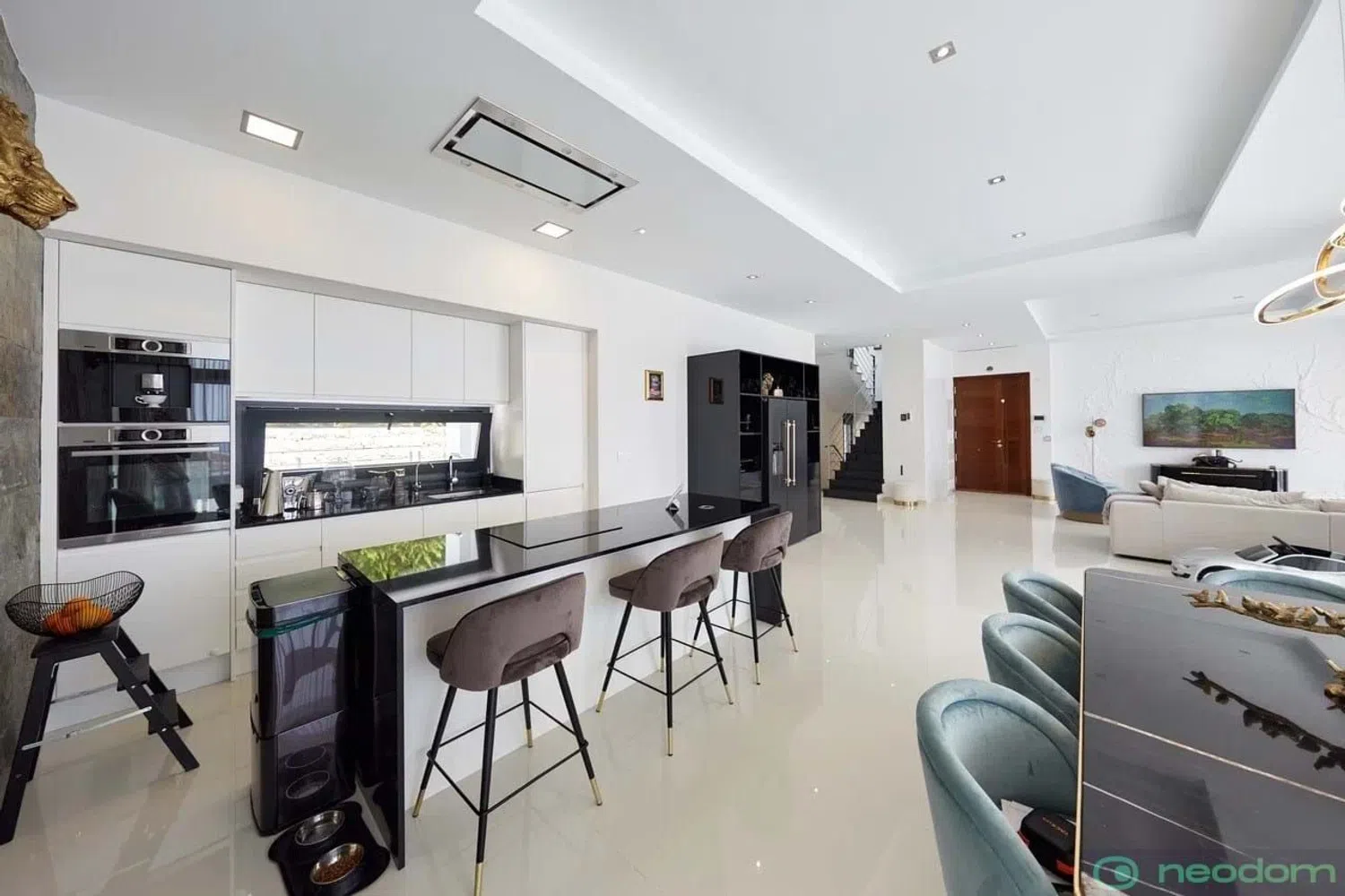 The villa is situated on a spacious plot and encompasses a generous built area. Inside, it offers a fully equipped open-plan kitchen, five inviting bedrooms, and six modern bathrooms, along with a private swimming pool. Advanced home automation systems control various features such as air conditioning, underfloor heating, outdoor and indoor lighting, and window shutters. Additional highlights include solar panels, comprehensive smart home technology, a gym, a library with biochemical capabilities, a laundry room, and a separate dressing area.