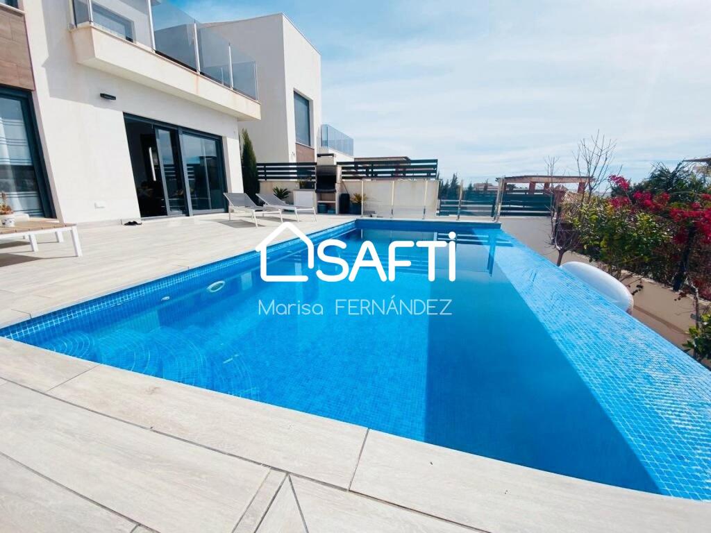 The ground floor includes a spacious living-dining area, an open kitchen, a guest restroom, a storage room, and an office. Both the living room and one of the bedrooms provide direct access to the terrace and infinity pool, ensuring a seamless indoor-outdoor flow. The gourmet kitchen, outfitted with state-of-the-art appliances, is truly a highlight. On the first floor, you'll find two bedrooms, one of which includes an ensuite bathroom and a private terrace, along with a stylish additional bathroom. Each bedroom is equipped with built-in wardrobes, and the outdoor area features a garden complete with a barbecue and automatic irrigation system.