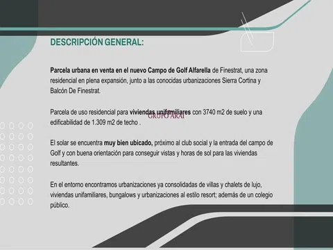 Exclusivo terreno urbanizable en el nuevo campo de golf Alfarella, en una de las zonas más demandadas y con mayor proyección de la Costa Blanca. Su ubicación privilegiada, rodeada de urbanizaciones de lujo como Sierra Cortina y Balcón de Finestrat, garantiza una inversión segura y de alta rentabilidad. Características destacadas: Vistas panorámicas al mar y la montaña, con una orientación óptima para aprovechar al máximo la luz natural. Ubicación estratégica, junto al club social y la entrada del campo de golf, con acceso rápido a Benidorm, la AP-7 y la N-332. Parcela de 3.740 m² de suelo con una edificabilidad de 1.309 m² de techo, ideal para el desarrollo de viviendas unifamiliares exclusivas. Entorno consolidado, rodeado de chalets de lujo, villas, bungalows y urbanizaciones estilo resort, además de un colegio público. Precio: 1.500. 000 €. Una oportunidad excepcional en una de las zonas con mayor crecimiento y demanda. Para más información, contacta con nosotros.